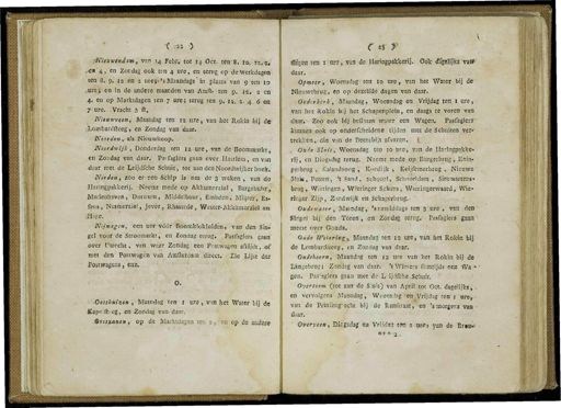 • t ja > iNituweudavt , van 14 Febr . tot 14 Oct . ten-g . ia . I4 .- 2 . t«M"4 , en Zondag ook ten 4 ure , en terug op de werkdagen ten 8 . o . 12 en | urea's Maandags'in plaats van 5 ten- 10 *« r §.} en in de andere maarden van Amft . ten g . i-s . 2 en 4 . en op Marktdagen ten 7 ure ; terug ten 9 . 1 ». 2 . , 4 . ó ea 7 ure . Vracht . 3 ft . Nieuwvee », Maandag ten 12 ure , van iet Rokin - bij de rLombardfteeg , en Zondag van daar . Noorden , als Nieuwkoop . Neordwijk ; Donderdag ten ia ure , van de Boommarkt , en ZoDdag van daar . Pa;fagiers gaan ever Haarlem , en van . daar met de Leijdfehe Scbuit , tot aan denNoordwijker hoek . Nor dest , zoo er- een Schip is om de 3 weken , van de Haringpakkerij . - Neemt mede op Akkumerziel , Bargebubr , Marienbaven , Dornum , Middelbuur , Embden , Mïïjrér , Es- fens , Nesmcrziei , Jevér , Rhastede , Wester-Akkumerzie'l en ; Hage . Nijmegen , een uur vóór Boomklokluidén , van den Sin- gel voor de Stroomarkt , en Zondag terug . Pasfagiers gaan over utrecht , van waar Zondag een Postwagen afrijdt , of met den Postwagen van Amfterdam direct . £ ie Örjtt der Postwagens , enz . O . • OesthuiztB , Maandag ten 1 ure , van het Water bij de Kapeift . eg , en Zondag van - daar , ^ istjtaiten ,- op de Marktdagen ten s , en op de andere V f ai } % Slgen ten i'-nrc , van de Hariogpakkerij . Odk-cfêgelijky'va !*' daar . Opmeer , Woensdag ten 10 ure , van het Water bij de Kien webrug , en op dezelfde dagen van daar . Ouderkerk ', Maandag » Woensdag en Vrijdag ten 1 ure , van het Rokin bij het Schapenplein , en daags te voren van daar . Zoo ook bij befldten water een Wagen . Pasfagierr ' kunnen ook op onderfcheidene tijden met de Schuiten ver -' trekken , die van de Bee'rebijt afvaren . J K - OÜde Sluis , Woensdag ten 10 tire , van de Haringpakke * rij , en Dingsdag terug . Neemt mede op BtVrgerbrug , Etiin- gerbrug , fialandsoog , Koedijk , Keijfemerbrug , Nieuwe '■ Sluit , Petten , ' t ' Sand , Schoor !, Schnörldam , Sintraartens » brug , Wiéringen r Wferinger S.cbans , Wteringerwaard , Wie- weger ' Zijp , Zwidtvijli en Schagerbrug .- Oudewater , Mandag , '« namiddags ten 3 ure , van den : Strjgel bij den Toren , en'Zór-dag terug .- Pasfagiers gaan meest over Gouda . Oude Wetering^Mzxti&xg ten 12 ure , van het Rokin bij de Lombardfteeg , en Zondag van dsar . Oudshoorn , Maandng ten 12 ure van het Rokin bij de : Kngebrug ; Zon'dsg van daar . ' tWimers fomtijds een vVa *■ ■ gen . Pas f agiers gaan met de L ijclfche Schuit . Overtoom ( tot aart de S'uis ) van April tot Oct . dagelijks , . en vervolgens Maandag , Woensdag - en^Vrijdag - en 1 ure ) van de Prinièng-acbc bij de Runftraat , en ' 4 morgens van ■ daar . Oferyeen , Btogsdag ea Vrijdag tol 2 ure , yan de Br »»« ' M * * - a -