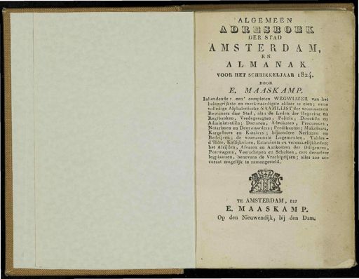 ' ALGEMEEN DER STAD AMSTERD A . M , E N - A L M A N A K .' VOOR HET SCEIRIRKELJAAB 1824 . DOOR E . MAASKAMP . Inhoudende : een ' completen WEGWIJZEH van bet belangrijkste en merkwaardigste alilaap te zien ; eene volledige Alphabetisclie N AAMLUST'der voornaamste Bewoners dier Stad , als : de Leden der Regering ea Reglbanken , Vredegeregtea , Policie , Direction eu Aduainistiatife'u : Doctoren , Advokaten , Procureurs Notarissen en Deurwaarders ; Predikanten ; Makelaars , Kargadoors en Kassiers ; bijzondere Neringen ca Bedrijven ; de voornaamste Logementen , Tables -* d'Hóle , Kofiijhuizen , Ëslamiaels es vermakelrjkheden- het Afrijden , Afvaren en Aankomen der Diligences , Postwagens , Veerscbepen en Schuilen , met derjelver legplaatsen , benevens de Vrachtprijzen ; alles 200 ac- curaat mogelijk te zamengesteld . te AMSTERDAM , bit E . MAASKAMP . Op den Kieuwendijk . bij den Danw
