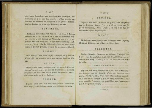 m I 36 >, ssïjn ,. o*er Rotterdam , met den fiedelijken Postwagen , £ fe ■ ' s morgens ten sue van daar vertrekt ; of het gelieele jaar door met de Amwerpfche Diligence's of de groote Brieve ». - maal tot Breda , van waar eene Diligence vertrekt . , BENT HE I M ,. Zondag en Donderdag over Naa,*de.n , vm waar ' s Zomer » ' s.avosds ter . 8 en ' s Winters ten 7 « re de Hamburger Wa ,«. gen vertrekt , die Zondag en Woensdag ten 2 a 3 ure '« nachts van d>ar tetug gaat . Vracht naar Bentheim ƒ ioyS . en tetug ƒ 8 :?,. Nfi . Te Oklenzaal ., z'jnde de eerfta plaats buiten de Nederi . grenzen , woiden de goederen gevilitesri , B . O M JM E L . Over Utrecht -, van waar Vrijdag ' s morgens ten 9 nre een Wagen rijdt , en V winters ten 6 ure met den Bosfcher Wa- ei . BRED A .^ Dagelijks vice verfa , ' s morgens ten 4Ute , jner.de Utrechts . fche , en ' s avonds terj 9 . ure met de Brusfel^lie of Gcntfche . Diligences , en ten 8 ure met de groote Brievenmaal . Vracha yan , eenden , ander 10 a 1.1 Oldens . B . R U G G E . DageHjts over Gent , van waar ' s morgens en ' s namiddags , eer,e Barge , en Jjij.,bdle-ien , water etne^Djligence i$grtrekfe f fr >" BRUSS El , Dagelijks vice verfa , V avonds ten 9 urey eene Dilfgenee ; Tan het ; Rusland . Vracht ■ ƒ 16 : iö , of ten 8 ure met de groote Brievenmaal . Vrac ƒ 18 ;., of ten 8- ure van de Botenmarfet bij het Reguiier-splein , DELFT . 3$J7„befioten water dagelijks « en Postwagen over üéijdea ^ : ® f met de Diligence van ' sHage op Rotterdam * DEV ENTER . Zondag , Dingsdag , Woensdag en Vrijdag , ' srnorgsris*i ®» 6 ure , van . den^Amftel en hoek,van de Amftelflraat , en te zelfden tijde terug . Vracht ƒ 8 : ia , of dagelijks over Hat » a ; m OR D R E C H T . - sSjflrf ; '' H a » iTOjai'iV x •■ ■> Dagelijks vice verfa ' s avqnd_s ten 9 ure , niet de Antwerp ** fcfce Diligence van het Rusland , of met de Gentfche Dili » ^ gflce^Vracbt ƒ 7 '•* •• Oqk > jroor éê $, pe^bon.;?sa®ö^asS ' jen 8 ure met de Ppstkar ƒ. 4 ;- of over Rotterdam , vag waar . dagj$ks > ' s morgens en ' s namiddags een Pqstw^ggj^H i^^den perfooB,,ajfjt)jdt . . lm !. 1 '