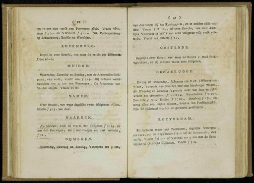 Sr sen-10 mr e vice verft:een Postwagen rijdt '. Vf acht ' ■'$%&- niers ƒ 3 : i •> en ' s Winters - ƒ 4.1a -, NB , Correspondeert *.' e § Brandenburg , Berlijn en Westfalen . LU XEMBMC ' Dagelijks over Brusfei , van waar de vrscht per DIlïgerKfcp /? 2o;i8-is . MtfIDE W Woensdag , Zarurdag en Zondag , met de ArttfremfcheDiH- - gSJice , vice verfê ,■ vracht enz . ƒ 2:4 . Bij befloten water ? namiddag ten 2 ure een Postwagerr -, die ' s morgens van 1 SVtuiden afrijdtw Vracht il ft . '■ ££ A MEN . Over Brusfel , van w^ar dagelijks twee.Diligences*n/cfóif :. yracht ƒ 5:5- van daar . Als ^ VÏiJfl'd<!f»'j . doch de vracht der Diligence ƒ a • 14 - eir i ate't ' den Postwagen , die 1 uur vroeger van daar vertrekt ., . ƒ>»■• " ,-. poe8sdag 4 Zatuïdag en Zondag , ' s morgens tea 5 iOtt&'j C 41 5 *- V*n den-Singel bij het Koningsplein , en te zelfden tijde - via -, daar Vracht ƒ 8:10 -, of over . Utrecht , van waar dage- lijks V- morgen , te half 8 ure eene Diligence vife verf * ves >. trekt . Vracht van Utrecht J 5 :-. O . O S - T E N D E « Dagelijks over Gent , van-waar de- Barges s maal tlaagS-s Wtrekken , en bij befloteH water , eene Diligence , . O S N A B E . V G G E ;. Zordag en Donderdag , ' s Zomers ten , 8 en ' s Winters-ten -■> 7- ute , ' s avonds van Naarden met den Hamburger Wagen ,.. die Dingsdag en Zaturdag ' s avonds weer van daar-vertrekt . Vracht tot Amersfoort -/ i:n:4 - Voorthuizen fs:io -.~. Deventer f 5 j - Delden ƒ 7:10 - Osnabrug ƒ 15 :- « 1 terug alles een vijfde minder , behalve het Postüjqnsjeld .. NS . Te Oldcnzaal worden de goederen geviüteerd , , ROTTERDAM .'. Bii-befloten water een Postwagen , dagelijks ' s morgen . § ,„ 8«.e,v.n de Regu'iersbreêlmt bij " de Botermarkt , vice s W flU . Vracht ƒ 6 : a - of ' s avonds ten 9 ure met de Bint . -