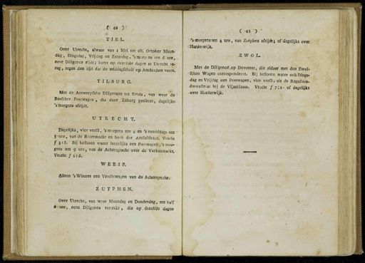ivmseaassf - $ 4 * )> | i Tjl E L . Q*er Utrecht , alwaar van i Mei tot uit .' October Maan- dag , DiDgsdag , Vrijdag , en Zaturdag , Vroon *, ns ten 6 ure , « ene Diligence rijdt ; kotet op dezelfde dagen te Utrecht te . - rug , tegen den tijd dat de middagfchuit op Amfterdam vasm T I M URG , Met de Antwerpfcho Diligences tot Breda , van ' waar de Bösfcher Postwagen- , dia door Tilburg pasfeert , dagelijks ; Vmorgens afrijdt . UTRECHT . Dagelijks , vice verfit , ' s morgens ten 4 en ' s namiddags ten ' S-ure , van de'Botermarkt en hoek der AmfleMraat . Vracht ƒ j:8 . Bij befloten water insgelijks een Postwagen- j'smor»-gens ten o ure , van de Achtergracht over de Varkenmjtkt . Vracht ƒ 2 ; 67 WEES P . Alleen ' s Winters een Vrachtwagen van de Achtergrschtr Z U T P HE N ;- Over Utrecht -, van waar Maandag en Donderdag , ten ha'f ' ê- tme <, eene . Diligence , vertrekt , die op . dezelfde dagen C 45 ) * '•' s-morgensten 4 ure , van Zutphen afrijdtJ ofidagelijks over : Harde ; wijk . Z WOL . Met de Diligencejop Deventer , die aldaar met den Zwol . fchen Wagen correspondeert . Bij befloten water ook Dings . dag en Vrijdag een Postwagen , vice verfü , uit de Reguliers . dwarsftrsat bij de VijzeWraat . Vracht ƒ. 7 ;». of dagelijks ■ over Harderwijk .