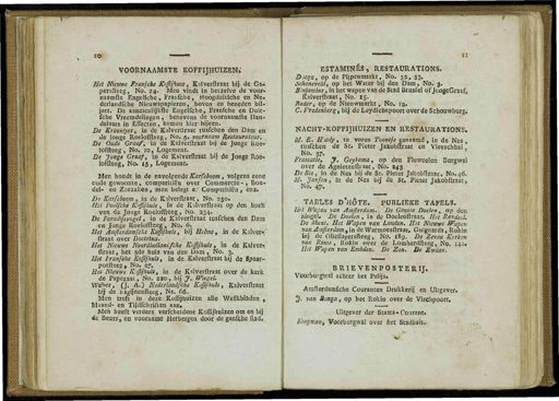 10 VOORNAAMSTE KOFFIJHUIZEN » Het Nhuwe Fran/che Koffijhuis , Kalverftraat bij de Ga » persfteèg , No . 24 . Men vindt in hetzelve de voor- naamfte Engeliche , Franfclie , Hoogduitlche en Ne . derlandfche Nieuwspapieren , boven en beneden bil- jart . De aanzienlijkfte Engelfche , Franfche en Duit- fche Vreemdelingen , benevens de voornaainite Han- delaars in Effecten , komen hier bijeen . De Kroontjes , in de Kalverftraat tusfchen den Dam en de Ipnge Roeloffteeg , No . 5 . yoornaam Restaurateur . De Oude Graaf , in de Kalverftraat bij de Jonge Roe- loffteeg , No . 10 , Logement . De Jonge Grxaf , in de Kalverftraat bij de Jonge Roe- loffteeg , No . 15 , Logement . Men houdt in de navolgende Karfeboom , volgens eene oude gewoonte , comparitiën over Commercie -, Boe- del- en Zeezaken , men belegt e ; Comparitiën , enz . De Kjarfeboom , in de Kslverftraat , No . 230 . Het Poolfche Koffijhuis , In de Kïlverftraat op den hoek van de Jonge Roeloffteeg , No . 234 . De Paradijsyogel , in de Kalverftraat tusfchen den Dam en Jonge Roeloffteeg , No . 6 . Bet Amfterdamfche Koffijhuis , bij Helms , in de Kalver- ftraat over Doctrine . Het Nieuwe Noordhollandfche Koffijhuis , in de Kalvert ; ftraat , het 3de huis van den Dam , No . 3 . Het I'ranfche Koffijhuis , in de . Kalverftraat bij de Spaar - potfteeg , No . 27 . Het Nieuwe Koffijhuis , in de Kalverftraat over de kerk de Papegaai , Ne 290 , bij J . Wiegel . Weber , ( J . AO Nederlanifche Koffijhuis , Kalverftraat bij de bagijnenfteeg , Ns . C6 . Men treft in deze > Koffijhuizen alle Weekbladen - Maand- en Tijdfcbriften aan . Men heeft verders verfcheidene Koffijhuizen om en bij ie Beurs , en voorname Herbergen door de ganfche ftad . ESTAMÏNÉS , RESTAÜRATIONS . Doeax , op de Pijpenmarkt , No . 33 , 33 . SchoneveUt , op het Water bij den Dam , No . 3 . Emjamint , in het wapen van de Stad Brusfel of JonceGraaf , Kalverftraat , No . 15 . Rtder , op de Nieuwmarkt , No . 12 . C . Fredenberg , bij de Leydichepoort over de Schouwburg .' NACHT-KOFFIJHUIZEN EN RESTAÜRATIONS . M . E . Hjady , te voren Toontje genaamd , in de Nes tusfchen de St . Pieter Jakobffraat en Vleeschhal No . 37 . Frascatie . J . Geyiama , op den Fluweelen Burgwal over de Agnietenftraat , No . 243 . DeBie , in de Nes bij de St . Pieter Jakobflraac , N0.46 . M . Janfen , in de Nes bij de St . Pieter Jakobftraat , No . 47 . TABLES D'HOTE . PUBLIEKE TAFELS . Het Wapen yan Amllerdam . De Grooie Doelen , op den Singel . De Doelen , in de Doelenftraat . Hei Rondeel . De Munt . Het Wapen van Londen . Het Nieuwe Wapen var . Jmjlerdam , in de Warmoesftraat . Guignards , Rokin bij de Olieilaeersfteeg , No . 189 . De Zeven Kerken van Rome , Robin over de Lombardfteeg , No . 1+1 . Het Wapen van Embden . De Zon . De Zwaan . BRIEVENPOSTERIJ . Voorburgwal achter het Palijs . Amfterdamfche Couranten Drukkerij en Uitgever . 2f - van Uonga , op het Rokin over de Vischpoort , Uitgever der Staats-Courant . Koopman , ' Voorburgwal over het Stadhuis . 1wt \