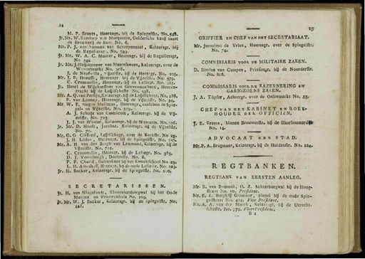 M M . P . B>ant «, Heerengr.-bij de Sp1esef de Brouwerij de banu No . 6 . Mr . P . J.-van iNaatnen van Scherpenzeel , " Keizersgr.ïbtj de Reguliers ;;". No . - ss ). Jr . Mr . W . A.C . Munter , Heerengr . bij de Reguliersgr , No sga.J Jr . Mr . J.Ilugdecoper van M»arsfeveen,'Iieizcrsgr . over de Wcstermar-kt No . 308 . J . de Neufville , VyzeHtr . bij de Heeregr . No . 105 . Mr . j . P . Hoeufft , Heerengr . bij de-Vy'zelftr . No . 579 . C . Croffltoélin ., Heere.qgivby de Leliegr . No , 315 . Jt . Henri de . Wflckerfloot van Greveninachein , Heerèti » Kracht bg de L&üdfcheftr . No . ^ 38 . Mr . A . Q.van Perfijn,Keizersgr . by lieLeüdfchesr . No . 188 , P . van . Lennep , Heerengr . b(j de Vijzelftr . No . 50 . Mr».W . JJ , Mogse Muilman , Heerengr .; tusfciien de Spie » gel - en Vfl-zeKir . No . 559.'- A . J . Schujjt van Castricum , Keizersgr . bg de VjJ = , zëi&r . No . 713 . J . J . van Winter , Keizersgr . bü de Western ). No ., ' 06 ; Jr . Mr ! O . Hooft , Jacobsz . Keizersgr . by de . Yjjzelftr ; - No . 70 . Mr . G . G Clifford , Ldjdfcbegr . over de Kerkftr . No 23 . J . H . Luden , Heerengr . bij de Spiegelftr . No / &&, Mr . A . H - van den Bergh van Lexmond , Keizersgr . bade ' ' VJJzelftr . No . 7*2 . C ,. Crommeljn , Heeregr . bjj de Leliegr . No . 385 . D . J . Voombergh , Doelenftr . No . 6 . P . P . Ghadé , Buitenkant by het Kweekfchool No . 23 , la H . Ainishou ", Heerear . by de oude Lelieiir . No . 343 . Jr.H . Backer , Keizersgr.Bg de Spiegelftr . No . ico . SECRETARISSEN . Jr . H . van Stingelandt , Kloveniersburgwal bg het Oude Mannen en Vrouwenhuis No . 109 . Jr , Mt . W . J . Backer , Keizersgr . bg de Spiegelftr , No ; GRIFFIER , en CHEF van het SECRETARIAAT . Mr . Jeronimo de Vries , Heerengr . over de Spiegelftr^f , No . 74 . COMMISSARIS voor DB MILITAIRE ZAKEN . Bi Birrius van Campen , Prinfen^r . bjj de Noorderftr . . No . 8c6 . COMMISSARIS voos . r>E KAZERNERING « g GARNIZOEWS ZAliEN . J . A . Töpfer , Aehtergr . over de Osfemnarkt No . 55 , CHEF van het KABINET en BOEK- HOUDER B E R . O F F I Clë N . T . E . Krants , binnen Brouwerftr . bif de Ilaarlemraerdfk No . 14 . ADVOCAAT DBH S TA D . fifr.P . A . Brugman », Keizersgr , bg de Huidenftr . No . 324 » R-BGTBANKENi $%. REGTJ3ANK van EERSTEN AANLEG . Mr - B . van Bommel j O . Z . Achterburgwal bg de Hoog » ftraat Ka.- 50 . Prejïdent . Mr . E . B : Buïgklij Günrmef , Singel bjj de oude Spie - gelftraat No , 42a . Vice Prefident . Kr^A . A . van der Marck , Keizersgr . bij de Utrecht - fcheftr . No . 273 , Vhe-l'reRdenu B 2 EM