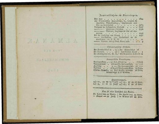 Jattttellingèn tn Ft'eitdttgeti . Het Jaar i8a 4 oer Christelijke Jaartelling , is , volgens de Joodfche Tijdrekening , beginnende met { den 23 September | 5585 Volgens de Juliaanfche Periode .. 6537 nieuwere,Grieken .. Turken , beginnende den 26 Au - 733 * 1240 gustus Na de ? ticbring van Rome 3577 Herfrelling van Nederland en de Aankomst van Z . K . II . . „ Vereen der 17 Ned . Piov . enz . .'. 9 Ck'ronoiogifche Cirkels '. fie Zonnecirkel is . 13 De Epactav ' l '!?'-*. ' . -.^' o De . Zondagsletter ,! D . C . De Maancirkel of het Gulden Getal . 1 De Romeinf . Indictie ia Bewegelijke - Feestdagen . Scptuagefima . 15 Feb.lpinkUer . 6 Tmiïi 13 17 Vastenavond , aMaart ff . Drievuldigb . Aschdag . 3 H.Sacramemsd . , lalehen .- iMprillKniisverhcfHng . 14 Sept . canst . Hemelv . 27 Mei Eerfte Advent . a8 Nov . Vleeschtjjd is 6 Weken . Quatertempers . * 0 10 , 12 en i 3 Maartj 3 .) Ig l ? en ] 8 s - 3.3 9 , 11 en i2 Junö [ 40 13i f M l8 D PJ ; ya ? ii!L\ti & Getijden jfis Jaars . De Lente beg . ai Maart . I De Herfst bes . 3 , Seor - Zomer — aa jjrfj . | | wimer . J ; « «£■