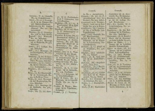 B . Bolenius , ( F . A .) Raamflr . No . ip . Commisfionair . Bosch , ( G . en J .) Rozengr . Z . Z . in de Blaausve En- ge !. Suikerraffinadeurs . Borghorst , ( A . H .) Linden- dwarsstr . No . 21 . Ta- bakswinkel . j Bottrop , ( J.J .) Keizersgr . No . 556 . in Felix Mentis , gpuhoff , ( G .) Wolvenftr . No . 20 . Makelaar . Boursfe , ( J . G .) Heerengr . by ' de'Huidenftr . No 500 . Makelaar . Bouvs'j ;( F .) . Leliegr . No . g4 > Makelaar . Brak , ( A .) Heerengr ; by het Koningplein , No . 101 . Makelaar . Braskamp , ( J . M .) Keizers- gr . by ' de Groenlandfche Pakh . Noj 415 . Makelaar .' ■ Broekman , ( J . (^ Kalver- ftr . bij het Klooster , . J$p -, s 113 . Schoenmaker.- Brugman , fgO ' Looijersgr . No . 4 . Brune , ( A . D .) Nieuwendyk by * de Oudenbrugfl . No- 53 . in Koffij en Thee . Bruyn , ( J . van ) Heerengr . by het . Koningsplein , No . 102 . jpaljelaar . Bruyn , ( J-ïi j Heereugr . by ' de Huidenftr . No . 508 , JWakelaar . Bruyn / m'z . ( C . de ) Baan - C gr . by de Pasfeerderftr . in de 5 Gebroeders . Sui-kerrafflnadeur . Bruyning , ( B . - J .) o . Z . I Voorburgwal ' by de Pjjlft.'ï No . 48 . Makelaar . Capellen , ( J . p . van ) Hoek j O . Z . Achterburgwal en I Gasthuispoort . Chevalier & Comp . ( Frs . Ie ) Heerengracht tnsfchen de Brouwersgr . en Roomo- lenfteeg , No . 316 . Met [ primo Mei Singel btf de l Brouwersgr . No . 285 . Commisfionair op Dene » ir,arken . Cleban , ( G .) O Z . Voor - I burgwal bij den Niezel . Clee , ( G . W . Sefink ) o . Z . Achterburgwal by " de 1 Molenft . No . 96 . Mafeel . Collings & Comp . ( E .) Kei - f ■ zersgr . ' by ' den Amftel , § No . 16 . . Co'querel , ( A . L . C .) Kei - \ zersgr . by ' de Spiegèlfctf-I No . 104 . Predikant . Coster , (.) Keizersgr . by i de Utrechtfcheftraat . Coster & Comp . ( H . J .) Heerengr . bij de Utrecht - * foheftr . No . 30 . Op A - f merika. Couderc & Brants , Hee- rengr . by dei'Vy'zelftraat , Koopman , Cramer , ( J . J ) Voetboog - ftr . No . 1 . Aartspriester ^ CremerL'.'CJ . D .) O . Z . | Achterburgwal over het Rusland , No . 215 . Makel . Crombosch en L . Kemper , Singel , hoek van de Beu- lingftr . No . 472 . in Koper . Croockewk , ( H .) Lanrier- gr . No . 3 . in Berlyn . Sui- kerraffinadeur . Dam ", j^h );» Hartenftr . No . 38 . Hoeöemyinkel . Dcdert & Zoon , ( C . H .) Prinfengr . by ' de Elands- ftr . in Schokenburg . Sui- kerraffinadeurs . Demarré , ( J^tj Singel bij de Bergftraat , No ; 33Ó . Pastoor . Dilgman , ( G .) Lindenftr . No . 74 . Bakker . Dinter , ( A . £. van ) Am- ftel by de Amftelftraat , No . 71 . Dolleman , ( M .) Reguliers- plein , Med . Doet . Dresfelhuis , ( G .) Breeftr . aan de Zuider Kerk , Ma- kelaar . Dresfelhuis , ( C . F .) Gélder- fehe Kade bij de Water- poortft . No . 73 . Makel . Dubois , ( C .) Rozengr . by de Prinfengr . No . 191 . Durks , (.) Bloemgracht , No . 33 . Ebell , ( J . B ) Haarlemmer - E- F . • Houttuinen bij de Brou- wersftr . No.- 33 . Makelaar . Ebersbach , ( C . H .) Heeren- gr . bij de Lelicgr . No . 393 Hoogleeraar . Elix , ( C .) Rockin j bij de Langebrugfteeg , No . 40 . ( yMakelaar . Engelberts , ( E . M .) Kal- verfcraat bij de Takfteeg , No . 187 . Makelaar . Eschauzier , ( J . E . Bouche ) Hoek van de Heerengr . en Oude Lelieftr . N0.211 . Eyben en Fisier , ( . ) Baangr . bij de Ley'dfehe Kruisftr . Suikerraflinad . Eijben en Zoon , |( F . G .) Baangr . by ' het Ley'dfehe Plein . Suikerraffinadeui '. EjjJe -, ( J . vai O Rozengr . No . 45 . Commissionair . Fallee en Koopman , Spin- huisfteeg , No . 14 . in Wijnen . Feye , ( J .) O . Z . Voorburg- wal bij het Oudekerkspl . No . 167 . Timmermannen Makelaar . FÏ'mes , ( S . J . de ) Keizers- gracht by het Molenpad ', No . 591 . Makelaar . Flines , ( H . de ) Prinfengr . bij de Ley'dfehe Kruisftr . Fifchsr & Comp . ( C . H .) Bloemgr . en Hoek van de laatfte dwarsftraat , in de