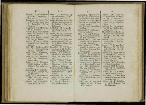 K . 1 Kleeblad , ( T . A .) Keizers- gr . bij de ' Westermarkt , No . 493 . ' 3 ^ Kloppenburg & Comp . ( W . en J .) Singel over de Ou- de Lutherfche Kerk , No . 475 . Klopper , (_ H . ) Hartenftr . No . 5 . Makelaar . Kluiver , fA .) Voorburgwal over het Stadhuis , in Garen en Lint . Klyn , ( C .) Buiten Oranje ftr . No . 23 . Bakker . Knoop , ( H .) O . Z . Voor- burgwal by de Barberftr . Makelaar . Kok , ( J .) Haarlemmerdijk bij de Mouthaanfteeg , No . 223 . Makelaar . Koler , ( W .) Bergftraat , No . 12 . Makelaar . Kolle , ( C . D ' 0 Prinfengr . over het Ara'ftelveld , Steenkooper . Koning , ( A . de ) Nieuwen- dijk by de Dirk van Has- feltfteeg , No . 208 . Ma- . kelaar . Koolhaas , Q . A _) Leijdfche- gr . bij de Keizersgr . N o . 94 . Makelaar . Koop t ( G . A .) Nieuwe Hee- rengr . over het Park , No . 71 . Makelaar . Korthals , ( J .) Spiegelplem , bij de Spiegelftr . No . 6 ". i K , L Kresf , ( J .) Prinfengr . brj de Westermarkt , No . 363 . Makelaar . Kuiper Brouwer & Rërfe Linfen , Voorburgwal ' brj de Stilfteeg , No . 223 . Kollecteurs . Kokkelmk , ( B . H . van ) Bé- gynenhof , No . 31 . Pas- toor . Kijzcr , ( M . R .) Nieuwen » Heerengr . over het Park , No . 29 . Laar , ( C . R . S . Toe ) Klo- veniersburgwal over het O . I . Comp . Huis , No . 49 . Notaris . Lamaifon , ( H . F .) Klove- niersburgwal by het Rus- land , No . 96 . Makelaar . Langen , ( B . F .) " Warmoes- ftr . over de Heintjehoek- fteeg , No . 132 . Make- laar . Lathij , ( William ) Vyzelftr . No . 14 . Opregt Engelsch Magazyn , volgens Lyst by hem te bekomen . Lemon , ( Hartog de Hartog ) Hoogftraat , hoek van de Zanddwarsftraat , Med . Doctor . Lendetdoiff , ( H . M .) Kei- zersgr . bij den Amftel , No . 10 . Commisfionair . Lex , ( F . G .) Barnefteeg , No . 2 . Kastenmaker . L . ■ Lichtervelde , ( Jonkh . Mr . F . M . J . F . de Pelichrj de ) { Botermarkt bij het R-egu- liersplein . No . 36 . Offi -| cier by de Regtbank van Eerften Aanleg . Lier , ( N . van ) Reguliers - breêflraat . Lingen , ( H . F . van ) Raamgr . No . 4 - Makelaar . Lippe s ( J . A .) Keizersgr . by de Utrechrfcheftraat , No . 76a . Makelaar . Loenen , ( W . C . van ) Bui- tenkant by de Foelieftr . No . 11 . Makelaar . Lohr , Junior , ( G . F .) War- moesftr . fchuins over de St . Janftr . No . 201 . Pas-fementwerker . Loofs , ( W . L .) Keizeersgr . tusfchen de ! Leliegr . en het Huis met de Hoofden , No . 327 . Firma , Loofs & Goeverneur . In Tabak . Lorla & Comp . , Heerengr . by de Hartenftr . No . 425 . Lotz , ( M .) Rozengracht , No . 45 . Makelaar . Luberti , < C . C .) Prmfen- hofft/eg , No . 3 . Ma - kelaar . Luber , ( M . B .) Heerengr . by de Heerenftraat , Med . Doctor. Lugt , ( G . A . van der ) Singel bij den Heiligen ■ Weg . Fastoor . M . Diïgthart , ( A .) Hoek van de LeidfehëM . en Kérk- ftr . No . 31 . Makelaar . Luijken , ( J . A .) Prinfen- ' gracht bij de Leydfche-ftraat . Luytjes , (.) Achterburg- wal by de Ouden Doe- lenftr . No . 194 . Maarfchalkenwaard , ( C . v .) Kerkftr . over de Franfche Menegie/No . 81 . Ma - kelaar . Maefen , ( J . F . van der ) Amftelftraat , No . 17 , Makelaar . Mahuet , ( J . G . van Laar ) Heerengr . by de Oude Spiegelftraat , No . 150 . Makelaar . Martens , ( J .) boek van de Keizersgr . en Leydfche- ftraat . In Brandewijn , Ge- ncver , Ponsch , Wijn en andre Likeuren . Martens , ( W . J .) Koningftr . bij Kromboomfloot . Martens , CM .) Kattenbur- gergr . bij de Parelbrug , Commisfionair . Mattos , ( J . T ) Heerengr . by den Amftel , No . 6 . Meeuwen , ( P . M.|van)Haar- lemmerdijk over de Hee- renmarkt , Noi 33 . Melius , (!■■ J .) Leydfche- gr . brj de Keizersgr . No . 88 . Makelaar .