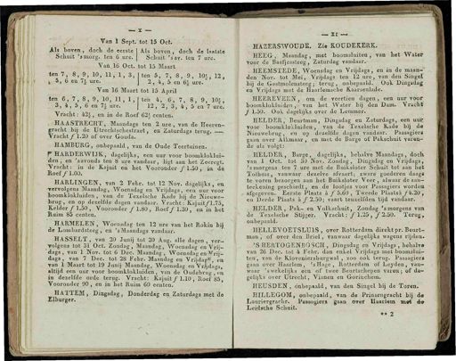 — X — Van Ï Sept . tot 15 Oct . Als loven , doch de eerste I Als boven , doch de laatste Schuit smorg . ten 6 ure . j Schuit ' say . ten 7 ure . Van 16 Oct . tot 15 Maart te = 7 > *'?' 10 ' N *] 3 . | ton 5 , 7 , 8 , 9 , 10ï , 12 , k 5 , 6 en 7j ure . j 2 , 4 , 5 en'ej ure / ' ' Van 16 Maart tot 15 April . 3 , 4 , 5,6 en 7 | ure . | 12 , 2 , 3 , 4 , ö'en 7 ure ! Vracht : 42 | , en in de Roef 62ï centen . ' H i A ^ R J C ? T T ' ^ aanda S « *« 2 ure , van Je Heeren- gracht biji de Utrechtschestra B t , en Zaturdags terug Vracht / 1.20 of over Gouda . 6 HAMBURG , onbepaald , van de Oude Teertuinen , r HARDERWIJK , dagelijks , een uur voor boomklotlut- den , en s avonds ten 8 ure vandaar , ligt aan het Zeeregt . Ttesl ^ e Kajuit eu het Vooronder ƒ 1.50 , in de«.oer ƒ 1.00 . ' HARLINGEN van 2 Febr . tot 12 Nov . dagelijks , ' en • rervolgens Maandag , Woensdag en Vrijdags , een uur voor boomkloklmden , van de Texelsche Kade bij de Nieuwe- brug , en op dezelfde dagen vandaar . Vracht : Kajuitƒ1.75 . Kelder ƒ 1.50 , Vooronder ƒ 1.80 , Roef ƒ 1.30 , en in het ttuini 85 centen . HARMELEN , Woensdag ten 12 ure van het Rokin bij de Lonibardsteeg , en ' sMaandags vandaar . HASSELT van 20 Junij tot 20 Aug . alle dagen , ver- volgens tot 31 Oct . Zondag , Maandag , Woensdag en Vrij- dags , van 1 Nov . tot 6 Dec . Maandag , Woensdagen * J- dags van 7 Dec . tot 28 Febr . Maandag en Vrijdag *? Efc Tan 1 Maart tot 19 Junij Maandag , Woensdag en VrldLs altijd een uur voor boomklokluiden , van de Oudebrug ck rn dezelfde orde terug . Vracht : Kajuit ƒ 1.10 , Roef 85 , Vooronder 90 , en m het Ruim 60 eenten . Elhut 1 e I EM ' Dinfisda £ > Donderdag en Zaturdags met de — XI —- HAZERSWOUDÉ . Zi « KOUDEKERK . HEEG , Maandag , met boomsluiten , van het Water Voor de Baafjessteeg , Zaturdag vandaar .' HEEMSTEDE , Woensdag en Vrijdags , en in de maan — ' den Nov . tot Mei , Vrijdags ten 12 ure , van den Singel ' hij de Gastmolensteeg ; terug , onbepaald . Ook Dingsdag en Vrijdags met de tïaarlemscbe Kaarsenlade . HEEREVEEN , om de veertien dagen , een uur voor boomklokluiden ,- van het Water bij den Dam . Vracht ƒ 1.50 . Ook . dagelijks over de Lemmer . HELDER , Beurtman , Dingsdag en Zaturdags , een uui ; voor boomklokluiden , van de Texelsche Kade bij de Nieuwebrug , en op dezelfde dagen vandaar . Passagiers gaan over Alkmaar , en met de Barge of Pakschuit Y » 1 '*!* - de als volgt : HELDER , Barge , dagelijks , behalve Maandags , doch van 1 Oct . tot 30 Nov . Zondag , Dingsdag en Vrijdags , ' s morgens ten 7 ure met de Buiksloter Schuit tot aan het Tolhuis , vanwaar dezelve afvaart ; zware goederen daags te voren bezorgen aan het Buiksloter Veer , alwaar deaan- teekening geschiedt , en de lootjes voor Passagiers worden afgegeven . Eerste Plaats a ƒ 5.60 , Tweede Plaatsa ƒ 4.20 , en Derde Plaats a ƒ 2.50 ; vaart - tenzelfden tijd vandaar . HELDER , Pak - en Volkschuit , Zondag ' smorgens van de Texelsche Stijger . Vracht ; ƒ 1.25 , ƒ 2.50 . Terug , onbepaald . HELLEVOETSLU1S , over Rotterdam direktpr . Beurt- man , of over den Briel , vanwaar dagelijks wagens rijden . ' S HERTOGENBOSGH , Dingsdag en Vrijdags , behalv » van 26 Dec . tot 4 Febr . dan enkel Vrijdags met boomslui- ten , van de Kloveniersburgwal , zoo ook terug . Passagiers gaan over Haarlem , ' sHage , Rotterdam of Leyden , van- waar ' s wekelijks een of twee Beurtsehepen varen ; of da- gelijks over Utrecht , Vianen en Gorinchem . HEUSDEN , onbepaald , van den Singel bij de Toren . HILLEGOM , onbepaald ,, van de Prinsengracht bij de Lauriergrachr . Passagiers gaan Oret Haarlem »#*' d « Jjerdsche Schtrit * ** 2