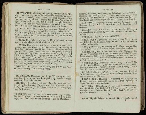 — XII —< HlLVERSUMj-&u»dag , Dingsdag .,; W&irifïdag èn'ÏWj- éags , vaneden - Amstel bij de Kloveniersburgwal , en daags te voren vandaar , doch ' s Zondags ' twee Schuiten , een ' J^prg -, ten 10 , en een ' s avonds ten 10 ure , ' swinters bij open water van 25 Dec . tot 1 Maart , Donderdags geen §£ gj$v Bij besloten water Maandag en Vrijdags een Wa- jftenV - Vracht ; 50 Centen , neemt ook mede op*Laren . , JBtfNLOQPEN , Maandags , twee uren voor boomklokluiJ tlgn , van het Zeeregt , en Vrijdag ' s morg . vandaar . Vracht : Kajuit ƒ 1.20 , Roef ƒ 1.00 , en in het Ruim 70 centen , : doch , s winters de ' Wee eerste plaatsen 20 , en hot Ruim , 10 centen meer » I HOEKZIJL , onbepaald , van de Haringpakkerij ; neemt Sede op alle plaatsen in Oost-Vriesland . HOORN , Dingsdag en Vrijdags , l§,unr voor boomklok- luiden , van het Water bij de Niemvebrug , Woensdag en Zaturdag vandaar . Vracht 85 centen . Passagiers kunnen bpi .' dagelijks over Purmerend ofi'Edam gaan -, als van 1 April tot 30 Sept . met de Buiksloter ten 6 , 8 , 9 , 1 , 2 en 4 ure , Maandag en Vrijdags ook ten 3 ure , van 1 Oct , tot 30 Maart ten 7 , 9 ,' 11 , 1 , 2 en 4 ure , en pr . Nacht- schuiten met boomklokluidcn , het'^eheele jaar door , zoo bok zes- » a zevenmaal daags terug . Vracht Van en tot Buiksloot 85 § cent , en in de Roeven ƒ 1.10J . HUIZEN , Dingsdags ten 12 ure J van het Water voor Üe Vrauwensteegi fcn Maandags terug . ï . ILPENDAM , Maandags ten 3 , en Woensdag en Vrij , dags ten 6 ure , van het Droogbak i op dezelfde dageo . Vandaar .' Vracht 35 ' centen . JOURE , . s Maandags , het uur onhep'aald , van het Wa- tefc bij de Baafjessteeg , Vrijdags vandaar . Vracht : Kajuiii ƒ 1.70 , Vooronder ƒ 1.20 , Roef 85 centen ; ook dagelijks over de Lemmer , K . KAMPEN i van 12 Febr . tot 6 Dec . Maandag , Woens- dag en Vrijdags , en vervolgens enkel Maandag en Vrij- dags , een uur voor boomUoklniden , van de Qudebrug , — Stil — z-omers , Maandag , Donderdag en Zaturdags , <? n '« winters . Maandag en Vrijdags terdgV ; - Passagiers gaan meest over Elburg of per Stoomboot . Bij besloten-water om de veer- « ÖaisdVn een Vrachtwagen van het Weespcrplem IN o . b . - KATWIJK , Dingsdag ' s morg . r van de Boommarkt , en Zondags terug . Vracht 50 centen , ook dagelijks over Leyden . KEULEN , van 15 Maart tot 15 Nov . om de vijf dagen , en vervolgens onbepaald , van den Amstel voor . het tSesr jeshuis . r KOEDIJK . Zie WARMENHUIZEN . KOKKINGEN , Maandag , en Vrijdags ten 12 ure , van het Rokin bij de Lombardsteeg , en ten 2 ure Van buiten , Vandaar onbepaald . KOOG , Maandag , Woensdag en Vrijdags , van de Ha- ringpakkerij , en op dezelfde dagen ' s morgens , vandaar . KORÏHOEF , van 1 Mei tot September Maandags ten 12 , en Woensdags ten 1 ure , en vervolgens enkel Woens- dags , zomers - Zondags en Dingsdag , en van,Sept . tot Mei Dingsdags vandaar . Vracht 50 centen : ook ' s winters met de ' sGra- vclandsche Schuit . ,, . giy ^ ROUDEKERK , Maandags ten 12 ure , van het Rokiu M de Kalfsvellensteeg , en ten 2 ure KUILENBURG , Vrijdags ten 2 ure , van den Singel bij de Schoorsteenvegerssteegj.en '» Woensdags vandaar . Pas- sagiers gaan over Utrecht . KROMMENIE , Maandag , Woensdag en Vrijdags ; tea 1 § ure , van de Haringpakkerij bij de Toren » op dezelfde dagen ' s morg . vroeg vandaar . KUINDER , Dingsdags , l r uur voor boomklokluiden , van de Geldersche Kade bij het Schipperstraatje , en Za- turdags terug . Vracht : Kajuit ƒ 1.25 , Roef ƒ 1.00 , in het Huim 75 centen . LA AREN , ah Huizen , of met de " Hilversumsche Schuit . ** 3