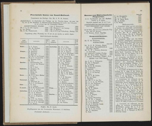 X XI Provinciale Staten van Woord-Holland . Commissaris des Konings : Jhr . Mr . J . W . M . Sehorer . Audientiedagen : te Amsterdam des Vrijdags om de Veertien dagen , des nam . ten 11/2 ure op het Raadhuis ; te Haarlem lederen Donderdag des voorm . ten IU/3 ure in het gebouw van het Provinciaal Bestuur . GEDEPUTEERDE STATEN . Joh . C . Zimmerman . 188 » Mr . J . L . de Leao Laguna . 1886 Mr . Herman J . van Lennep . 1889 A . van Stralen . 1886 Mr . A . Rendorp . 1889 Mr . F . Th . Westerwoudt . 1886 Mr . J . F . T . van Valkenburg . Buiteng . Lid . Vergadering ellcen Woensdag ten 12 are en zoo noodig op andere dagen . PROVINCIALE STATEN . KIESDISTRICT . LEDEN . KIESDISTRICT . LEDEN . Helder D . C . Loman . 1892 Amsterdam . Mr . H . J . Kist . 1892 Mr . M . Büchner . 1892 Mr . J . C . de Vries . 1892 J . C . Jansen . 1889 Mr . N . J . den Tex . 1892 Schagen H . Rezelman . ] 892 Mr . W . F . Dijkers . 1892 K . Breebaart . 1892 Mr . W . H . K . Mouthaan . 1892 A . Kaan Jz . 1889 Jhr . Mr . J . W . H . Rut Jhr . Mr . D . van Eoreest . 1889 gers v . Rozenburg . 1892 Alkmaar .. Mr . D . F . van Leeuwen . 1892 Mr . W . Baron Roëll . 1892 A . Maclaine Pont . 1889 A . D . Zur Miihlen . 1892 W . Bos . 1889 A . W . van Eeghen . 1889 Zaandam .. J . Zwaardemakei ' Dz . 1892 Mr . Aug . Philips . 1889 C . Corver van Wessem . 1892 A . C . Wertheim . 1889 J . Prins . 1889 F . J . W . H . Schmitz . 1889 P . B . J . Ferf . 1889 J . Boissevain . 1889 Enkhuizen . R . Kooijman Pz . 1892 Mr . J . L . de Leao Laguna . 1889 J . Zijp Kzn . 1892 Mr . A . Rendorp . 1889 J . Bruijn Jz . 1889 Mr . M . C . van Hall . 1889 C . Donker . 1889 Jhr . Mr . C . H . Backer . 1889 Hoorn Mr . W . K . Bar.v . Dedem 1892 D . Cordes . 1889 J . A . Heule . 1889 Dr . C . E . HeYnsius . 1889 T . Slagter Pz . 1889 A . L . Wurfha'in . 1889 Pnrmerend . S . Appel . 1892 Jhr . P . Hartsen . 1889 H . Scheringa Az . 1892 P . v . Eeghen . 1889 Mr . L . C . van Bommel . 1889 Dr . J . Teixeira deMattos . 1889 Edam F . H . Pont . 1892 Mr . J . C . de Koning . 1889 H . J . C alkoen . 1889 J . Coninck Westenberg . 1889 N.-Amstel . Mr . F . Th . Westerwoudt . 1892 Weesp Mr . M . J . van Lennep . 1892 Mr . D . A . Koenen . 1889 Mr . L . H . Povel . 1892 Amsterdam . Mr . L . A . A.van Wensen . 1892 Mr . Th . Heemskerk . 1889 Mr . E . N . Rahusen . 1892 F . N . van der Muelen . 1889 Joh . C . Zimmerman . 1892 Haarlem . .. Mr . E . A . Jordens . 1892 Mr . P . A . Brugmans . 1892 Jhr . G . F . van Tets . 1892 A . Prins . 1892 A . L . Dijserinck . 1892 Mr . F . S . van Nierop . 1892 Mr.J.F.T.v.Valkenburg . 1889 Mr . Herman J.v.Lennep . 1892 F . L . Kist . 1889 Mr . A . F . K . Hartogh . 1892 A . van Stralen . 1889 P . N . Muller . 1892 Griffier : Mr . H Jacobi . Hoofdingenieur van den Provincialen Waterstaat : J . Scholtens . Provinciale Archivaris : Bnrean voor Bnitenlandsclie Paspoorten . 0 . Z . Voorburgwal aan het Stadhuis . Ingang op de plaats . Dagelijks geopend van 10 tot 2 ure . AMBTENAREN BIJ HET PROVINCIAAL GOUVERNEMENT VAN NOORDHOLLAND . H . de Vink , Adj . - Commies ; ( alleen des Vrijdags aan het Bureau ). 3 . A . Bouman , Klerk . Dagelijks . « Semeenteliestnur . BURGEMEESTER . Mr . G . van Tienhoven . WETHOUDERS . Jaarv.aftr . Mr . B . H . M . Driessen , Burgerlijke Stand , Begraafplaatsen enBevolking Register . 1890 Mr . W . W . v . Lennep , Armwezen en Onderwijs , 1887 Jac . Ankersmit , Publieke Werken . 1890 Mr . W . Baron Röell , Financiën . 1887 J . Coninck Westenberg , Plaatsv . Weth . LEDEN VAN DEN RAAD . Jaarv.aftr . Mr . C . M . J . Willeumier . 1887 Mr . M . J . Pijnappel . 1887 A . C . Joosten . 1887 Mr . B . H . M . Driessen . 1887 Jac . Ankersmit . 1887 1 . Gosschalk . 1887 Mr . F . S . van Nierop . 1887 Mr . J . C . de Koning . 1887 W . Hovy . 1887 Mr . H . L . M . Luden . 1887 J . M . van Bosse . 1887 C . Muijsken . 1887 Jhr . Mr . C . J . den Tex . 1887 Mr . L . A . A . van Wensen . 1889 Mr . G . van Tienhoven . 1889 Mr . J . N . van Hall . 1889 P . v . Eeghen . 1889 Mr . W . F . Dijkers . 1889 Alex . Daniels . 1889 Mr . D . Josephus Jitta . 1889 J . W . Bake . 1889 F . A . T . Delprat . 1889 Mr . P . Pet . 1889 J . Coninck Westenberg . 1889 Mr . W . W . v . Lennep . 1889 Mr . L . J . G . van Ogtrop . 1889 Dr . C . E . Heynsius . 1891 Mr . E . J . Everwijn Lange . 1891 C . V . Metelerkamp . 1891 S . W . Josephus Jitta . 1891 Mr . H . S . van Lennep . 1891 Mr . W . Heineken . 1891 E . Fuld . 1891 Jaarv.aftr . 1891 1891 1891 1891 1891 C . ten Brummeler . Mr . J . A . Sillem . Mr . W . Baron Röell . Mr . A . Kerdijk . J . R . Wuste . Raadscommissiën : a . Commissie belast met het ontwerpen en herzien van plaatselijke verordeningen tegen wier overtreding straf is bedreigd:Mr . G . van Tienhoven , Burgemeester,.Voorzitter ; Mr . W . F . Dijkers , Mr . L.A . A . van Wensen , Mr . M . J . Pijnappel,Mr . F . S . van Nierop , Mr . P . Pet enMr . J . O de Koning . b . Commissie belast met het beheer van Stedelijke rentegevende eigendommen :: Jhr . W . Baron Röell , Wethouder belast met de Financiën , Voorzitter , Mr . H . L . M.Luden , Mr . L . A . A . van Wensen , Mr . E.J . Everwijn Lange en C . ten Brummeler . c . Commissie belast met de voorbereiding der Financieele onderwerpen : Mr . W . Baron Röell , Voorzitter , E . Fuld , S . W.Josephus Jitta , P . van Eeghen , Dr . C . E.Heynsius , Mr . J . A . Sillem en d . Commissie van Bijstand in het beheer der Publieke Werken en der Ge - meenteeigendommen ten openbaren dienst bestemd : Jac . Ankersmit , Wethouderbelast met de Publieke Werken , Voorzitter , Mr . H . L . M . Luden , Mr . H . S . v.Lennep , Mr . J . A . Sillem , C . Muijsken,F . C . Tromp en e . Commissie om Burgemeester en Wethouders bij te staan in het beheer derverschillende handelsinrichtingen in dezegemeente : J . Ankersmit , Voorzitter , W.Hovy , J . M . van Bosse , P . van Eeghenen J . Coninck Westenberg . ƒ. Commission tot onderzoek van bezwaarschriften tegen aanslagen in de Plaatselijke directe belas