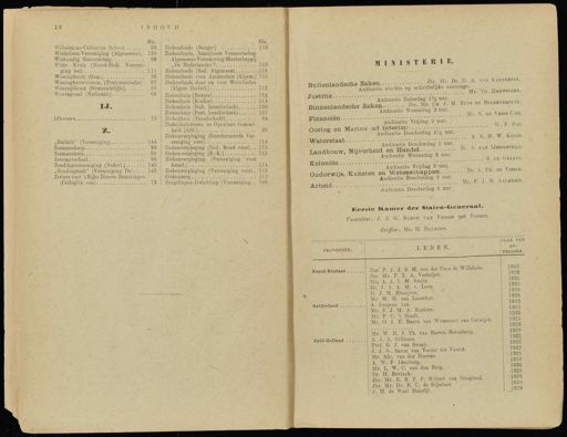18 INHOUD . MINISTERIE . _ , fhr Mr Dr II . A . van Karnereek . 01 Audiëntie Woensdag 2 uur . Biz . WilhelminaOatharina School .... 59 Winkeliers-Vereeniging ( Algemeene ). 130 Wiskundig Genootschap 99 Witte Kruis ( Noord-Holl . Vcreeni ging het ) 111 Woningbeurs ( Gem .) 36 Woningbouw vereen . ( Protestantsche ) . 67 Woningdienst ( Gemeentelijke ) 36 Woningraad ( Nationale ) 66 IJ . IJkwezen 73 z . „ Zarfath " ( Vereeniging ) •"•-„•'• •• 144 Zeemanshoop .' 98 Zeemanshuis 98 Zeevaartschool 98 Zendingsvereeniging ( Nederl .) 143 „ Zendingzaak " ( Vereeniging De ) .. 143 Zetters voor ' s Rijks Directe Belastingen ( Collegiën van ) 78 , Bk . Ziekenfonds ( Burger ) 112 Ziekenfonds , Naamlooze Vennootschap Algemeene Verzekering-Maatschappij „ De Nederlanden"112 Ziekenfonds ( Ned . Algemeen ) 118 Ziekenfonds voor Amsterdam ( Algem .) 112 ] Ziekenfonds door en voor Werklieden ( Algem . Onderl.J/k ;./. 113 | Ziekenhuis ( Burger ) 114 Ziekenhuis ( Kinder ) 114 Ziekenhuis ( Ned . Israëlietisch ) 150 Ziekenhuis ( Port . Israëlietisch ) 151 Ziekenhuis ( Tesselschadö ) :.- 34 Ziekenhuiswezen en Openbare Gezondheid ( Afd .) '.-. 28 Ziekenverpleging ( Gereformeerde Vereeniging voor ) . . 114 Ziekenverpleging ( Ned . Bond voor ). 115 Ziekenverpleging ( R.-K .) 115 Ziekenverpleging ( Vereeniging voor Israël .) '. '.£.. 114 Ziekenverpleging ( Vereeniging voor ) . 113 Ziekenzorg .: 113 Zuigelingen-Inrichting ( Vereeniging ) . 140 Audiëntie Vrijdag 2 uur . interim ) idientie Donderdag l'/a B Audiëntie Donderdag 2 uur . Financiën Oorlog en Marine ad interim ) . B Audiëntie Donderdag l'/a uur . Waterstaat . Landbouw , Nijverheid en Handel . ' Audiëntie Woensdag 2 uur . Koloniën .. •> Audiëntie Vrijdag ' a-uur .' ' Onderwijs , Kunsten en Wetenschappen ^ Audiëntie Donderdag 2 nar . Arbeid Audiëntie Donderdag 2 uur . Mr . S . de Vries C.zn . W '. F . Pop . A . A . H . W . KóNiG . H . ft . VAN IJSSELSTEIJN . S . DE GrAAÏF . Dl '. 1 . ÏH . DE VlSSEtt . Mr . P . J . M . AAI.BEESE . Eerste Kamer der St»ten-«eoera»l . Voorzitter : J . J . G . Baron van Voorst tot Voorst . Griffier : Mr . H . Zillesen . \ PROVINCIËN . Noord-Braliant . . HelrlerUnd Znid-Holland jlu -; p . j . J . S . M . van der Does de Willebois . Jhr . Mr . F . X . A . Verheijen . Mr . A . J . I . M . Smits . Dr . 1 . A . A . M . v . Loon . H . J . M . Blomjous . Mr . W . M . van Lanschot . A . Jurgens . Vzn . ' Mr . P . J . M . A . Reekers . Mr . P . C . ' t Hooft . Mr . O . J . E . Baron van Wusseuacr van Catwvjck . Mr . W . H . J . Th . van Bas ten-Batenburg . A . J . A . Gillissen . ' Prof . G . J . van Swaay . J . J . G . Baron van Voorst tot Voorst . Mr . Abr . van der Hoeven . A . W . F . Idenburg . Mr . L . W . C . van den Berg . ■ Dr . H . Bavinck . ' W'V ~ Jhr . Mr . E . B . F . F . Wittert van Hoogland . Jhr ; Mr . Dr . N . " 0 . de Gijsclaar . J . H . de Waal Malefijt . 1922 1922 1925 1925 1928 1928 1922 1922 1925 1925 1928 1928 1922 1922 1922 : 1925 . 1925 1925 1928 1928 1928 1928