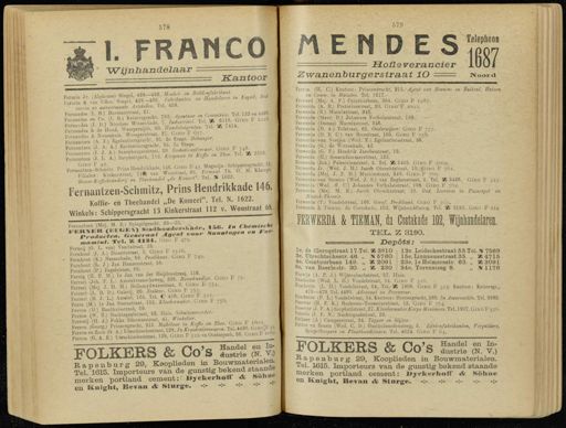 Gebruik tekstcoördinaten Transcriptie = Kantoor 1 ) 78 £ 71 . FRANCO TWjjnhandelaar 579 ENDES Hofleverancier Zwanenburgerstraat ÏO 1687 Noord ,, , , „. i j go « o Mfubel - en Beddenfabrikant . veeren en aanverwante Artikelen . Tel . 458 . Femandes ( I . B .) f "™"^. 2 ^ 792 . Agent uur en Oommissie . Tel . 132eu44 ^ Fernandes en Co ( 1 . B .) fc*»0V ££ % uJLlriU . Tel . B 6516 Giro F 2 Fernandus & Nnneshuis . Weesperstraat , 27 . Giro ü 017 . Analen ( A . J .) Egelantiersgrach , 95 8 . f^i ' 2316 . Femantzen ff . A . A ) W^jg .»,- J^jS ^, Gl RO F 748 . Giro F 42 . « JLa . ïifi r,™n F « Magazijn : SchipperBgracht , 13 . 1 Stoom-Kofiebranderij en Theehandel „ de Komeet . Tel . » MM Fernantzen-Schmitz , Prins Hendrikkade 146 , Koffie - eft Theehandel „ De Komeet ". Tel . N . 1622 . 3 Winkels : Sc hippersgracht 13 Kinkerstraat 112 v . Woustraat 68 . 1 mamint . Tel . SS *»»*• Giro F 479- Ferneij ( G . L . van ) Vaartstraat , 23 . Fernhout ( J . A .) Dusartstraat , 2 . GlRO F 1516 . . Fernhout ( K .) Nassaukade , 89 . Predikant . Giro F 7 49- Fernhout ( L . J .) Jan Havenstraat , 58 . Fernhout ( P .) Fagelstrnat , 88 . -* r *« Urn-me ( H P M.1 Ie Jan van der Hegdenstraat , 116 . £ Ferrari ( Joh F L .^ Amstelveenscheweg , 2QS . Bouwkundige . Giuo F 75 . Ferrari ( Mei . J . H . M .) Bellamydwarsstraat , 2 . Giro J3- 7a4-_S(l B . D .) Galerij . 20 . A«fe«r . Giro F 755- Ferreri B J L .) Am.tel , 165 . Tel . C 476 . Giro ï 321 . Ferro ( M ) Ie Jan Steenstraat , 132 . Kleedermaker . Giro F 756 . Ferron ( D .) Raadhuisstraat , 39 . ^»&?»' _ , .„ , Ferron ( w ! B .) Nachtegaalstraat , 58 , Umi . Schuitenvoerder . Ferroeii ( H . J .) Fokke Siihonszstraat , 41 . Winkelier . ; Ferron ( o . A . E .) Uteechtsc hestraat , 128 , Giro F 322 en Oosterpark , 36 . Giro F i°j FOLKERS & Co's ££ S Sr . | Rapenburg 29 , Kooplieden in BouTOatenataJ > Tel 1615 . Importeurs van de gunstig bekend staanae merken portland cement :: Wyckerhoff «& Sonnju en Knight , Bevau éc Sturge . -:-:-:- Fermn ( H . C .) Kantoor : Prinsengracht , 915 . Agent van Binnen - en Builen /. Huilen en Comm . in Metalen . Tel . 1217 . Fenverd ( Mej . - A . F .) Ceintuurbaan , 364 . Giro F 11.187 . Ferwerda ( A . 11 .) Pretoriusslraat , 80 . Giro ' F 1092 . Ferwerda ( B .) Marniistraat , 346 . Fenverda -( Mevr . D .) Johannes Vcrhulststraat , 189 . — Ferwerda ( Dames ) Marnixslraat , 346 . Ferwerda ( D . A .) Tolstraat , 62 . Onderwijzer . Giro F 757 . Ferwerda ( D . E C ) van Breestraat , 105 . Giro F 758 . Ferwerda—van Noeijen ( Wed.TE ) Egelantiersstraat , 56 . Ferwerda ^ G .) de Wittonkade , 42 . Ferwerda ( G . F ,) Hendrik Jacobszstraat , 12 . Ferwerda ( H .) Spaarndam merstraat , 133 . Ferwerda ( Joh .) Palestriaastraal , 5 . Tel . 35 5403 . Giro F 2009 . Ferwerda Jr . ( Wed . J . H .) Jacob Obrechtstraat , Ï0 .. Giro F 761 . Ferwerda ( Mej . J . F . M .) Marniistraat , 346 . Giro . F 760 . Ferwerda-van Straten ( Wed . - J ; S .) van Eeghenstraat , 5 . Tel . 9E 3426 . Giro F 323 . FerwerJa ( Wed . M.C .) Johaunes Verhuls tstraat , 108 . Giro F 762 . Ferwerda ( Mej . M . K .) Jacob Obrechtstraat , 10 . Bed . Leerares in Pianospel en Muziek - Theorie . Ferwerda ( T .) Vondelstraat ,' 166 . Gere /. Predikant . Giro F 7G3 . Ferwerda & Tieman . da Costakadc , 102 . Wijnhandel aren . Tel . X 3190 . Giro F 214 . FERWERDA & TIEMAN , to Cotóaie 102 , Wijtttatolra . TEL . Z 3190 . «= TJepóts : — 12e . Leidschestraat 53.Tel . K 7569 4715 3091 1176 15e , Linnaeusstraat 35 . „ UB23e , Ie Helmersstr . 63 . „ SE24e , Torensteeg 8 . ,, M Ie , de Olercqstraat 17.Tel . Z 3810 3e , Utrechtschestr . 46 . „ UT 5760 4e , Ceintuurbaan 149 . „ 5(5 2091 6e , van Baerlestr . 30 . „ 5B 230 ' Ferwijs ( A . P . J .) Wyttenbachstraat ," 57 . Huis . zersgr ., . 9989 . F 3 26 . ulders % Feschotte ( Wed . L . H .) Vondelstraat , 54 . Giro F 516 . - Fescholte ( L . H .) Vondelstraat , 54^Tcl .-« 1908 . GlRO F 325 . Kantoor : Kei 473—479 . Tel . 4490 . Advocaat en Procureur . Fescholte ( P . L .) Vondelstraat 54 . Kantoor : Heerengracht , 560 . In Assurantiën . Tel Fesevur ( H . F . K .) Bosboom-Toassaintstraat , 13 . Giro F 764 . Fesevur ( J . F . A .) Sarphatistraat , 27 . Kleedermaker Korps Mariniers . Tel . 1907 . Giro Feteris ( J . F . N .) Nachtegaalstraat , 29 . Fethzer ( A ) Camperstraat , 34 . Tapper en Sly ter . Fetter en Zonen ( Wed . C . D .) Gasthnismolensteeg , 5 . IAjslenfaorïkanten , Verg Spiegelkoopers en Plaathandelaars . Tel . 4624 . Giro F 6 FOLKERS & Co's SSS £ £; Rapenburg 29 , Kooplieden in Bouwmaterialen . Tel . 1615 . Importeurs van de gunstig bekend staande merken portland cement : Dyckerhoft * &■ Söhrie en Knight , Bevau « fc Sturge . -:-:• -:-:-:-