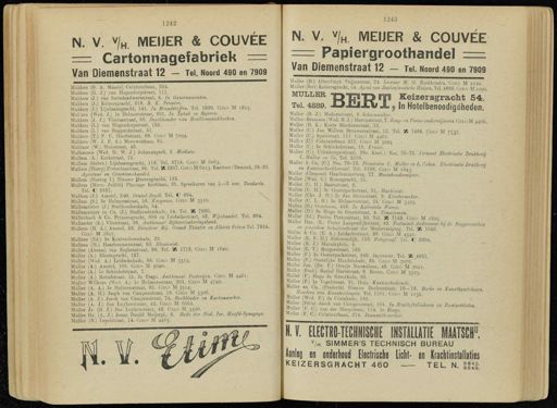 1242 1243 IM . V v / h . MEIJER & COUVEE = Cartonnagefabriek = Van Diemenstraat 12 — Tel . Noord 490 en 7909 Mulders ( Gr . A . Messie ) Ceintuurbaan , 334 . Mulders ( G . J .) van Hogendorpstraat , 111 . Mulders ( J .) van Swindendwarsstraat , 8 . In Gasornamenten . Mulders ( J .) Keizersgracht , 218 . R . K . Priester . Mulders ( J .) Lijnbaansgracht , 141 . In Brandstoffen . Tel . 1839 . Giro M 1815 . Mul Iers (" Wed . J .) Ie Helmersstraat , 201 . In Tabak en Sigaren . Mulders ( J . J .) Vossiusstraat , 66 . Depóthouder van IjraUlemuziekboeken . Mulders ( L .) van Hogendorpstraat , 182 . Mulders ( L .) van Rappardstraat , 31 . Mulders ( T .) P . C . Ilooftstraat , 69 . Giro M 7094 . Mulders ( W . J . F . A .) Meeuwenlaan , 61 . Müldner ( W .) Sluisstraat , 43 . Mulhausen ( Wed . H . W . J .) J ohannapark , 2 . Modiste . Mullem ( A .) Kerkstraat , 75 . Mullem ( Gebrs .) Lijnbaansgracht , 118 . Tel . 8718 . Giro M 6063 . Mullem ( Harry ) Pretoriusstraat , 36 . Tel . SE 2287 . Giro M 6213 . Kantoor : Damrak , 28-30 Agentuur en Commissi chandil . Mullem ( Hartog I .) Nieuwe peerengracht , 183 . Mullem ( Mevr . Judith ) Plantage Kerklaan , 25 . Spreekuren van 1—8 uur . Tandarts . Tel . C 2827 . Mullem ( J .) Amstel , 240 . Dental-Depdt . Tel . C 694 . ^ Mullem ( S .) 3e Helmersstraat , 56 . Koopman . Giro M 3510 . Müllemeister ( J .) Stadhouderskade , 54 . Müllemeister en Co . ( J .) Stadhouderskade , 54 . Tel . SE 7880 . Müllenbach & Co . Prinsengracht , 688 en Leidschestraat , 43 . Wijnhandel . Tel . 994 . Muilender ( K .) Vlietstraat , 36 . Ambtenaar ^ Rijksverzekeringsbank . Mullens ( B . A .) Amstel , 59 . Directeur Mij . Grand Theatre en Alberts Frères Tel . 7934 Giro M 1817 , Mullens ( Ed .) 3e Kostverlorenkade , 23 . Mullens ( H .) Haarlemmerstraat , 93 . Illusionist . Muller ( Abram ) van EeghenBtvaat , 96 . Tel . SE 1713 . Giro M 1S20 . Muller ( A .) Bloemgracht , 127 . Muller ( Wed . A .) Leidschekade , 86 . Giro M 3513 . Muller ( A .) Amstel , 105 . Giro M 5040 . Muller ( A .) Ie Schinkelstraat , 7 . Muller ( A .) Retiefstraat . 15 . 2e Etage . Ambtenaar Posteryen . Giro M 4461 . Muller Wilkens ( Wed . A .) Ie Helmersstraat , 201 . Giro M 4749 . Muller ( A . A .) 3e Helmersstraat , 65 . Giro M 3514 . Muller ( A . H .) Jac,ob van Campenstraat , 18 . Giro M 5306 . Muller ( A . J .) Jacob van Campenstraat , 74 . Boekbinder en Kartonwerker . Muller ( A . J .) Jan Luykonstraat , 42 . Giro M 6662 . Muller Jr . ( B . J .) Jan Luykenstraat , 42 . Giro M 3520 . Muller Gz . ( A . J .) Jonas Daniël Meijerpl ., 6 . Bode der Ned . Isr . Hoofd-Synagoge . Muller ( B .) Lepelstraat , 14 . Giro M 4465 . N . V . v / H MEIJER & COUVEE = Papiergroothandel = Mulle ( B .) Alber.lingk Thijmatraat , 24 . Leeraar M . O . Boekhouden . ' Giro M 2120 Muller ( Bert ) Keizersgracht , 54 . Agent van Builenlandsche Suizen . Tel . 4889 Giro M MULLER Van Diemenstraat 12 — Tei . Noord 490 en 7909 1090 . BIFT ^ r P Keizersgracht 54 . JUJUV X , In Hotelbenoodigdheden . Muller ( B . J .) Madurastraat , 8 Schoenmaker . . Muller-Bramson ( Wed . B . J .) Marcusstraat , 7 . Zang - en Piano-onderwijzeres . Giro M 4466 Muller ( B . K .) Korte Bleekersstraat , 16 . Muller ( C .) Jan Willem Brouwersstraat , 12 . Tel . SE 1488 . Giro M 7 f37 Muller ( C .; Spuistraat , 111 . Giro M 4467 . Muller ( C .^ Ceintuurbaan 257 . Giro M 5024 Muller ( C .) 3e Schinkelstraat , 18 . Kruier . Muller ( O ) Uilenburgerstraat , 29e . Kant .: Nes , 70-72 . iirmant Electrische Drukkerii C . Muller en Co . Tel . 5108 . Muller & Co . ( C .) Nes , 70-72 . Firmanten C . Muller en L . Cohen . Electrische Drukkerij en Kantoorboekhavael . Tel . 6108 . Giro M 1843 . kMuIler ( Clemens ) Haarlemmerweg , 77 . Muxiekonderioijzer . Muller ( Wed . C .) Rozengracht , 15 . Muller ( C . H .) Baarsstraat , 9 . , Muller ( C . H .) 8e Oosterparkstrnat , 31 . Machinist . Muller ( Chr . J . H .) 2e Jan Steenstraat , 9 . Kleedermaker . 352S - Muller ( C . L . G .) 8e Helmersstraat , 25 . Giro M Muller ( D .) Overtoom , 458 . In Koloniale Waren . Muller ( D .) 3e Hugo de Grootstraat , 4 . Timmerman . M 11 * Ed ') Paulus Potterstraat , 30 . Tel . SE 7149 . Giro M 1825 . Muller Hzn . ( E .) Pieter Langendijkstraat , 49 . Technisch Ambtenaar bij de Baggerwerkt en gezonken Schuitetidienst der Stadsreiniging . Tel . SB 1042 . Muller & Co . ( E . A .) Leidschestraat , 28 . Giro M 4541 . Muller ( E . F . H .) Niéuweudijk , 153 . Fotograaf . Tel . C 2904 . Muller ( E . J .) Marrojplein , 4 . Maller ( E . T .) Borgerstraat , 193 . [ Muller ( F .) 2e Oosterparkstraat , 248 . Ingenieur . Tel . SE 4831 Muller ( F .) Oostelijke Handelskade , 36 . Giro M 7076 .'" Muller Jzn . ( Dr . F .) Oranje Nassaujaan , 46 . Giro M 7021 . Muller ( Fred .) Roelof Hartstraatr 9 . Boven . Giro M « 2 *. Muller ( F .) Hugo de Grootkade , 60 . JJulJer ( P .) Ie Vogelstraat , 21 . Huis . Kantoorbediende . Muller er , Co . ( Frederik ) Nieuwe Doelenstraat , 16-18 . Boek - en Kunsthandelaars Houders van Kunstveilingen . Tel . 1101 . Giro M 1132 Maller ( Wed . F .) da Costakade , 182 . Muller ( Frits ) Jacob van Campenstraat , 104 . In Bruiloftsliederen en Feeslartikelen . ; « ulier ( F . C .) van der Hoopstraat , 114 . Ie Etage . Muller ( F . C .) Ceintuurbaan , 274 . Diamantwerker . U ELECTN-TEEUE INSTALLATIE MAATSCH ". v / h . SIMMER'S TECHNISCH BUREAU Aanleg en onderhoud Electrische Licht - en Krachtinstallaties 8842 . 8845 . KEIZERSGRACHT 460 TEL N .
