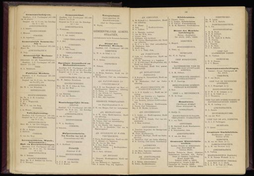 18 19 Ciemeentebedrij ven . Raadhuis , O . Z . Voorburgwal . 197-199 { op de plaats .) Geopend van 9—5 uur , des Zaterdags van 9—1 uur . ADMINISTRATEUR . J . J . Schafer . HOOFDCOMMIES . J . Monsee8 . COMMIES . J . H . Scherhorn . <« e in een Ie lijk Assurantie - fou ' s . Raadhuis , O.Z . Voorburgwal 197-199 ; Kamer 34 . ADMINISTRATEURH . Tulp . Gemeentelijk Reclame Bureau . ( behoorende tot afd . Gemeentebedrijven ), Raadhuis , 0 . Z . Voorburgwal 197-199 . Kamers 155-156 , CHEF . H . A . Brinkhorst . Publieke Werken . Raadhuis , 0 . Z . Voorburgwal 197-199 [ op de plaats .) Geopend van 9—3 uur , des van 9 — 12 1 / 2 uur . ADMINISTRATEUR . Mr . H . A . van Beusekom . REFERENDARIS . HOOFDCOMMIEZEN . Dr . Th . A . J . M . Curnelisse . L . Roeffen . H , E . v . Wagensveld . J . Rog . Mr . J . C . van den Berg . COMMIES . J . de Winter . % olksltuis vesting -. Raadhuis , O.Z . Voorburgwal 197-199 . Geopend van 9—5 uur , des Zaterdags van 9—1 uur . ADMINISTRATEUR . Mevr . Mr . A . van Lier-Schippers . HOOFDCOMMIEZEN . F . Th . A . Krijger.J . Sniekers . COMMIES . G . van den Berg . Levensmiddelen , Wascli -, Schoonmaak -, Bad - en Xweminriclitingen . Raadhuis , O.Z . Voorburgwal 197-199 . Geopend van 9—5 uur , des Zaterdags tot 1 uur . ADMINISTRATEUR. Mr . J . Reitsma . HOOFDCOMMIEZEN . Mevr . Mr . B . J . Redeker-van Greven . P . C . Besanger . Gemeenteblad . Raadhuis , O.Z . Voorburgwal 197-199 , Kamers 15-17-19 Geopend van 9—5 uur , des Zaterdags tot 1 uur . ADMINISTRATEUR . J . Winkelman . HOOFDCOMMIES . J . N . J . van Amstel . CHEF-VERSLAGGEVER . G . J . Mol . COMMIEZEN . C . J . J . Becker . J . W . C . van Voorst . VERSLAGGEVERS . N . H . Bokma . J . A . W . Bergvelt . Openbare Gezondheid en Kieken Ii u is vrezen . Raadhuis , O.Z . Voorburgwal 197-199 . Kamers 37 , 38 , 39 , 40 , 43 44 , 273 en 276 . Geopend van 9—5 uur , des Zaterdags tot 1 uur . ADMINISTRATEUR , Chef der Afd . Mr . W . Bakhuys Roozeboom . HOOFDCOMMIEZEN . ■ Mevr . Mr . W . C . Schoo-de Vries . C . B . van der Werf . . COMMIEZEN . C . van Zijverden . P . D . van der Meulen . Maatschappelijke Steun . ( Afdeeling ) Raadhuis , O . Z . Voorburgwal 197-199 . Geopend van 9—5 uur , des Zaterdags tot 1 uur . ADMINISTRATEUR . A . van der Laarse . HOOFDCOMMIES . J . W . A . Beusekamp . COMMIES . J . Schouten . Hulpsecretarieën . Ten Noorden van het IJ . 327 . HOOFDCOMMIES M . A . Koekkoek . Sloterdyk . Dorpstraat B 43 HOOFDCOMMIES . H . Kühnen . COMMIEZEN . A . J . J . M . van Santvliet . C . J . J . Kessler . Watergraafsmeer . Linna^usparkweg 20 . HOOFDCOMMIES . ( Chef der Hulpsecretarie ). W . Wortel . GEMEENTELIJKE ADMINI- STRATIÈ'N , niet behoorende tot de Gemeente-Secretarie . IMenst dea- Publieke Werken . Raadhuis , O.Z . Voorburgwal 197-199 . DIRECTEUR . Ir . W . A . de Graaf ( c . i .). STADS-INGENIEUR . W . C . Kohier . INSPECTEUR W . Pathuis . Afd . SECRETARIAAT . A . de Bruijn , Secretaris , Hoofd van Af - deeling . P . H . Landweer , Chef van Arbeidszaken . Afd . HAVENWERKEN EN UTILITEITSBOUW . Jhr . J . E . van Heemskerck van Beest c.i . • Hoofdingenieur , Hoofd van Afdeeling . P . C . Tirion , c.i . Ingenieur . P . C . van Niftrik , c.i ., Ingenieur . C . J . Tuijn , Ingenieur . G . S . Bos , Adj-.-Ingenieur . GEMEENTE WERKPLAATSEN . van Reigersbergenstraat 2—8 . J . H . van Harpen , Chef der werkplaatsen . Afd . BESTRATINGEN . Ir . J . W . Clerr , Hoofd-Ingenieur , Hoofd van afdeeling . J . J . Sterkenbuig c.i . Ingenieur . W . Verwey , Chef van onderafdeeling . M . C . Trouw , idem . J . A . van Heerde , Adj . Ingenieur . H . N . W . A . Hendricks , Chef van de Bestratmgswerf Afd . RIOLEERINO EN WATER - VERVERSOHING . P . Nauta , Hoofd-Ingenieur , Hoofd van Afd . P . P . Bijlaard c.i ., Ingenieur . Dr . H . van der Zee , idem . K . J . Noy , Hoofd van J « Onder-Afdeeling . , Hoofdopzichters.C . Koster . 1 Dr . J . Smit , Adviseur . Afd . BRUGGEN . C . Biemond , Hoofdingenieur , Hoofd van Afdeeling . A . van Walraven c.i . Ingenieur . ' Jhr . S . Laman Trip , Adj . Ingenieur . Afd . GEBOUWEN . A . R . Hulshoff , b . i . Stadsarchitect , Hoofd van Afdeeling . E . P . Messer . ) A . Kok . > Hoofd-Architecten . B . A . Lubbers . ) P . L . Marnette , Architect . C . van der Wilk , idem.J . Leupen , idem . C . Feltkamp , Adj.-Architect . H . W . Nijman , Hoofdopzichter , Adj . Hoofd van Afdeeling . J . H . C v . d . Bol , Chef onderafdeeling . M . Glasbergen , idem . C Korff , idem . W . G . v . d . Waaij , idem , Afd . WERKTUIGEN . P . Lohr , w.i . Hoofdingenieur , Hoofd van Afdeeling . W . F . Th Pasdeloup , w . i . Ingenieur . C . A . B . d'Ollyslagtr , Hoofdopzichter , Adj . Hoofd van Afdeeling . R . van Vredendaal , Hoofd Riol . gemaal , Zeeburgerdijk . Afd . BEPLANTINGEN . Sladskweekerij . J . R . Koning Jr . Tuiiiarchiteet , Hoofd van Afdeeling . E . M . Mandersloot , Chef van Onder- Afdeeling . Afd . STADSUITBREIDING EN STADSONTWIKKELING . Ir . L . S . P . Scheffer c.i ., Hoofd van Af- deeling . Ir . Th . K . van I.ohuizen c . i ., Ingenieur . J . C . van den Berg , c.i . idem C . van Eesteren , Architect Stedebouwkun- dige . Dr . G . Th . J . Delfgaauw , Hoofdcommies . J . Trouw , Chef Teekenkamer . Mej . J . H . Mulder , Aichitecte . Afd . GRONDBEDRIJF . J . L Inckel , c.i . Hoofd-ingenieur , Hoofd van Afdeeling . Mr . J . W . F . H . Donath , Chef van Ad - ministratie . G . J . Roes , Architect . GRONDBEDRIJF . A . Tesselhof , Inspecteur der RentegevendeEigendommen . W . Gehle , Hoofdcommies . J . Brinkert , Hoofdopz ., Hoofd van Onder - afdeeling . C . Boomkens . Chef van Onder Afdeeling . B . B . Luuring , Chef boekh . Grondbedrijf . LANDMETEN . O . Z . Achterburgwal 194 . A . ten Have , Ingenieur-Landmeter . B . de Boer , Landmeter . Afd . ADMINISTRATIE . Kloveniersburgwal 74 . P . J . Radier , Administrateur . H . Koster , Hoofdboekhouder . Klokkenisten . J . Vincent , Paleis . J . C . Smagge , Zuiderkerkstoren . J . P . Vincent , Westerkerkstoren . F . B . M . Hasselaa