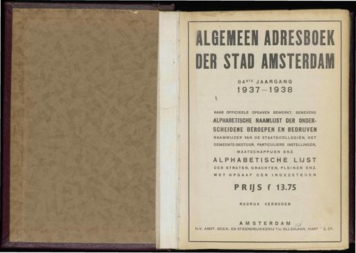ALGEMEEN ADRESBOEK DER STAD AMSTERDAM 84 STE JAARGANG 1937-1938 I NAAR OFFICIEELE OPGAVEN BEWERKT , BENEVENS ALPHABETISCHE NAAMLIJST DER ONDERSCHEIDENE BEROEPEN EN BEDRIJVEN NAAMWIJZER VAN DE STAATS-COLLEG I ËN , HET GEMEENTE-BESTUUR , PARTICULIERE INSTELLINGEN , MAATSCHAPPIJEN ENZ . ALPHABETISCHE LIJST DER STRATEN , GRACHTEN , PLEINEN ENZ . MET OPGAAF DER INGEZETENEN PRIJS f 13.75 NADRUK VERBODEN AMSTERDAM N.V . AMST . BOEK - EN STEENDRUKKERIJ v / H ELLER.V1AN , HAR "* " &. CO .