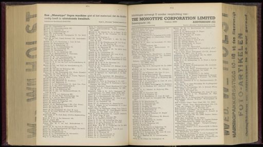 PU ■ H H | 874 875 Inlichtingen ontvangt U zonder verplichting van : THE MONOTYPE CORPORATION LIMITED AMSTERDAM ( C ) Gezet in „ Monotype " Rockwell series 371 en 391 Een „ Monotype " Supra machine giet al het materiaal dat de drukker nodig heeft in uitstekende kwaliteit . Telefoon 43606 ri ' ML . i 1 1 ; « i W?l Ingeschreven Handelsmerk MONOTYPE Minks ( H .) Clematisstraat 12 . Minnaard ( J .) Nieuwendammerdijk 387 . Minne ( J . E .) Lekstraat 74 . Minne ( J . S .) Sassenheimstraat 10 . Minne ( W .) Antillenstraat 14 . Minne ( Dr . J . L . van der ) Olympiaplein 77 . Tel . 91611 Giro M 2883 . Minne ( M . van der ) Gerard Doustraat 146 . Banketbakker . Tel . 90437 . Minnebo ( A . J . F .) Teniersstraat 1 . Giro M 826 . Minnebo ( G .) Brouwersgracht 226 . Minnebo ( J . L .) Kalkoenstraat 17 . Minneboo ( E . C . J .) Commelinstraat 72 . Minneboo ( J . Tb .) Lyndenstraat 34 . Minneboo ( P .) Tasmanstraat 71 . Minneboo ( T . I .) van Speijkstraat 126 . Minnee ( J . S .) Sassenheimstraat 6 . Timmerman . Minnema ( M .) Sleutelbloemstraat 1 . Minnen ( A . W . van ) Zaandammerplein 56 . Minnen ( A . W . van ) Bestevaerstraat 137 . Minnen ( Chr . van ) van der Hoopstraat 19 . Minnen ( G . M . E . van ) van Tuyll van Serooskerkenweg 41 . Giro M 562 . Minnen ( H . van ) van Tuyll van Serooskerkenweg 41 . Giro M 2063 . Minnen ( H . van ) Jan van Galenstraat 209 . Minnen ( H . van ) Rozenstraat 119 . Minnen ( H . A . van ) Prinsengracht 615 . Electro Technisch Ingenieur . Tel . 37742 . Giro M 1621 . Minnen ( H . P . van ) Middenweg 75 . ( Voorm . Wgrmeer ). Hoofdonderwijzer . G1R0 M 1816 . Minnen ( J . van ) Spechtstraat 4 . Minnen ( J . van ) Chasséstraat 49 . Kruidenier . Minnen ( J . van ' Papaverweg \ b . Minnen ( J . A . van ) Oostzaanstraat 19 . Oond . Gem . Tram . Minnen ( J . A . van ) Pieter Lastmankade 42 . Minnen ( W . van ) Scbaepmanstraat 35 . Minnen ( W . A . van ; Stadionweg 258 . Minnen ( W . C . van ) van Oldenbarneveldtstraat 88 . Giro M 2578 . Minnen ( W . L . F . van ) Stadionweg 229 . Minnen ( A . van der ) Pieter Nieuwlandstraat 15 $. Minnen ( J . A . van der ) Bestevaerstraat 269 . Minners ( H .) Goudsbloemstraat 66 . Minnes ( J .) Willem de Zwijgerlaan 175 . Minnes ( R .) Boetonstraat 26 . Minninl . ( A . de ) Haarlemmerweg C 305 . ( Vm . Sloten ). Minnis ( A .) Ie Jan van der Heijdenstraat 104 . Minnis ( M .) Ploegstraat 75 . Minoli ( H . H .) Lumeijstraat 53 . Giro M 1473 . Minor ( F . W .) Ferd . Bolstraat 212 . Eleclrotechnieus , Giro M 1029 . Minor- Goede ( F . W .) Ferd . Bolstr . 212-214 . Strijkinrichtina . Tel . 28371 . Minor ( G . F . W .) Ie Jan Steenstraat 140 . Mins ( I .) Amstel 302 . Minsek ( E .) Raphaëlstraat 18 . Minsten ( Mej . M . C . van den ) Brederodestraat 2 . Costumière . Minsten ( P . W . van den ) 2e Helmersstraat 25 . Minten ( J . W .) van Hogendorpstraat 195 . Kapper . Tel . 84415 . Minter ( W .) Schagerlaan 18 . Mintjes ( C .) Campanulastraat 51 . Mintjes ( P . J .) Heemstedestraat 32 . Schoenmaker . Mintjes ( R ) Vasco da Gamastraat 3 . Miög ( C . J .) Waddendijk 72 . Gezet in „ Monotype " Rockwell series 3!l aK Miolee ( C .) Haarlemmermeerstraat 145 . „ Mirado " Lederwarenfabriek . Nieuwe Amstelsfraat 11 Tel . 46983 . a Miranda ( A . de ) Damrak 84 . lm - en Export . Tel 44777 Miranda ( A . de ) 2e Jan Steenstraat 115 Tel < m\i Giro M 977 . ' "' 51510 . Miranda ( A . de ) Zoutsteeg 2 . Miranda ( D . de ) Weesperzijde 4 . Arts . Tel Giro M 1318 . Miranda ( H . F . de ) Palembangstraat 22 . Giro M 2fli Miranda ( H._G . W . de ) Hoogeweg 49 . Miranda ( I . D . de ) Saffierstraat 59 . Giro M i -,„ Miranda ( J . de ) Jekerstraat 32 . Miranda ( J . de ) Milletstraat 56 . Tel . 29318 . Kantoor - Damrak 84 . Tel . 44777 . Miranda ( J . de ) Uithoornstraat 37 . Miranda ( M . de ) Sarphatipark 133 . Giro M 785 Miranda ( M . de ) Dintelstraat 28 . Miranda ( M . de ) Damrak 84 . Im-en Export . Tel . 44,777 Miranda en Co . ( M . de ) Daniël Stalpertstraat 30 . ' Manti - zagerij . Tel . 22137 . Miranda ( M . G . de ) 2e Jan Steenstraat 115 . Miranda ( R . de ) Eemsstraat 25 . Miranda ( S . de ) van Breestraat 167 . Makelaar . Tel . 25812 Giro M 1855 . Miranda ( S . de ) Damrak Beursgebouw . Kamers 42-4 !. Makelaar en Commissionnair in Effecten . Tel . 45363,45502 Miranda ( S . Rodrigues de ) Raphaélplein 8 . Tel . 27649 Giro M 4184 . Miranda ( S . S . de ) Amstelkade 126 . Diamantkloom . Mirandolle- Sleeswijk ( Mevr . Annie A .) Gerard Brandtstraat ft . Ie Etage . Pianiste . Mirandolle ( L .) Pieter de Hoochslraat 2 . Tel . 21273 . Mirandolle & Co . ( L .) Pieter de Hoochstraat 2 . Export ti Commissie . Tel . 21273 . Mirandolle ( Ludovicus ) Gerard Brandtstraat 64 . Ie Etage . Geestelijke in de Christengemeenschap . Tel . 84883 . Giro M 1627 . Mirandolle , Toüte & Co . ( N.V .) Heerengracht 479 . Commissionnairs . Tel . 32866 , 37259 , 32735 , 35972 . Mirani ( H . J . L ) Valeriusstraat 115 . Giro M 716 . Mirani ( J . A.J Admiralengracht 126 . Schilder . Mirani ( Mej . J . L .) Keizersgracht 17 . Giro M 3128 . Mirani ( Mevr . L .) Keizersgracht 100 . Mirani ( P . A .) Postjeskade 193 . Mirani ( W . F .) Aalsmeerweg 83 . Diamantbewerker . Mirani & Bangma 2e van Swindenstraat 35 . In Automo- bielen enz . Tel . 52918 . Mirani's Piano - en Orgelhandel . ( Naaml . Venn .) Firma J.A . Buschen . Westermarkt 29 . Piano-Magazijn . Separum , Stemmen , enz . Tel . 49905 . Giro M 903 . Mirck ( J .) Saxen-Weimanlaan 54 . Complete MeuUleerinij . Tel . 23705 . Giro M 2547 . Mirck ( J . P . A .) Marco Polostraat 286 . Mirck ( P . E .) Schellingwouderdijk 101 . Misana ( J . F .) Jac . van Lennepstraat 274 . Smid . Misana ( J . L .) Alex . Boersstraat 22 . Tel . 25562 . Misana ( J . L . M .) Enge Kerksteeg 1 . Misch- Bollee ( Wed . W . L .) Vondelstraat 174 . Tel . 83346 . Mischke ( E .) 2e Jan Steenstraat 84 . Misdom ( C . M .) Olympiaweg 122 . Giro M 3737 . Misdom ( J .) Doggersbankstraat 6 Misdom ( J . J .) Sluisstraat 22 . Misdom ( J . P .) Jan Lievenss