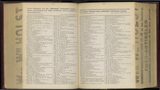 892 893 Zeven alphabetten kan een ,, Monotype " toetsenbord omvatten en zonder omschakeling door elkaar verwerken . Daarom geschikt voor ingewikkeld werk . Gezet in „ Monotype " Rockwell series Ingeschreven Handelsmerk MONOTYPE 311 en 391 Goed smout - en advertentiewerk vereisen lettertypen die aan het heden zijn aangepast . Ook hier staan „ Monotype " letterseries vooraan . [„ geschreven Handelsmerk MONOTYPE Gezet in „ Monotype " Rockwell series 371 en 391 Mounts ( A . C .) Ie Jan Steenstraat 83 . Mourits ( Gez . D . en M .) Roelof Hartstraat 74 . Mouritsvan der Hoek ( Mevr . F . H .) Dongestraat 19 . Giro M 8354 . Mourits ( J .) Brachthuijzerstraat 8 . Tel . 21961 . In Fruit , Comestibles , enz . Giro M 2015 . Mourits ( J .) Jac . van Lennepstraat 17 . Timmerman . Mourits ( J .) Géuzenkade 85 . Agentuur - en Tel . 85407 . Mourits ( J .) van Tuyll van Serooskerkenweg 64 . Giro M 2608 . Mourits ( Jan ) Adm . de Euijterweg 23-27 . Caféhouder . Tel . 84851 . Mourits ( M . J .) Mauritskade 42a . Mous ( D . M .) Ptolemaeusstraat 4 . Tel . 55009 . Mous ( H .) Postjesweg 75 . Mous ( J .) van Spilbergenstraat 14 . Mous ( J .) Sloterweg 785 . Mous ( K .) IJdijk 33 . Mous ( S . D .) 2e Jan van der Heijdenstraat 97 . In Boter , Kaas enz . Tel . 29451 . Giro M 2959 . Moussault ( A . P . M .) Keizersgracht 278 . Tel . 35858 . Moussault ( C .) Utrechtschestraat 58 . Kunstbloemenmagazijn . Moussault ( P .) P . C . Hooftstraat 136 . Dir . N.V . Vereenigde Fotobureaur . Tel . 93927 . Moussault ( Th . A . M .) van Breestraat 146 . Dir . van de „ De Groene Amsterdammer ". Tel . 92558 . Giro M 951 . Mousset ( H .) Willem de Zwijgerlaan 125 . Mousset ( M . L .) van Speijkstraat 155 . Mouter ( F . B .) Bethaniënstraat 8 . Broodbakker . Mouter ( J . C .) Jozef Israëlskade 5 . Mouters ( J . J .) Zwanenplein 61 . Mouthaan ( A .) Sleutelbloemstraat 30 . Mouthaan ( A . J .) Jasmijnstraat 4 . Mouthaan — van Engel ( Mevr . M .) Amstel 246 . Mouthaan & Co . ( ü . E ) Lijnbaansgracht 46 . Mouthaan ( W . H . K .) Amstel 246 . Advocaat en Procureur . Tel . 32487 . Mouthaan en Zoon . Heerengracht 244-246 . Assuradeurs . " Tel . 37207 . Mouton ( B .) Zuider Amstellaan 32 . Mouton ( G .) Groenburgwal 51 . Mouton ( J . P .) Schimmelstraat 48 . Mouton ( N .) Heerengracht 416 . Mouw ( A .) Tugelaweg 106 . Mouw ( G .) Korte Leidsehedwarsstraat 70 . Brooddepüthouder . Mouw ( G .) Gen . Vetterstraat 11 . Giro M 3677 . Mouw ( G . H .) Bronckhorststraat 8 . Leeraar H , B . S . Tel . 20712 . Giro M 7155 . Mouw Phzn . ( H .) Nieuwe Heerengracht 65 . Electro-Tech . Install . Bureau . Tel . 48611 . Giro M 684 . Mouw ( M .) Nieuwe Prinsengracht 80 . Mouw ( M .) Overtoom 19 . Giro M 293 . Mouw ( S .) Ploegstraat 33 . Giro M 4011 . Mouw ( S . L .) Baarsstraat 2 . Mouw ( T .) Heliotroopstraat 33 . Mouw en Kruijsse . Haarlemmerdijk 149 . Apothekers en Chemislen . Tel 48640 . Giro M 2840 . Mouwen ( H . P .) Nassaukade 314 . Giro M 2133 . Mouwen ( M . N . F . M .) Stadionstraat 13 . Commissaris van Politie . Tel . 27073 . Mouwen ( Mej . N .) Nassaukade 65 . Giro M 3387 . Mouwen ( W .) Baarsjesweg 256 . Mouwen ( W . H .) Amstellaan 99 . Mouwerik ( A . J . van ) de Kempenaerstraat 58 . Mouwerik ( T . J . van ) Witte de Withstraat 140 . Ie Etage . Mouwerik ( W . A . van ) van Walbeeckstraat 35 . Mouwes ( D .) Lange Houtstraat 57 . Mouwes ( D .) Linnaeusparkweg 17 . Mouwes & Co . ( Firma D .) 2e Boerhaavestraat 69 . J sa i en Grossiers in Schoenen en Laarzen . Mouwes ( D .) Ruyschstraat 79 . Mouwes ( H .) Kinderdijkstraat 10 . Mouwes ( I .) Jodenbreestraat 73 . Giro M 2410 , Mouwes ( I .) Koninginneweg 67 . In Visch enz . Mouwes ( J .) Tilanusstraat 24 . Grossier in IJzirwtm Giro M 2183 Mouwes ( J .) Borssenburgstraat 10 . Mouwes ( J .) Sarphatipark 93 . Diamantbewerker Tel . 29383 . Mouwes ( J . H .) Weesperzijde 104 . Mouwes ( L .) Blasiusstraat 14 . Giro M 2079 , Mouwes ( M .) Vrolikstraat 303 . Diamantbewerker . Mouwes ( M .) Sparrenweg 1 . Mouwes ( P .) Lepelstraat 25 . Mouwes ( S ) Kinderdijkstraat 13 . Mouwes ( S . I .) Jodenbreestraat 73 . In Verdmrzaamit Levensmiddelen . Tel . 42541 . Moviat ( D .) Orteliusstraat 165 . Moviat ( J . T . J .) van der Pekstraat 19 . Moviat ( L . W .) Jozef Israëlskade 2 . Mozer ( G . R .) Corn . Anthoniszstraat 22 . Llectr . Witteen Strij kinrichting . Tel . 93183 . Mozes ( A .) 2e Boerhaavestraat 3 . Giro M 4035 . Mozes ( A .) van Woustraat 113 . Mozes ( A ) Pythagorasstraat 107 . Handelsagent . Tel . 53321 Mozes ( A . I .) Swammerdamstraat 24 . Mozes ( C .) Amelandstraat 3 . Mozes — Smit ( C . E .) Kamperfoelieweg 164 . In Tdêa Sigaren . Tel . 60610 . Giro M 1529 . Mozes ( D . J .) Centaurusstraat 13 . Mozes ( E .) IJselstraat 8 . " Mozes Azn . ( E .) Plantage Kerklaan 5 . IlebreeumcheBwi ' en Ritualïènhandel Tel . 52974 . Giro M 61 . Mozes ( J .) Tholen straat 15 . Mozes ( M .) Nieuwe Kerkstraat la Mozes ( P .) A urikelstraat 11 . Mozes ( P . S .) Grevelingenstraat 34 . Mozes ( R .) Amsteldijk 37 . Mozes ( Mej . S .) IJselstraat 8 . Giro M 2356 . Mozes ( V .) Deurloostraat 7 . Mozijnski ( J .) Pieter de Hoochstraat 16 . Muchall ( Th .) van der Hoopstraat 26 . Giro M 3707 . Mucke ( Dr . jur . Dr . ing . Fr . A .) Keizersgracht 115 . Een . en Financ . Adviseur . Tel . 42356 . Mud ( H . G .) IJtrechtschedwarsstraat 92 . Mud ( H . J .) Shackletonstraat 34 . Mud ( J .) Fresiastraat 11 . Mud ( M .) Kerkstraat 311 . Giro M 2058 . Mud ( R .) Sikkelstraat 36 . Mudde ( B .) Zonneweg 25 . Timmerman . Mudde ( B . G .) Veerstraat 73—75 . Carouenifêr'ul Tel 22038 Mudde ( F . Th . G .) Sloterkade 108 . Mudde ( G .) Veerstraat 73-75 . Carosserie en Mo kofer/abriek . Tel . 90203 . Mudde ( G .) Haarlemmermeerstraat 91 . Mudde ( G . L . A .) Corn . Anthoniszstraat 64 . Mudde ( H .) Brouwersgracht 129 . Mudde ( H . G . A .) Bilderdijkstraat 56 . Giro M 3905 . Mudde ( H . Th . F .) Keizersgracht 238 . Kaffer . Mudde ( J . A .) Postjeskade 127 . Giro M 2537 . Mudde ( J . J .) Boeroestraat 28 . ifu