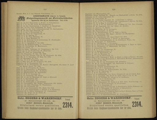 328 Emstede ( Wed . J . C . van ) Johannes Verhulststraat , 141 . EMSTERMATE ( Fabriek ) te Terwolde . Zuigelingenmelk . en Zuivelartikelen . Spuistraat 190 bij de Paleisstraat . Tel . 6293 . Ende ( A . van den ) Dapperstraat , 9 . Hoeden - en Pettenfabrikant . Ende ( A . C . E . van den ) Groote Wittenburgerstraat , 2 . Ende ( J . van den ) Roomolenstraat , 5 . Expediteur en Convooilooper . Ende ( Joh . van den ) Prins Hendrikkade , 46 . Tapper . Ende ( Lamb , van den ) Korte Leidschedwarsstraat , 76 . Paardenslachter . iViHA ^ Ende ( P . van den ) Czaar Peterstraat , 39 . Ende ( G . L . van ' t ) Hontmankade , 99 . Endedijk ( H .) Jacob van Campenstraat , 16 . Endel ( A . F . G ,) Laanweg , 51 . Endel ( A . P . M .) Prans Halsstraat , 13 . Endel ( G . A .) Prans Halsstraat ,, 13 . Endert ( C . A .) Kerkstraat bij de Leidschestraat , 81 . Eleedermaker . Endert ( C . H .) Hemonylaan , 2 . Endert ( D . C .) Nassaukade , 9 . Tel '. 3732 . Endlich ( A . H .) Korsjespoortsteeg , 10 . Yleeschhouwer . Endlicli ( F .) Noorderstraat , 60 . Muziekmeester . ■ Endlich ( G .) Amstel , 12 . Endlich en Schaap . Vijzelstraat , 82 . Vleeschhouwers . Tel . 1117 . - Endstra ( A .) 2e van Swindenstraat , 33 . Timmerman . Endstra ( W .) Jacob van Lennepstraat , 42 . Endt ( Cd .) Binnenkant , 23 . Huis . Tel . 3093 . Endt en Zoon ( Cd .) Kromme Waal , 33—34 . Bonthandel . Tel . ' 3084 . Endt ( Mr . D . C .) Binnenkant , 23 . Huis . Tel . 3093 . Endt ( G .) Binnenkant , 23 . Huis . Endt Czn . ( P .) N . Z . Voorburgwal , 340 . Endt en Hanf . Spui , 23—27 . Kooplieden . Tel . 2108 . Engberding ( B . C .) Prinsengracht , 613 . Engbertsen ( H . E .) Prinsengracht , 704 . Kantoor : Heerengracht , 504 . Kamer 10 . Agent van Buitenl . Huizen . Tel . 1340 . Engel ( A . B .) de Clercqstraat , 50 . Barbier . Engel ( B . G .) Bellamyplein , 4 . Eleedermaker . Engel ( C .) Egelantiersgracht ;, 96 . Boekbinder . Engel ( C .) Keguliersgracht , 65 , Eleedermaker . Engel ( F . W . C . G .) Javastraat , 85 . Engel ( G . H .) Vijzelstraat , 132 . Barbier . V '*"* Engel ( H . A .) van der Helststraat , 27 . Goud - en Zilversmid . Engel ( J . I .) Heerengracht , 253 . Engel ( K . P .) Weesperzijde , 78 £. Engel ( J . T .) Bellamyplein , 4 . Eleedermaker . Engel ( L .) Prinsengracht , 348 , Werkpl . : Heerengracht , 253 . Schilder . Engel ( A . van ) Czaar Peterstraat , 72 . Vleeschhouwer . Engel ( H . van ) Nieuwmarkt , 23 . Engel ( H . S . van ) Keizersgracht , 770 . Modes . Tel . 6749 . Engel ( J . S . van ) Schippersgracht , 8 . Debitant in de Staatsloterij . Engelander ( H . I .) Nieuwe Achtergracht . 73 . Commissionair . Engelander ( M .) Hoogte van den Kadijk , 21 . Engelander ( M ') Zandstraat , 40 . Gebr . EGGERS & WAREND O It F . TainF —&- I^alVefstpaat 110 « 112 . - e — 2314 . EERST BEDDEN-MAGAZIJN , Uitsluitend eerste qualiteïten . Grootste keuze Slaaptfamer-Ameiililenienten lier ter stede . 329 Engelander ( N .) Weteringschans , 221 . Engelander ( Philip ) Damstraat 28 . Magazijn van Huishoudelijke artikelen , lel . 4a ió . Engelander ( S .) St . Anthoniesbreestraat , 25 . Engelhart ( G .) Polanenstraat , 39 . -'"-^" V * V ' Engelberts ( A . C .) Nicokes Maesstraat , 49 . Commissionair in Effecten . Engelberts en Co . ( A.C .) N . Z . Voorburgwal 834 . Commissionairs in Effecten . Tel . 6131 . Engelberts ( W . F :) 2e Hugo de Grootdwarsstraat , 101 . ^'-'. ii^v ' Engelberts ( Dr . W.J . M .) van Breestraat , 115 . Predikant bjd . Ned . Hero . Gemeente . sEngélberts ( W , M .) Nassaukade , 145 . Gep . Officier der Artillerie . Engelblik ( J .) Iepenweg , 60 . Barbier . Engelblik ( J .) Bankastraat , 22 . In Aardappelen . Engelblik ( M .) Thorbeckeplein , 12 . Eapper . ^ vsfè * Engelblik ( P . N .) Haarlemmerdijk -, 151 . In Tabak en Sigaren . Engelblik ( W . M .) Kerkstraat , 362 . Eapper . Aannemer van Begrafenissen . Engelbrecht ( J .) Prinsengracht , 214 . Engelbrecht ( W .) Heerengracht , 125 . Import-Export Tel . 4524 . Engelchor ( O .) van Heemskerckstraat , 7 . Schoen - en Laarzenmaker . Engelen ( G . J . van ) Oosterburgergracht , 45 . In Gedistilleerd , Wijnen , enz . Engelen ( H .) Weesperzijde , 77 . Banketbakker . Engelen ( H . P .) Akkolijenstraat , 2 . Schoenmaker . Engelen ( H . F .) Nassaukade , 62 en Frederik Hendrikplantsoen , 4 . Tapper en Slyter . Engelen ( H . H .) Weesperzijde , 77 . Banketbakker . Tel . 6274 . Engelen ( J .) Kinkerstraat , 209 ., Engelen ( J . H . J .) Ie van Swindenstraat ,, 76 . Engelen ( P .) Ie Spaarndammerstraat , 37 . Engelen ( B . van ) 2e Helmersstraat , 80 . Engelen ( J . van ) van Wonstraat . 89 . Engelen ( M . J . van ) de Wittenstraat , 70 . -<'£ >; -> ml „„.„ Engelen ( Mart . P . H . v .) Keizersgf . 5 . Makel , in Meubil . en Assur . en Taxateur , lel . ilbt . Engelen en Zoon ( M . J . van ) Keizersgracht , 5 . Makelaars in Meubilair , Administrateurs en Assurantiën . Tel . 2762 . Engelen & Co . ( Th . H . van ) Prinsengracht 646 . Metselaars . Engelen ( Th . M . M . van ) Bloemgracht , 140 . Représentant de Fabrigues . Engelenberg ( J .) Heerengracht , 327 . Engelenherg ( W .) Frederik Hendrikplantsoen , 68 . Engelenberg ( W . P .) P . C . Hooftstraat , 45 . ,- Jt Engelenberg & Co . Damrak , 92 . Eoffiehuishouders . Tel . 3719 . Engeler ( H . J . A . M .) Pagelstraat , 18 . Engeler ( J . H . P .) Pagelstraat , 18 . : ~< [ ■ Engelgeer ( C .) 2e Helmersstraat , 114 . Boven . Geemploieerde aan de Nederl . Bank . , Engelgeer ( G . J .) Nassaukade , 360 . Hoofd der Openb . School Ie il . No . 29 . Engelhard ( F . A .) da Costakade , 91 : Leeraar in het Boeihouden . Engelhard ( F . P . J .) P . C . Hooftstraat , 132 . Engelhard ( H . E . D .) Valeriusstraat , 120 . • • Engelhard ( J . F .) Valeriusstraat / 72 . Docent in de Mod . Talen , Handelscorresp . enz . Engelhardt ( C . C .) St . Willihrordusstraat , 13 . Eleedermaker . Engelhart ( Wed . J . L .) Nassaukade , 93 . £' ' " Engelkamp ( F . J.F .) Lange Niezel , 24 en 29 . In Manufact