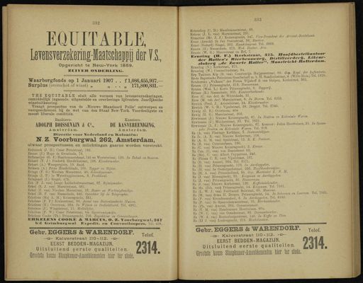 332 ^ EQUITABLE , hwiinlni-Iiattapiij for IS , Opgericht te fleca«Yot<k 1859 . /- l'IVKll OIVUEKLIXCi . iiiiililiiiiiiiiiiiiiiiiiiiiiiiiiiiiiiiiiiiiiiiiiiiiiiiiiiiiiiiiiiiiini Waarborgfonds op 1 Januari 1907 . f 1,086,455,937 .— Surplus ( overschot of winst ) „ „ . | 171,800,831 .— llllllllllltllllllillllilMIIIIIIIIIIIIIIIIIIIIIIIIIIIIIIIIIIIIMIillllt THE EQUITABLE sluit alle vormen van levensverzekeringen , onmiddellijk ingaande , uitgestelde en overlevings lijfrenten . JaarHjksche winstuitkeerin g . Vraagt prospectus van de „ Nieuwe Standaard Polis " ontworpen en voorgeschreven Ihj de ^ wet van den Staat New-York . Voordeeligste en meest liberale conditiè'n . KQ Ti 1^1 pre - Yt ó stni Af*fil * ADOLPH BOISSEVAIN & C 0 ., DE KASYEREEMGING , Amsterdam . Amsterdam . lïirectie voor Nederland en Koloniën : N . Z . Voorburgwal 262 , Amsterdam , alwaar prospectussen en inlichtingen gaarne worden verstrekt . Erdtsieck ( J . H .) Czaar Peterstraat , 162 . Erenst ( J .) Hugo de Grootkade , 78 . Erftemeijer ( G . J .) Haarlemmerstraat , 141 en Westerstraat , 120 . In Tabak en SU/aren . Erhard ( T . J .) Frederik Hendrikstraat , 198 . Kleedermaker . Erhart ( A .) Weesperplein , 10 . Smid . Brikson ( A .) Prins Hendrikkade , 108 . Tapper en Slijter . . Eringa ( F . S .) Nioolaes Maesstraat , 40 . Schoolopziener . Éringa ( J . P .) Ie Weteringplantsoen , 8 . Predikant . Eringaard ( J .) Singel , 475 . Erk ( P . J . van ) Lange Leidschedwarsstraat , 27 . Rijtuigmaker . Erkel ( E . J . van ) Marnixstraat , 381 . Erkel ( F . van ) Nicolaes Maesstraat , 16 . Bouw - en Werktuigkundige . Erkel ( H . F . van ) Nassaukade , 446 . Opzichter bij de Telegraphie . Erkelens ( Mej A . M .) Keizersgracht , 331 . Erkelens ( F . P .) Kinkerstraat , 98 . Aaent van JSuitenlandsche Huizen . Erkelens ( H .) Overtoom , 2§4 . In Wijnen en Gedistilleerd . Tel . 4961 . Erkelens ( J .) Wiegelstraat , 11 . Melkslijter . Erkelens ( P . W .) Czaar Peterstraat , 84 . Sigarenmagazijn . Erkelens Cooke ( Th .) Prinsengracht , 759 . Expediteur en Convooilooper . ERHELEKS COOHE êt MARCUS , O . ' A . Voorburgwal , 34 » b/d Grimburgwal . Expedit . en Convooilooper ». Tel . 428 . Gebr . EGGERS & WARENDORF . Te|ef ~ èa - KalVefstpaat 110 « 112 . ~^- EERST BEDDEN-MAGAZIJN . O^U Uitsluitend eerste qualiteiten . till ^ Grootste tae Slaaptoer-AmraMeinenten Mer ter stede . 333 Erkendiep ( C . D .) Haarlemmerstraat , 20 . Erkom ( J . L . van ) Marnixstraat , 231 . ■■■■■? Ermerins ( Mr . J . J .) Keizersgracht , 347 . Vice-President der Arrond.-Rechtbank . Ernst ( Arnold ) 2e Jan Steenstraat , 38 . Barbier . Ernst ( Gerard ) Singel , 258 . Handelsagent . Tel . 6969 . ' Ernste ( H .) Nassaukade , 372 . Mud . Doctor . Arts . E^%K^M&~t . '■«. Roofal>e,telUantoor ^ erRuttèJs » ierbrouu,er S , Bistiileerderg , X *****- stokeri'„de Zwarte Ruiter ». Maastricht-Rotterdam . Ernsting ( N .) Kerkstraat , 375 . ' S^^S^S^U - Huijgensstraat . 88 . ffXapt.derWanUHe Se Bayerische Petroleum Gesellschaft m . b . H . Raadhuisstraat , 4 ^ M ») Tel . 1870 . Ertsbureau „ Vulkaan " der Firma Wijnhoff & van Gulpen , Kerkstraat , 361 . Ertzen ( J .) Prinsengracht , 219 . Timmerman . Ertzen ( Wed . L .) Korte Prinsengracht , 8 . Tappery . ,_ ;. Ertzen ( R .) Nassaukade , 300 . Kantoorbediende . Erve ( C . van der ) de Wittenkade , 31 . Erve ( M . vah der ) Marnixstraat , 8 . In Bieren . Tel . 6.455 . Erwich ( Fred . J ., Amstelstraat , 34 . Kleedermaker . Erwich ( W . S . H .) Vijzelstraat , 28 . Drogist . Tel . 2745 . Erwig ( G . E .) Overtoom , 464 . El-wig ( H . G .) Marnixstraat , 202 . . Erwteman ( J .) Nieuwe Keizersgracht , 67 . In Fruiten en Koloniale - Waren . Erwteman ( J .) Muiderstraat , 33 . Tel . 7631 . e .™ Kman ( L . J .) Nieuwe Keizersgracht , 67 . Kantoor : Joden Houttuinen , 2o . In Spaan - sche Fruiten en Koloniale Waren . Tel . 819 . Es ( A . van ) Plantage Kerklaan , 3 . Didmantslijper . Es Jr . ( A . E . van ) Nieuwe Kerkstraat , 108 . Es ( A . G . M . van ) Spuistraat , 12 . 72 . K . Pastoor . Es ( B . van ) Ceintuurbaan , 236 . Es ( C . van ) Nieuwe Keizersgracht , 2 . Kruier . Es Czn . ( C . van ) von Zesenstraat 53 . Es ( Mej . C . van ) Albert Cuypstraat , 246 . Es ( Firma 0 . E . van ) Vijzelstraat , 107 . Es ( E . van ) Am'stel , 264 . Tel . 6571 . Mé ( H . van ) Prinsengracht , 173 . In . Aardappelen . Es ( H . van ) 3e Oosterparkstraat , 230 . Hoofdonderwijzer . Es ( H . A . van ) Prinseneiland , 95 . Gep ., Machinist K . N . M . Es ( J . van ) Bloemgracht , 30 . Koopman in Aardappelen : Es ( J . van ) Prinsengracht , 22 . Timmerman , Es ( J . van ) Nieuwe Kerkstraat , 120 . Koffiehuishouder . Es Mz . ( Joh . van ) Prinsengracht , 54 . Koopman . Tel . 7501 . Es ( L . W . J . van ) Ferdinand Bolstraat , 68 . Musicus . Es ( M . van ) firma H . Dèègen . Prinsengracht , 54 . In Schoenen en Laarzen , lel . 7501 . Es ( P . van ) Kromboomsloot , 6 . In Aardappelen . Tel . 6160 . Es ( P . van ) 2e Spaarudammerstraat , 35 . Bierhuishouder . Es ( Ph . van ) Amstel , 264 . Commissionair . ?•«_■; Es ( T . M . van ) Haarlemmer Houttuinen . 60ffi . Es ( W . C . van ) van Ostadestraat , 82 . Diamantwerker , Es ( W . J . van ) Rustenburgerstraat , 140 . In Koffie en Thee . Es ( IJ J . van ) Lindengracht , 278 . Meubelmaker . . Gebr . EGGERS & WARENDORP . Telef — ja - r^alverstriaat 110-112 . - e- _ EERST BEDDEN-MAGAZIJN . * W1/S . Uitsluitend eerste qualiteiten . L\t \** Grootste keuze SlaapMer-imenMefflenten Mer ter stede .