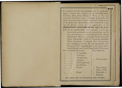 FM X X X X X X X X X X X X X X X X X X X H X X X X H H X 3 £ X X X X X X 3ë H X X X X X X R X X A X X X X X X X X X X X X X X X X A X X X X X X X H H X X X X x X X X H X voor voormalig Buiksloot » ' „ Durgerdam KKXXXXXXX^KXXXXXXXXXKXKXXXXXXXXXXXXXKXXKKKXXXXXXXXXKXXXXKXXXXXXKK TO$g In verband met de decentralisatie Van de postbestel lingen , waarbij deze uitgaan van de districtskantoren Centrum , Zuid , Oost , Noord en West , is het voor een juiste bestelling zonder vertraging gewenscht , dat op de correspondentie behalve straatnaam , huisnummer en de plaatsnaam Amsterdam , wordt vermeld de naam van het district , zooals deze is opgenomen in de alphabetische stratenlijst op blz . 1397 t/m . 2172 . N.B . In de postbestelling voor bewoners van de ge annexeerde gemeenten is , met uitzondering van die voor de bewoners van voormalig Oostzaan ( thans Amsterdam Noord ), voormalig Nieuwer-Amstel ( thans Amsterdam Zuid ) en voormalig Zaandam ( thans Amsterdam Centrum ), door de annexatie geen wijziging gekomen . De correspondentie voor bewoners dezer stadsgedeelten is dus niet te adres - seeren Amsterdam Noord , Oost , Zuid of West , maar Post Buiksloot J ) j ) Holysloot » » Nieuwendam . Nieuwendam JJ J5 JJ Ransdorp JJ )> Schellingwoude '> )? Zunderdorp Diemerbrug JJ 5 ) » Diemen J ) ) J „ Sloten N.H.Sloten „ Sloterdijk of „ Halfweg Een andere wijze van adresseering geeft vertraging . era