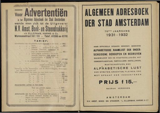 IIIIIIIIIIIIIIHIIIiMill ' v.r Advertentiën ff in hei Algemeen Adresboek der Stad Amsterdam wende men zich tot de Uitgevers : N.V . Amst . Boek-en Steendrukkerij v/h ELLERMAN , HARMS & Co . Warmoesstraat 147/151 - Telef . 40396 en 41701 ALGEMEEN ADRESBOEK DER STAD AMSTERDAM 78 STE JAARGANG 1931-1932 TARIEF : Advertentiën van één geheele pagina vooraan in het boek . a f 60 .—» » » naive ,, n . « » „ • » » 40 „ „ „ geheele „ geplaatst in de Alpha betische Naamlijst , tusschen de kop - en voetadvertentiën ... „ „ 40 .— „ , a halve pagina geplaatst in de Alpha betische Naamlijst , vlak on der de kopadvertentie of bove n de voet 27.50 advertentie ~ . ' S a f 0.90 voorden eersten en f 0.65 voor eiken volgenden regel . „ in de Alphabetische Naamlijst » n n » » "^ om roepen en Bedïijven „ „ „ „ Stratenlijst .', . Opnamen in den Naamwijzer van de Staats-C^llegiën , Vereenigin gen , Maatschappijen enz . Voor plaatsruimte van meer dan een heele kolom .. a f 50 . — V , kolom ( 76 regels ) * u » ( 57 „ ) V . » ( 38 „ ) & J ! ( 19 „ ) Vs n ( 10 „ ) „„ 30 — • • „„ 22.50 15 • • „ „ 750 V „ Advertentiën achter in het boek . Voor een geheele pagina a f30 .• • • • 20.-12.50 , » halve „ % , vierde Advertentiën aan den Boven - of Onderkant der pagina's , die telkens herhaald worden op iedere SPtoiale conötlSn . pagina der aangevraagde letter „ op den Omslag . . './, \ . . „ op de Sneezijden I NAAR OFPICIEELE OPGAVEN BEWERKU BENEVENS ALPHABETISCHE NAAMLIJST OER ONDERSCHEIDENE BEROEPEN EN BEDRIJVEN NAAMWIJZER VAN DE STAATS-COLLEGI ÉN , HET GEMEENTE-BESTUUR , PARTICULIERE INSTELLINGEN , MAATSCHAPPIJEN , ENZ . ALPHABETISCHE LIJST DER STRATEN , GRACHTEN , PLEINEN , ENZ . MET OPGAAF DER INGEZETENEN PRIJS f 15 NADRUK VERBODEN AM STERDAM N.V . AMST . BOEK - EN STEENDR . v / h ELLERMAN , HARMS & C °