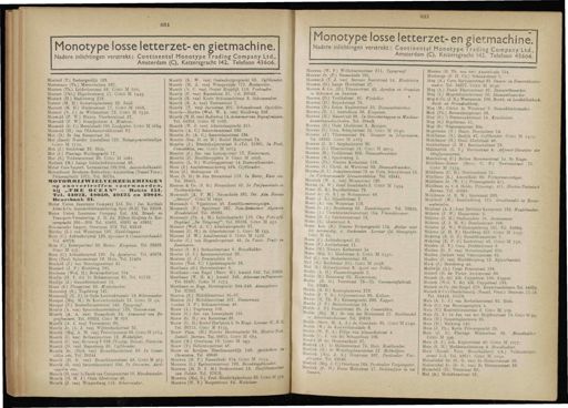 Gebruik tekstcoördinaten Transcriptie 884 88 £ Monotype losse letterzet-en gietmachine . Nadere inlichtingen verstrekt : Continental Monotype Trading Company Ltd ., Amsterdam ( C ), Keizersgracht 142 . Telefoon 43 606 . Monotype losse letterzet-en gietmachine Nadere inlichtingen verstrekt : Continental Monotype Trad -. ng Company Ltd ., Amsterdam ( C ), Keizersgracht 142 . Telefoon 43 606 . Mueren ( H . Th . van der ) Amstelnade 154 . Muetstege ( J . H Ch .) Schouwstraat 7 . Mug ( A .) Corn . Springerstraat 85 Dames - en Heerenkleed'er - mah-r . Tel . 24977 . Giro M 2030 . Mug ( A .) Danie Theronstraat 27 . Diamantbewerkér . Mug ( I .) Magersfonteinstraat 10 . Diamantbewerker . Mng & Co . ( J . N .) Weesperstr . 108 . Boekh . en Leesbibliotheek . Boek - en Sleendrukkeri ) . Mug ( M .) Christ , de Wetstraat 8 . DameskUedermaker . Mnh ( Ph .) Borssenburgstraat 22 . Mug " ( S .) ' s Gravesandestraat 14 . Kruidenier . Mug ( S .) Rigelstraat 51 . Mug ( S .) Wagenaarstraat 84 «. ■ Mugerman ( H ) Haarl . Houttuinen 14 . Mühlbauer ( H .) Zeedijk 47 . Caféhouder , Giro M 2470 Muhlbauer ( H .) Oude IJselstraat 48 . Mnhlenbauer ( J . H .) Bentinckstraat 73 . Mühlenfeld ( G . V .) Havenstraat 4 . Adjunct-Directeur der Strafgevangenis . Muhlénweg ( C .) Buiten Brouwerstraat la . 2e Etage . Mühlhaus-Zomer ( Mevr . C . P .) Newtonstraat 75 Giro M 1334 . Mühlhaus ( C . H .) Newtonstraat 75 . Mühlhaus ( K .) Amstelkade 60 . Vertegenwoordiger . Mühlhaus Jr . ( W . C .) Prinsengracht 411 . Mühlhaus en v . d . Heide . Prinsengr . 411 . Mectro-Teehnisch ' Bureau . Tel . 45593 . Mühlhause ( J . E . W .) Spuistraat 293 . Muhlhoff ( W .) Insulindeweg 172 . Groothandel in Bouw- materialen . Mühlrad ( A . J .) Joan Melchior Kemperstr . 132 . Meubelmaker Mühren ( J . W .) Hunzestraat 5 . Mühren ( J . H .) Stadionplein 10 . Amanuensis .' Mühren ( J . J . H . S .) Deurloostraat 108 . Mühren ( J . W .) Willemsparkweg 151 . Tel . 24864 . Mühren ( J . H . F .) Hoofdweg 221 . Giro M 1237 . Muhring ( E . G . J .) Ganzebloemstraat 7 . Muhring ( E , P . J .) Lootsstraat 42 . Giro M 751 . Muiden ( J . V .) Corn . Drebbelstraat 8 . Muiden ( G . F . van ) Meteorensingel 218 . Muiden ( Isidore van ) Valeriusstrsat 65 . Muiden ( j . van ) Hoofddorpweg 12 . Rijwielhandel . Muik ( J .) Breedeweg 42 . JjM Muil wijk ( A .) Czaar Peterstraat 183 . Muinck ( D . de ) Pieter Aertszstraat 80 . Muinok ( J . de ) Alb . Cuypstruat 188 . Kapper . Muinck ( Wed . T . de ) Alb . Cuypstraat 188 . Muinck en Co . ( de ) Singel 370 . Kunsthandelaars . Tel . 44004 . Muinck & Co's Handelmaatij . ( Naaml . Venn .) Beursstr . 11-18 * Tel . 84448 . 85578 . Muis ( A . L . J .) van Boetzelaerstraat 65 . Huis . Muis ( C .) van Benningenplëin 4 . Muis ( C .) Kostverlorenstraat 3 . Giro M 119 . Muis ( G . J .) Ie Jan van der Heijdenstraat 74 . Giro M qo Muis ( H .) Sumatraplantsoen 28 . Muis ( H .) Melkweg 148 . Mnis ( J . Ph .) Korte Prinsengracht 25 . Muis ( J . S :) Plantage Middenlaan 86 . Broodbakker Giro M 599 . t'**k- Muis ( S . J .) Joh . Keplerstraat 40 . Giro M 1677 . Mnis ( S . M .) Moddermolensteeg 4 . Broodbakker . Muis ( Naaml . Venn . Broodbakkerij v/h .) Valkenburger- straat 1-3 . Tel . 49671 . Giro M 1040 . Muiswinkel Sr . ( G . G . van ) 2e Helmersstraat 50 . Muiswinkel Jr . ( G G . van ) 2e Helmersstraat 60 . Mutiebeld ( H .) Veerstraat 82 . Mul ( A .) Molukkenstraat 52 . Mosterd ( T .) Zeeburgerdijk 128 . Mosterman ( Th .) Meeuwenlaan 287 . Mosters-(Th .) Leidschestraat 58 . Giro M 676 . Mostert ( Chr .) Hagedoomweg 11 . Giro M 1445 . Mostert ( H .) Stadionweg 219 . ToBtert ( M . H .) Sumatraplantsoen 22 . Smid . Mostert ( M . H .) Haideustraat 17 . Giro M 1666 . Mostert ( N . J .) de Wittenstraat 72 . Giro M 1532 . Moswold ( F . W .) Binnen Visseherstraat 27 . Moswold ( F . W .) Jasmijnstraat 4 . Monteur . Moswold ( G . O .) Marnizkade 104 . Loodgieter . Giro M 1664 . Moswold ( H .) van Oldebameveldtstraat 67 . Mot ( D .) 2e Jan Steenstraat 50 . Mot ( Jacob ) Noorder Amstellaan 122 . Natuurgeneeskundige . Giro M 1710 . Mot ( J .) Geulstraat 23 . Huis . Mot ( J .) Plantage Muidergracht 17 . Mot ( S .) Toldwarsstraat 20 . Giro M 1081 . Motlooh ( M .) Lange Leidschedwarsstraat 89 . Motor Cars Import . Lutmastraat 199/203 . Automobielhandel . Motordienst Breskens-Rotterdam-Amsterdam ( Naaml.Venn .) Prinsengracht 1071 . Tel . 30724 . HOTOnRIJnriELVEBZEHERIXGÜW op onovertroffen voorwaarden , bij „ THE OCEAM " — Rokin 1SI . Tel . 44023 , 4SOSO , 49425 en 49348 . Beimbank 31 . Motor Union Insurance Company Ltd . Dir . : Jac . Korthals Altes & Co . Automobielverzekering . Spui 23-27 . Tel . 33063 . Motor Union Insurance * Company Ltd . Afd . Brand - en Transport-Vérzekering . J . D . Jn . Eijken Sluijters Jr . Kei- zersgracht 305—309 . Tel . 40466 , 46981 en 46862 . Motosacoche Import . Overtoom 279 . Tel . 83249 . Mottley ( L .) van Wonstraat 195 . Handelsagent . Motz ( C .) Achterburgwal 120 . Agentuur & Commissiehandel . Tel . 40076 . Motz ( C .) Euterpestraat 50 . Boven . Koopman . Tel . 29308 . Giro M 937 . Motz ( C .) Achterburgwal 120 . In Agenturen . Tel . 40076 . Motz ( Paul ; Spinozastraat 19 . Huis . Tel . 51484 . Moulard ( J .) van Beuningenstraat 61 . Moulard ( J . P .) Hoofdweg 185 . Moulema ( Wed . H .) Reiriwardtstraat 104 . Moulin ( H . F . du ) Ie Hol mersstraat 65 . Tel . 81119 . Moulijn ( J .) Ganzebloemstraat 15 . Moun ( S ) Ploegstraat 38 . Meubelmaker . ' Mounonry ( G .) Tugelaweg 147 . Mounounj ( N . J .) Ie Onde Looiersdwarsstr 19 . Schoenmaker . Mouqué ( Mej . M .) 2e Kost verlorenkade 13 . Giro M 92 . Mouqné ( P .) Rustenburgerstraat 143 . Typograaf . Mourik ( A . van ) Spaarndammerstraat 128 . Timmerman . Moorik ( A . A . van ) Nassaukade 34 . Aannemer van Be- grafenissen . Tel . 80923 . Giro M 878 . Mourik ( A . J . van ) Torresstraat 89 . Mourik Jr . ( A . J . van ) Wijttenbachsrraat 36 . Mourik ( Mej . A . M . van ) Pretoriusstraat 83 . Giro M 2164 . Mourik ( C . van ) Bethaniënstr