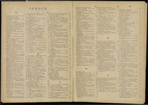 5 A . Biz . Aangroeiend fonds tot verbetering der Volkshuisvesting ( het ) 56 Aannemersbond ( Nederl .) 34 Aardrijkskundig Genootschap ( Kon . Nederl .) :.' 62 Abattoir en Veemarkt 18 Academie voor Lichamelijke opvoeding S3 Accountants ( Ned . Broederschap van ) 61 Accountantsdienst der JÖir . Belastingen 38 Administratie der Directe Belastingen , Invoerrechten en Accijnsen 87 Administratieve Bibliotheek ( Gem .). 14 Advocaat ( Gemeente ) 14 Agentschap van het Ministerie van Financiën 36 Akademie voor Beeldende Kunsten ( RijkB -) 51 Akademie v . Wetenschappen ( Konin ■ klijke ) 51 Algemeen Onderl . Ziekenfonds door en voor Werklieden 57 Algemeen Ziekenfonds voor Amsterdam 56 Algemeene Friesche Levensverzekering Maatschappij 59 Algemeene Hypotheekbank ( N.V .) .. 46 Algemeene Nederlandsche Bond van Handels - en Kantoorbedienden .. 85 Algemeene Nederl . Politie Bond .. 35 Algemeene Nederl . Vrouwen,-Vereeni ging „ Arbeid Adelt " 61 Algemeene Nederl . V rouwen-Vereeni ging „ Tesselschade " 61 AlgemeenePatroons-Ver . tot vaststelling en handhaving d . Arbeidsvoorwaarden in de Bouwbedrijven • .. 56 Algemeene Waarborg-Maatij . ( N.V .) . 47 Algemeene Winkeliers-Vereeniging .. 63 Algemeene Zaken ^ Afd .) 14 Alphabetische lijst van straten , grach ' ten , pleinen , enz . 1397 Alphabetische Naamlijst der onderscheidene beroepen en bedrijven . . 2184 Ambtenaarsbond ( Centrale Nederl ) .35 Ambtenaren van den Burgerl . Stand . 14 Ambtenaren voor Socialen Arbeid . . 19 Amstelland ( Hoogheemraadschap ).. 69 Amstelodamum ( Genootschap ) 55 Amsterdamsch Conservatorium 59 Amsterdamsch Drankweer Comité . . 63 Amsterdamsch Historisch Museum . . 52 Amsterdamsch Westelijk Entrepot .. 89 Amsterdamsche Bank ( N.V .) 47 AmsterdamscheBelangen ( Vereeniging ) 60 Amst . Buurtvereenigingen ( Bond van ) 60 Amsterdamsche - Droogdok-Maatsch . Naaml . Venn 51 Amsterdamsche Hypotheekbank ( N.V .) 47 Amsterdamsche Liqnidatiekas ( N.V .) . 48 Amsterd . Maatij . voor Jonge Mannen 68 Amsterdamsche Pers ( de ) 62 Amsterdamsche Universiteits-Vereeni ging..l •.•.•'••'• 2i Amsterdamsche Vereeniging tot het bouwen van Arbeiderswoningen .. 56 Amsterdamsche Vereeniging van OudStrijders uit de Tropische Gewesten - 67 Amsterdamsche Vereeniging voor Opleiding van Scheikundig hulppersoneel . 62 INHOUD . Blz . Amsterdamsche Volksbank ( de ) 61 Amsterdamsche Wijkverpleging ( Vereeniging ) 57 Arbeid ( Raad van ) 36 „ Arbeid adelt " ( Alg . Nederl . Vroüwen Vereeniging 61 Arbeidsbeurs ( Gemeente ) ,... 18 Arbeids-Inspectie 86 Arbeidszaken 14 Archief ( Gemeente -) 14 Architecture et Amicitia ( Genoot sohap ) 52 Armbestuur ( Ned . Israëlietisch ) 72 Armbestuur ( Port . Israëlietisch ) 72 Armenhuis ( Stedelijk ) 19 Armenhuizen en het Weduwen hof . 19 Armenkantoor ( R . K . Oude ) 72 Armenraad ( Centraal Bureau voor Maatschappelijk Hulpbetoon ) 18 Arrondissementa-Rechtbank 41 Arti et Amicitiae ( Maatschappij ).. 55 Associatie-Cassa 45 Assuradeuren te Amsterdam ( Vereen . van ) ^ A ...... 49 „ Asyl "; Bewaarpl . v . noodlijd . dieren ( Vereeniging ) 66 Avond-Ambachtsschool voor Timmer lieden .. . h*.. \ . V.-È .. , ; . 62 Avondcursus voor Electrotechnisch Opzichter en Vliegbouw 54 Avondscholen voor Schipperskinderen ( Gemeente ) 31 Avondschool voor Volwassenen 62 B . Bad -, Wasch -, Schoonmaak - en Zweminrichtingen ( Dienst der ). 21 Bank ( N.V . Amsterdamsche ) 47 Bank-Associatie 45 Bank ( N.V . De Nederlandsche ) 45 Bank ( N.V . Koloniale ) 46 Bank . ( N.V . De Surmaamsche ) 46 Bank ( N.V . De Twentsche ) 48 Bank van Leening ( Stads ) 20 Bank voor de Middellandsche Zee ( N.V . Hollandsche ) 48 Bank voor Zuid-Amerika ( Holl .) .. 48 Bankvereeniging ( Rotterd.sche ) ( N.V .) 48 Banque de Paris et des Pays-Bas 45 Bataafsche Hypotheekbank 47 Bediening van Sluizen en Bruggen . 15 Beëedigde Translateurs 42 Begraafplaatsen der Gemeente 18 Begrafenisfonds „ Ouderling Waarborgfonds " ( Algem . Nederl 85 Belangen des Boekhandels ( Ver . ter bevordering van de ) 62 Belastingen ( Gemeente ) . 15 Belastingen ( Rijks ) 87 Beroepskeuze ( Gemeent . Bureau voor ) 18 Bestedelingen ( Stads ) 19 Bestedelingenhnis ( Diac . Herv . Gem .) 70 Bestuur van den Stads - en Godshuispolder < u . 69 „ Beth-Palet ", Inrichting ter opname van ongehuwde moeders met hare kinderen 65 „ Beth-San ", Toevluchtsoord voor gevallen vrouwen en meisjes 64 Beurs voor den Diamanthandel ( Vereeniging 84 Blz . Bevolkings-Register ( Gemeentelijk ); . 15 Bevolkings-Register ( R . Kath .) 72 Bezuinigingsinspectie 15 Bibliotheek der Universiteit 24 Bibliotheek ( Openbare Leeszaal en ) . 33 Bilderdijk Museum ( Vereeniging het ). 53 Binnendijkschen BuitenvelderschenPolder ( College van het Dagelijksch Bestuur van den ) i .. v .. 69 Binnen-Gasthuis 19 Bischoffsheims-Vereeniging 66 Bisschoppelijke Klerezij 70 Blinden-Instituut 58 Boddaert-Tehuizen ( Vereeniging ) .. 64 Bond van Amsterdamsche Buurtvereenigingen • 60 Bond van Handels - en Kantoorbedienden ( Algemeene Nederl .) 85 Bond van Nederlandsche Onderwijzers 54 Bond v . Oud-Onderofficieren ( Koninkl . Nederl .) 67 Bond van Oud-Onderofficieren van Land, Zeemacht en Koloniën ( Eerste Nederlandsche 67 Bond voor Ziekenverpleging ( Nederlandsche ) 58 Bouwmaatschappij tot verkrijging van eigen woningen ( Vereeniging ) 56 Bouw - eu Woningtoezicht ( Gemeentelijk ).. 20 Brandweer 17 Brandweerfonds ( Vereen , tot Instandhouding van het ) 67 Broederschap van Accountants ( Nederlandsche ) 61 Buitengewoon Zegel 38 Buitenvelderschen Polder ( Binnendijkschen ) 69 Bureau van Consultatie 40 Bureau van den Gemeentesecretaris . 14 Bureafi ' van den Waarborg en Belasting op gouden en zilveren werken 40 Bureau « Verkiezingen ..' 14 Bureau voor Handelsinlichtingen ( Vereen .) 15 Bureau voor Partic . Ziekenverpleging . 58 Burgemeester en Wethouders 13 Burgerlijke Instelling voor Maatsghap pelijken Steun 19 Burgerlijke Stand 15 Burger Weeshuis 19 Burger Ziekenfonds 56 Burger Ziekenhuis 57 Bijbelgenootschap ( Nederl .) 59 Bi