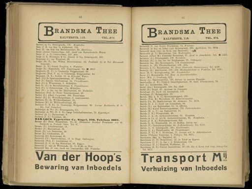 Gebruik tekstcoördinaten Transcriptie 66 67 ^ randsma Thee KALVERSTB . 115 . TEL . S72 . RANDSMA Thee KALVEBSTB . 115 . TEL . 272 . Barfoed en Co . Heerengracht , 178 . Koopttt Barg ( J . R . van den ) Ie Atjehstraat , 134 . Barg ( K . van den ) van Boetzelaerstraat , 29 . Mkctricien . Barge ( Anton ) Ceintuurbaan , 243 . Agent van Buitenlandsche Buizen . Barge ( J . A . J .) Ceintuurbaan , 243 . Arts . Barge en E . Moormann & Co . ( James ) in Liq . Keizersgracht , 482 . Bargeman ( I .) van " Woustraat , 85 . Barger ( Dr . E .) Jan Willem Brouwersstraat , 10 . Predikant bij de Ned . Hervormde Barger ( G . N .) Gerard Douplein , 4 . Winkelier . Barger ( K .) Nassaukade , 370 . Handelsagent . Tel . 35 3910 . Barghoorn ( G . J .) Ie Constantijn Huijgensstraat , 64 . Barghoorn ( Wed . P . A .) Ie Constantijn Huijgensstraat , 64 . Bargmann ( R . K .) Zeedijk , 13 . In Koloniale Waren . Bark ( D .) 2e Spaarndammerstraat , 47 . Winkelier . Bark ( J .) Fannius Scholtenstraat , 54 . Vleesehhouwer . Bark ( J .) de Witteustraat , 8 . Melkslijter . Bark Jr . ( J .) 2e Boomdwarsstraat , 6 . Vleesehhouwer . Bark ( P .) Ie Helmersstraat , 174 . Melkslijter . Bark ( W .) Ie Jan van der Heijdenstraat , 52 . Melkslijter . Barkansie ( Wed . S .) Pieter Nieuwlandstraat , 22 . Barkel ( G .) Albert Cuypstraat , 208 . Timmerman . Barkel ( H .) KI . Wittenburgerstraat , 6 . Laarzenmaker . Barkema ( G .) St . Willibrordusstraat , 22 . Barkema ( M .) St . Willibrordusstraat , 22 . Barkhuis ( C . R . B .) Ie Constantijn Huijgensstraat , 80 . Leeraar Boekhouden M . 0 < Sir . Ned . Postschool . Barkmeijer de Wit ( D .) Prinsengracht , 571 . Barkmeijer de Wit ( H . J . H .) Lange Leidschedwarsstraat , 72 . Koperslaqer . Baiieeus ( A . I .) Hartenstraat , 9 . Barleeus ( J . J .) Veerstraat , 43 . BAR-LOCK Typewriter Cy . Singel . 3Ï6 . Telefoon SOS ?. Barmat ( J .) Pnns Hendrikkade , 20—21 . ( Mercuriue ). Beèedigd Translateur voor de Russische en Poolsche Talen . Tel . 97 . Barmes ( D .) Jodenbreestraat , 16 . Barmes ( J .) Blasiusstraat , 66 . Barnar ( D .) von Zesenstraat , 49 . Barnar ( K .) Celebesstraat , 27 . Bameveld ( C .) . Keizerstraat , 35 . Barneveld ( Ch .) Hasebroekstraat , 19 . Ie Etage . Onden Barneveld ( Wed . J .) Amstelstraat , 31 . Bameveld ( J . J .) 2e Jan Steenstraat , 88 . Kapper . Barneveld ( J . van ) de Wittenkade , 94 . In Koffie en Thee . Barneveld Bzn . ( J . van ) Jacob van Lennepstraat , 193 . Winkelier . Van der Hoop's Bewaring van Inboedels Barneveld ( R . vanï Govert Flinckstraat , 74 . Winkelier . Barneveld de Roy ' en Luber ( van ) Keizersgracht , 268 . Apothekers . Tel . 9884 . Barneveld Kooij ( van ) zie Kooij ( van Barneveld ). ,, 2$g Barneveldt ( J . J .) Marnixstraat , 154 . Meubelmaker , ; Barnouw ( Albert M .) Alexander Boersstraat , 27 . Agent m Assurdnhën . lel . Mi i-óib . Barnstein ( E .) Prinsengracht , 798 . Bovenhuis . Barnstein ( H .) Ie Jan van der Heijdenstraat , 97 . Uitdragerij . Barnstein Jzn . ( H .) Keizersgracht , 719 . Commissionair . Barnstein Jz . ( M .) Utrechtschestraat , 126 . Arts . Barnstein & Co . Ruyschstraat , 85 . Eerste Elechische Diamantzagerij . Tel . 4o06 . _ Barnstijn ( B .) Kalverstraat , 100—102 . Hoedenfabrikant en Winkelier . Tel . 822 o . Baron ( H . P .) Koninginneweg , 191 . Kunstschilder . Baron ( J .) Rozengracht , 214 . Huis - en Decoralieschïlder . Baron ( Wed . J .) Overtoom , 512 . Barrau ( A .) Haarlemmerdijk , 190 . Schoen - en Laarzen Magazijn . Barrelmeijer ( J . W .) Fredevik Hendrikplantsoen , 96 . Zaak : Prinsengracht , 79 . Bart ( A .) Kinkerstraat , 343 . Battel ( Arn .) Keizersgracht , 208 . Tel . 3249 . Bartel ( H .) Singel , 30 . Agentuur en Commissie . Bartelingh ( D .) Jacob van Lennepkade , 170 . Bartelings ( P .) Bellamyp\ein , 20 . Bartels ( Mej . A . E . T .) Kloveniersburgwal , 133 . Bartels ( Wed . B .) Westerkade , 27 . Kamerverhuurster . Bartels ( Ch . H .) Raadhuisstraat , 45 . Aannemer . Tel . 3574 . Bartels ( G . J . J .) Jacob van Lennepkade , 64 . Bartels ( H .) van Eeghenstraat , 51 . In Effecten . Bartels ( H .) Kleine Kattenburgerstraat , 122 . Varkensslachter . Bartels ( H . A . F .) van Eeghenstraat , 41 . Bartels ( I . H .) Weesperstraat , 49 . Bartels ( J . A .) St . Anthoniesbreestraat , 65 . Koopman . Bartels en Co . ( J . A .) St . Anthoniesbreestraat , 65 . Kooplieden . Bartels ( J . F . A .) Rustenburgerstraat , 345 . Bartels ( L . S .) Nieuwendijk , 40 . In Bedden , Dekens enz . Bartels ( P .) Oostenburgergracht , 85 . Koffiehuishouder . Tel . 6118 . Bartels ( S .) N . Achtergracht , 148c . Kleedermaker . Bartels ( S . A .) Waterlooplein , 49 . Vleesehhouwer . Bartels ( T . T .) P . C . Hooftstraat , 71 . Leeraar ajd . \ e Ambachtsschool . Bartels ( Wilhelm ) Tulpstraat , 4 . Pedicure . Tel . 8675 . Bartelsman ( Mej . A .) Bagijnhof , 42 . Bartelsman ( C . F .) Borgerstraat , 12 . In Tabak en Sigaren . Bartelsman ( C . F .) Ie Jan v . d . Heijdenstraat , 124 . Bartelsman ( F . J .) Elisabeth Wolffstraat , 67 . Bartelsman ( G . F .) Nieuwe Looiersstraat , 29—33 . Dir . d . Eerste hed . Coóp . Inkoop Ver '. Tel . 9572 . Transport tvi Verhuizing van Inboedels