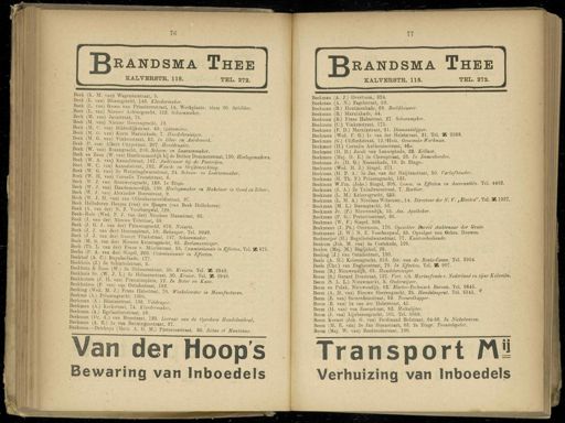 76 77 2 rand sma Thee KALVERSTR . 115 . TEL . 272 . JJrandsma Thee KALVERSTR . 115 . TEL . 272 . Beek ( K . M . van ) Wagenaaratraat , 5 . Beek ( h . van ) Bloemgracht , 143 . Kleedermaker . Beek ( L . van ) Groen van Priuslercrstraat , 14 . Werkplaats : idem 20 . Schilder . Beek ( L . van ) Nieuwe Achtergracht , 152 . Schoenmaker . Beek ( M . van ) Javastraat , 75 . Beek ( M . van ) Nieuwe Hecrengraeht , 19 . Beek ( M . C . van ) Bilderdijkstraat , 49 . Costumière . Beek ( M . G . van ) Korte Marnixkade , 7 . Handelsreiziger . Beek ( M . G . van ) Vinkenstraat , 62 . In Glas - en Aardewerk . Beek ( ï \ van ) Albert Cuypstraat , 207 . Houtdraaier . Beek ( W . van ) Rozengracht , 2 \ 6 . Schoen - en Laarzenmaker . Beek en Zoon ( W . van ) Haarlemmerdijk hij de Buiten Dommelstraat , 130 , Horlogemakers . Beek ( W . A . van ) Kanaalstraat , 197 . Ambtenaar bij , de Posterijen Beek ( W . C . van ) Kanaalstraat , 182 . Wasch - en Strijkinrichling . 5 , ™ ? V Tan ) 2e Weteringdwarsstraat , 24 . Schoen - en Laarzenmaker . Beek ( W . H . van ) Cornells Trooststraat , 6 . Beek ( W . J . van ) Brouwersgracht , 168 . Ie Etage . B 66 ! 1 £*" f ' Van ) H aal ' le mraerdijk , 130 . Horlogemaker en Makelaar in Goud en Zilver . Beek ( W . J . van ) Alexander Boersstraat , 9 . Beek ( V \. J . H . van ) van üldenharneveldtstraat , 97 . Beek Helledoren Haages ( van ) zie Haages ( van Beek Helledoren ). Beek ( A . van der ) N . Z . Voorburgwal , 128 Beek-Bode ( Wed . F . J . van der ) Nicolaes Maesstraat , 63 . ■ Beek ( J . van der ) Nieuwe Tolstraat , 68 . Beek ( J . G . J . van der ) Prinsengracht , 676 . Notaris . Beek ( J . J . van der ) Heerenstraat , 18 . Behanger . Tel . 9949 . tTi hi o Van der ) G0Tert ' Hinks traat , 157 . Schoenmaker . Beek M S . van der ) Nieuwe Keizersgracht , 65 . Reclamereiziger . Beek ( In . L . vaa der ) Frans v . Mierisstraat , 55 . Commissionair in Weden . Tel . 35 875 . Beeke ( P . A . van der ) Singel , 260 . Oommissionair in Effecten . Beekhof ( A . C .) Kuysdaclkade , 177 . Beekhuis ( J .) 3e Schinkelstraat , 2 . Beekhuis & Zoon ( W .) 3e Helmersstraat , 30 . Kruiers . Tel . 35 2949 Beekhuis Sr . ( W . J . L .) 3e Helmersstraat , 30 . Kruier . Tel . 5E 2949 Beekhuizen (. 1 . 11 . van ) Pretoriusplein , 12 . In Boter en Kaas . Beekhuizen ( P . van ) van Ostadestraat , 182 . Beekmg ( Wed . M . J .) Frans Halsstraat , 70 . Winkelierster in Manufacturen . Beekma ( A .) Prinsengracht , 1005 . Beekman ( A .) Blasiusstraat , 136 . Uitdrager Beekman ( A .) Kerkstraat , 74 . Kleedermaker . Beekman ( A .) Egelantierstraat , 58 . Beekman ( Dr . A ) van Breestraat , 120 . Leeraar aan de Openbare Handelsschool , Beekman ( A . G .) Ie van Beuningenstraat , 97 Beekman-Drichuys ( Mevr . A . G . M .) Pretormsstraat , 66 . Robes et Manteaux . Van der Hoop's Bewaring van Inboedels Beekman ( A . J .) Overtoom , 324 . Beekman ( A . N .) Fagelstraat , 59 . Beekman ( B .) Houtmankade , 69 . Beeldhouwer . Beekman ( B .) Marnixkade , 44 . Beekman ( B .) Frans Halsstraat , 27 . Schoenmaker . Beekman ( C .) Vinkenstraat , 175 . Beekman ( P . D .) Marnixstraat , 81 . Diamantslijper . Beekman ( Wed . F . G .) Ie van der Helststraat , 31 . Tel . JE 2568 . Beekman ( G .) Cliffordstraat , 12 . Huis . Gemeente-Werkman . Beekman ( H .) Cornelis Anthoniszstraat , 46a . Beekman ( H . D .) Jacob van Lennepkade , 22 . Kellner . Beekman ( Mej . H . E .) de Clercqstraat , 26 . In Dameshoeden . Beekman Jr . ( H . G .) Nassaukade , 10 . 2e Etage . Beekman ( Wed . H . J .) Singel , 271 . Beekman ( H . P . A .) Ie Jan van der Heijdenstraat , 50 . Yerlofhouder . Beekman ( H . Th . F .) Prinsengracht , 135 . Beekman W.Fzn . ( Johs .) Singel , 308 . Comm . in Effecten en Assurantiën . Tel . 4482 . Beekman ( J . A .) 2e Tuindwarsstraat , 7 . Barbier . Beekman ( L . M .) Keizersgracht , 653 . Beekman ( L . M . A .) Nicolaas Witsenatr ., 14 . Directeur der N . V . „ Electra ". Tel . SE 1327 . Beekman ( M . L .) Kaamgracht , 52 . Beekman Jr . ( P .) Nieuwendijk , 55 . Ass . Apotheker . Beekman ( P . G .) Pretoriusstraat , 66 . Beekman ( W . F .) Singel , 308 . Beekmann ( J . Ph .) Overtoom , 170 . Opzichter Bttreel Ambtenaar der Genie . Beekmann ( J . W .) N . Z . Voorburgwal , 33 . Opvolger van Gebrs . Donwes . Beekmeijer ( H .) Reguliersdwarsstraat , 77 . Kantoorbediende . Beekum ( Joh . M . van ) da Costakade , 126 . Beelen ( Mej . M .) Bagijnhoi , 29 . Beeling ( J .) van Ostadestraat , 130 . Beels ( A . H .) Keizersgracht , 616 . Sir . van de Rente-Cassa . Tel . 3954 . Beels ( Chr .) van Eeghenstraat , 70 . In Effecten . Tel . SE 907 . Beem ( B .) Nieuwendijk , 63 . Handelsreiziger . Beem ( S .) Gerard Doustraat , 137 . Vert . v/h . Marinefonds v . Nederland en zijne Koloniën . Beem ( S . L . L .) Nieuwmarkt , 9 . Onderwijzer . Beem en Polak . Nieuwendijk , 63 .' Electro-Technisch Bureau . Tel . 9645 . Beem ( A . H . van ) Nieuwe Heerengracht , 25 . Handelsagent . Tel . 5511 . Beem ( E . van ) Saenredamstraat , 59 . Tooneelkapper . Beem ( E . van ) Ie van der Helststraat , 41 . Beem ( H . van ) von Zesenstraat , 82 . Melkslijter . Beem ( J . vaa ) Lvjnbaansgracht , 101 . Tel . 5058 . Beem Koenot ( Joh . G . van ) Ferdinand Bolstraat , 64-66 . In Nicielwaren . Beem ( M . E . van ) 2e Jan Steenstraat , 63 . 2e Etage . Toonèelspeler . Beem ( Mej . W . van ) Brederodestraat , 100 . Transport Mü Verhuizing van Inboedels