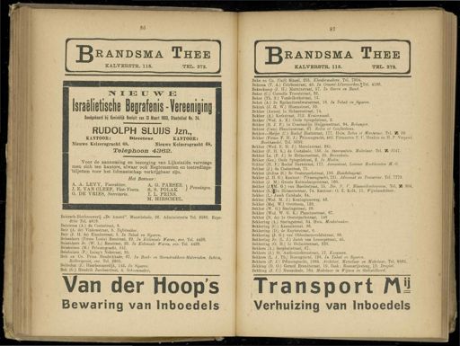 87 RANDSMA Thee KAL VERSTE . 115 . TEL . 272 . IX I E U T ?" JE israëlietische Begrafenis - Vereenigïng Goedgekeurd bij Koninklijk Besluit van 13 Maart 1833 , Staatsblad No . 24 . RUDOLPH SLUIJS Jzn ., KANTOOR : Directeur . KANTOOR : Nieuwe Keizersgracht 68 . Nieuwe Keizersgracht 68 . Teleplioon 4363 . Voor de aanneming en bezorging van Lijkstatiën vervoege men zich ten kantore , alwaar ook Reglementen en toetredings- ' biljetten voor het lidmaatschap verkrijgbaar zijn . Het Bestuur : A . A . LEVY , Voorzitter . A . G . PARSER i D . J . E . VAN OLEEF , Vice-Voorz . S . S . POLAK / Pennm 9m . G . DE VRIES , Secretaris . I . L . PRINS . M . HIRSCHEL . Beiersch-Bierbrouwerij „ De Amstel ". Mauritskade , 26 . Administratie Tel . 2080 . Expe- ditie Tel . 4818 . Beintema ( A .) da Costastraat , 8 . Beir ( A . de ) Vinken straat , 8 . Tafelmaker . Beir ( J . H . de ) Elandsstraat , 5 . In Tabak en Sigaren . Beisenherz ( Firma Louis ) Reestraat , 22 . In Koloniale Waren , enz . Tel . 4429 . Beiséïiherz Jr . ( W . L .) Reestraat , 22 . In , Koloniale Waren , enz . Tel . 4429 . Beishuizen ( M .) Prinsengracht , 241 . Beishuizen ( P .) Laing's Nekstraat , 35 . Beit en Co . Prins Hendrikkade , 6'7 . In Boek - en Steendrukkers-Materialen , Inkten , Rollenspecie , enz . Tel . 2805 . Beitschat ( J .) Haarlemmerdijk , 142 . Jn Sigaren . Bek ( G .) Hendrik Jacobszstraat , 4 . Schoenmaker , Van der Hoop's Bewaring van Inboedels randsma Thee KALVERSTB . 115 . TEL . 272 . Beke en Co . ( Carl ) Singel , 255 . Kleedermakers . Te ). 7304 . Bekema ( T . A .) Celebesstraat , 40 . In Cement-lJzerwerken^zl . 4186 . Bekenkamp ( J . H .) Marnixstraat , 57 . In Garen en Band . Beker ( C .) Cornelis Trooststraat , 32 . Beker ( Th . S .) Vondelkerkstraat , 15 . Beket ( A .) 2e Egelantiersdwarsstraat , 18 . In Tabak en_Sigaren . Bekink ( J . G . W .) Bloemstraat , 50 . Bekker ( Anton ) Ie Helmersstraat , 74 . Bekker ( A .) Kerkstraat , 212 . Kruierszaak . Bekker ( Wed . A . E .) Oude Spiegelstraat , 2 . Bekker ( B . J . F .) Ie Constantijn Huijgensstraat , 94 . Behanger . Bekker ( Cato ) Planciusstraat , 67 . Robes et Confections . Bekker—Meijer ( C .) Roelof Hartstraat , 177 . Huis . Robes et Manteaux . Tel . 5B 39 . Bekker ( Firma F . H . J .) Prinsengracht , 462 . Firmanten F . C . Henkus en H . P . Verpont . Boekhandel . Tel . 3639 . Bekker ( Wed . F . H . J .) Marnixstraat , 381 . Bekker ( F . H . K .) da Costakade , 136 . In Assurantiën . Makelaar . Tel . K 3147 . Bekker Lz . ( F . J .) 3e Helmersstraat , 25 . Bovenhuis . Bekker ( Gez .) Oude Spiegelstraat , 2 . In Modes . Bekker ( H . F .) Roelof Hartstraat , 177 . Accountant , Leeraar Boekhouden M . 0 . Bekker ( J .) da Costastraat , 71 . Bekker ( Julius H .) 3e Oosterparkstraat , 193 . Handelsagent . Bekker ( J . H . G .) Kantoor : Prinsengracht , 721 . Advocaat en Frocureur . Tel . 7779 . Bekker ( J . M .) Groote Kattenburgerstraat , 160 . Bekker ( J.fM . G .) van Baerlestraat , 15 . Dir . N . V . Blaauwhoedenveem . Tel . 5B 904 . Bekker ( L.)jjle Helmersstraat , 74 . Kantoor : O . Z . Kolk , 11 . Wijnhandelaar . Bekker ( L .) Jacob Catskade , 34 . Bekker ( Wed . M . J .) Koninginneweg , 43 . Bekker ( Mej . W .) Overtoom , 123 . * \ Bekker ( W . G .) Staringstraat , 26 . Bekker ( Wed . W . G . K .) Planciusstraat , 67 . Bekker ( N . de ) Ie Oosterparkstraat , 148 Bekkering ( A .) Staringstraat , 34 . Huis . Meubelmaker . Bekkering ( C .) Kanaalstraat , 86 . Bekkering ( D .) de Ruyterstraat , 6 . Bekkering ( J . G .) van Oldenbarneveldtstraat , 99 . Bekkering Jr . ( L . J .) Jacob van Lennepstraat , 45 . Bekkering ( O . H .) Ie Helmersstraat , 323 . Bekkers ( A .) Sarphatistraat , 67 . Bekkers ( J .) St . Anthoniesbreestraat , 17 - Koopman . Bekkers ( L . J . Th .) Rozengracht , 198 . In Tabak en Sigaren . Bekkers ( P . J .) Prinsengracht , 1065 . Architect , Metselaar en Makelaar . Tel . 8865 . Bekking ( D . O .) Gerard Brandtstraat , 10 . Zaak : Rosmarijnsteeg ', 12 . Drogist . Bekking ( J . C .) Nassaukade , 164 . Makelaar in Wijnen en Gedistilleerd . Transport Mü Verhuizing van Inboedels