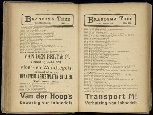 90 91 J^randsma Thee KALVERSTR . 115 . TEL . 272 . " Rrandsma Thee TEL . 272 . KALVERSTR . 115 Bellwinkel ( J . H . H .) Wouwermanstr ., 6 . Secretaris b/h Koninklijk en Keizerlijk Consulaat van Oostenrijk-Hongarije . Belmont ( C . J .) Prinsengracht , 6 . Kapper . Belmont ( Wed . E . C .) Noorderstraat , 92 . Kapperszaak . Bels . ( H . F .) Saxen Weimarlaan , 10 . Kantoorbediende . Bels Jr . ( J . G .) Keizersgracht , 588 . Notaris . Tel . 2184 . Bels ( L . P .) Nieuwe Prinsengracht , 18 . Handelsagent . Bels ( Wed .) Pieter Langendijkstraat , 41 . Huis . Belser ( A . J .) Jacoh van Lennepkade , 212 . Schoen - en Laarzenmaker Belser ( G . P .) Bilderdijkstraat , 116 . Belser ( W . F .) Zandpad , 7 . Belt ( D .) Ie van Swindenstraat , 78 . Belt ( A . van de ) Nicolaes Maesstraat , 63 . Leeraar M . O . Belt ( D . van de ) Spuistraat , 240 . Behanger en Stoffeerder . Tel . 7464 . Belt ( B . van den ) Hnidekoperstraat , 23 . Belt ( J . M . van den ) Ceintuurhaan , 193 . Belt & Co . ( van den ) Prinsengracht , 852 . In Behangselpapier . Tel . 7644 . Belt & Co . ( van den ) Prinsengracht , 862 . VAN DEN BELT & C °. Priösengrtaeht 862 . Vloer - en Wandtegels . Speciaal adres voor BRANDVRIJE ASBESTPLATEN EN LEIEN . ' Telefoon 7644 . Bemelman ( P . W .) van Houweningenstraat , 69 . Schilder . Bemmel ( Abr . van ) Zeilstraat , 2 . Bemmel ( C . V . van ) van Eeghenstraat , 3 . * Bemmel ( Dames van ) Reguliersgracht , 51 , Bemmel ( H . van ) van der Hoopstraat , 33a . Bemmel ( J . W . van ) 3e Weteringdwarsstraat , 10 . Van der Hoop's Bewaring van Inboedels Bemmel ( K . van ) Anjeliersstraat , 67 . 20 . Gemeente-Ambtenaar . Boekhandel . Bemmel ( M . van ) Nieuwe Teertuinen , Bemmel ( M . van ) Ruysdaelkade , 183 . Bemmel ( N . van ) Ceintuurbaan , 204 . Bemmel Pzn . ( P . van ) Saxen Weimarlaan , 36 . Comm . in Effecten . Bemmel ( P . C . V . van ) Prinsengracht , 616 . Makelaar in Effecten enz . Tel . 3506 . Bemmel Suijck ( R . J . C . van ) Weesperzijde , 13 . Bemmel ( W . H . van ) Ceintuurbaan , 204 . Ben ( A . van der ) van Ostadestraat , 44 . Ben ( C . van der ) Flasébroekstraat , 25 . Diamantbewerker . Ben ( L . van der ) Overtoom , 475 . Kapper . Benard ( A .) Egelantiersgracht , 158 . In Lingeries . Benard ( C . H .) Haarlemmerstraat , 49 . Benard ( F £.) Ie Atjehstraat , 158 . Kleedermaker . Benard ( J .) ter Haarstraat , 13 . Schilder . Benard ( J .) Ruysdaelkade , 51 . Benard ( Jac .) Ie Hugo de Grootdwarsstraat , 136 . In Verlichtimjsartikelen . Benard ( J . F .) Frederik Hendrikstraat , 126 . Benard ( L .) Lindengracht , 171 . Metselaar en Aanspreker . Benard ( P . J .) J . J . Cremerplein , 32 . Fabrikant . Benavente ( A . J .) van Woustraat , 143 . Benavente ( A . L .) Euyschstraat , 80 . Diamantbewerker . Benavente ( B . A .) Blasiusstraat , 38 . Roosjesslijper . Benavente ( Jac .) Nieuwe Kerkstraat , 61 . Huisschilder . Benavente ( J .) Cornells Anthoniszstraat , 79 . In Tegelplaten . Benavente ( J . A .) Blasiusstraat , 34 . Makelaar . Benavente ( Firma Simon ) Warmoesstraat , 140 . Fabriek van Borstelwerk . Tel . 9312 . Bend ( Firma W . van der ) Quellijnstraat , 80 . Banketbakker . Tel . * 1282 . Bend ( W . van der ) Sarphatipark , 32 . Bend & Zonen ( W . van der ) Albert Cuypstraat , 175-179fl . Koekfabrikanten . Tel . K 1469 . Benda ( H . H .) Pontanusstraat , 9 . Schoen - en Laarzenmaker ., Bende ( W . J .) Ie Spaarndammerstraat , 39 . Lood - en Zinkwerher . Tel . 9988 . Bendel ( C . N .) Marnixkade , 101 . Beursopzichter . Benden ( G . H . van den ) Ie Jan Steenstraat , 54 . Kapper . Bender ( C . C .) Beurspassage , 1 en 5 . Handel in Piano's , Orgels , enz . Tel . 853 . Bender ( G . W .) da Costastraat , 94 «. Bender ( M . J .) Commelinstraat , 34 . Bendien ( Wed . A . W .) Gelderschekade , 41 . Bendien ( Joh .) Koninginneweg , 160 . Kantoor : Damrak , 60 . Dir . Bureau ter Bevordering v d . Nederl . Handel en Industrie . Tel . 1982 en 4126 . Bendien & Co . ( Leon ) Spuistraat , 105 . Fabrik . van Machin . gebreide goederen , kousen , gasgloeilichtweefsel en wollen garens . Bendien ( M .) den Texstraat , 38 . Transport Mü Verhuizing van Inboedels