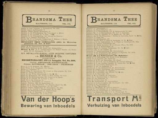 Gebruik tekstcoördinaten Transcriptie 92 JJ RANDSMA Thee KALVERSTR . 115 . TEL . 272 * i Bendien en Loeté . Tulpstraat , 4 . Diamanthandel . Tel . 4054 . Bendiks ( Jacques ) Leidschegracht , 16 . Beneditty ( Dames ) Plantage Muidergracht , 41 . Beneditty ( A . de ) Willemsparkweg , 144 . Commissionair in Effecten . Beneditty ( J . de ) Veerstraat , 31 . Ie Etage . • ■•**:* rtj | Beneditty ( N . de ) Willemsparkweg , 144 . Advocaat en Procureur . Beneka ( J . F .) Balthaaar Floriszstraat , 55 . Beneker ( Ph . J .) Ie Constantijn Huijgensstraat , 3 . Makelaar in Effecten . Benet ( J .) Hemonystraat , 52 . Onderwijzer in Talen . BEÏGALE » THEE COMPAOWIE ( SE ) Se Wetering- plantsoen 15 . Tel . SK 3759 . Bengen ( H . H .) Haarlemmerweg , 59 . Smid . Benier ( Gebr .) Kerkstraat bij den Amstel , 445 . Rijtuigschilders . Benier & Co . ( N . V . Installatie-Bureau voor Moderne Kantoren v/h .) Heeren- gracht , 433 b/h . Koningsplein . Tel . 300 . N.V . INSTALLATIE-BUREAU VOOR MODERNE KANTOREN v/h . BENIER & Co . HOOFDKANTOOR : HEEREJTGBACHT 433 b/h . Koningsplein . Tel . ITo . 300 . FABRIEK : AMSTERDAM , SCHINKELKADE . Filialen : ROTTERDAM — DEN HAAG — GRONINGEN . Benier Jr . ( J . J .) Kerkstraat , 445 . MÈkelaar . Benier W.Lzn . ( J . J .) Weesperzijde , 108 . Chemihr . Benima ( C .) Vrolikstraat , 42 . Benima ( Firma D .) Keizersgracht , 307 . Grossier in Mode-Artikelen . Tel . 7110 . Benima ( F .) Nieuwe Heercngracht , 17 . Benima ( L .) Jan Willem Brouwersstraat , 6 . Tel . X 290 . Benima ( L .) Keizersgracht , 307 . Grossier in Mode-Artikelen . Tel . 7110 . Benima ( H . M .) Rustenburgerstraat , 266 . Leeraar in het Dansen . Beninga ( H . P .) Tolstraat , 99 . In Koffie en Thee . . Benink ( N .) Ie Jan Steenstraat , 55 . Benistant ( S . J .) Lauriergracht , 31 . Goudsmid . Benjamin — Wertheim ( Wed . BJ Sarphatistraat , 82 . Benjamin ( B . E .) Prins Hendrikkade , 147 . Koopman , Export . Tel . 962 . Benjamin ( E . E .) Plantage Franschelaan , 135 . Tel . 5780 . Benjamins ( Andries ) Sarphatistraat , 84 . DiamantUover . Tel . 7691 . Benjamins en Co . ( Andries ) Ie Boerhaavestraat , 30 . Tel . 4067 . Benjamins ( H .) Swammerdamstraat , 2 . Kantooriediende . Benjamins en Zn . ( 1 .) Damstraat , 16 . In Tapijten . Benjamins ( J .) Willemstraat , 178 . In Bieren enz . Van der Hoop's Bewaring van Inboedels 93 JJrandsma Thee KALVERSTR . 115 . TEL . 272 . Benjamins ( J .) Alexanderplein , 9 . Benjamins ( J .) Nieuwe Kerkstraat , 118 . Benjamins ( J .) Ie Oosterpavkstraat , 216 . In Passementerieè'n . Tel . 8638 . Benjamins Mz . ( J .) Ie Oosterparkstraat , 230 . Lood - en Zinkwerker . Benjamins & Zoon ( J .) Damstraat , 16 . In Tapijten enz . Tel . 2207 . Benjamins ( Jac.'H .) Nic . Witsenstraat , 7 . Makelaar in Assurantiën , Expert . Tel . X 934 . Benjamins ( L .) Singel , 361 . Benjamins ( L .) Brouwersgracht , 143 . Benjamins—Ricardo ( Wed . L .) Pieter de Hoochstraat , 10 . Tel . X 3343 . Benjamins en Co . ( L .) Gelderschekade , 17 . In Wijnen en Gedistilleerd . Tel . 7864 . Benjamins ( 31 .) Johannes Verhulststraat , 206 . Benjamins ( 31 .) Nieuwe Kerkstraat , 39 . In Koloniale Waren . Tel . 9987 . Benjamins ( M . J .) 2e Boerhaavestraat , 55 . Benjamins ( Nardus J .) Johannes Verhulststraat , 151 . Tel . SE 1421 . Benkemper ( Mej . A .) da Costakade , 72 . Benkemper ( F .) Amstelveenscheweg , 330 . Kantoorbediende . Benkemper ( F . H .) Prinsengracht , 524 . Behanger en Stoffeerder . Tel . 10792 . Benkemper ( J . F .) Raadhuisstraat , 33 . Kapper . ■ Ieiiiie ( H . Ii .) Tollensstraat , 83 . MaKelaar . Benneke ( J . F .) Valeriusstraat , 110 . Leeraar in het Boekhouden . Benneke ( P . F .) Spuistraat , 124 . Depéthouder . Bennekom ( B . E . W . van ) Marnixstraat , 159 . Drogist . Bennekom Jr . ( B . E . W . van ) de Clercqstraat , 85 . Gemeente-Ambtenaar . Bennekom ( D . J . van ) Ferdinand Bolstraat , 36 . Orpheus Bar . Tel . SK 1043 . Bennekom ( G . van ) Frederik Hendrikstraat , 42 . Bennekom ( J . van ) van Speijkstraat , 36 . Bennekom ( K . L . van ) Hasebroekstvaat , 30 . Diamantbewerker . Bennema ( B .) Frederik Hendrikstraat , 104 . Sigarenioinkelier . Bennema ( B . J .) Nassaukade , 55 . Expediteur . Bennema ( W .) Ceintuurbaan , 334 . Detective . Tel . ' M , 1225 . Bennenk ( N . J .) Borgerstraat , 170 . Benner ( J . B .) da Costakade , 29 . Onderwijzer . Benner ( P .) Ie Rozendwarsstraat , 2 . Timmerman . Bennes ( D .) van Ostadestraat , 72 . Bennes ( H . J .) Diisartstraat , 12 . Bennetz ( E .) Linnaeusstraat , 47 . Kantoorbediende . Bennewitz ( J . F .) Brouwersgracht , 242 . Meubelmaker . Tel . 10301 . Bennewitz ( O . P .) Valeriusstraat , 16 . Bennik ( P . Th .) Wagenaarstraat , 36 . Benning ( A .) Slarnixkade , 66 . Gemeente-Ambtenaar . Benninga ( D . J .) Vrolikstraat , 92 . In Drogerijen en Verfwaren . Bennink ( Cors . H .) Weesperstraat , 91 . Sigarenmagazijn . Bennink — van Rijszelenburg ( 3Iej . A . C . A .) Weesperstraat , 91 . Bennink Jr . ( D . J .) Ie Sweelinckstraat , 9 . Schoen - en Laarzenmaker . Transport Mü Verhuizing van Inboedels