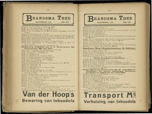 Gebruik tekstcoördinaten Transcriptie 106 10 ? Jrandsma Thee KALVERSTB ,. 115 . TEL . 272 . *- J Berlage ( C .) Nes , 45 . Makelaar in Tabak . Tel . 10672 . Berlage ( C . J . H .) Palestrinastraat , 27 . Tel K 1667 . Berlage ( Gebr .) Keizersgracht , 132 . Kooplieden . Tel . 5410 . Berlage Nz . ( H . P .) Amsteldijk , 77 . Tel . X 2084 . Kantoor Beurspassage , 8 . Tel . 6772 . Architect . Berlage ( Jos .) Prinsengracht , 596 . Tel . 5929 . Berlekom ( W . Bs . van ) Kaaclhuisstr.2-6 . Kamer 16 . Hout-Agentuur-en Commissieh . Tel . 1874 . Berliner Hagel Verzekering Maatschappij van 1832 . den Texstraat , 40 . Tel . 35 1028 . Berliner Land- n . Wasser Transport Veje . Ges . opger . in 1841 . Rokin , 69 . Tel . 1028 . Riv .- Verz . Berling ( Herm .) Lauriergracht , 93 . Hoedenmaker . Berling ( Karl J .) Lauriergracht , 93 . Agentuur - en Commissiehandel . Berling ( Louis ) Brederodestraat , 78 . Vertegenwoordiger in Lakens en Sloffen , voor engros en export . Berlinische Feuer Versicherungs Anstalt . Heerengracht , 456 . BKBLITÏS(IIO«l , der ST . V . Berl itz-School Mij . Keizersgracht , 300 . Tel . 8515 . Berlitz School of Languages ( The ) Heerengracht , 451 . Tel . 3286 . Berlijn ( Mej . C .) Nieuwe Heerengracht , 135 . Tension . Berlijn ( I .) Lepelstraat , 9 . Diamantbewerker . Berlijn ( J .) Sarphatipark , 55 . Berlijn ( L .) Koningstraat , 20 . In Koek en Banket . Berlijn ( L .) Andreas Bonnstraat , 23 . Diamantbewerker . Berlijn ( L . J .) Saxenburgstraat 5 . Kantoorbediende . Berlijn ( Gebr . N . en M .) Zeedijk , 117 . Koekbakkers . Berlijn ( Philip ) Tilanusstruat , 69 . Berlijnsche Levensverzekering-Maatschappij . " Weteringschans , 82 . Tel . ' I . 3425 . Berman ( G .) Valeriusstraat , 16 . Bermond ( W .) Bloemstraat , 130 . Bernard ( J .) Wagenaarstraat , 65 . In Tabak en Sigaren . Bernard ( S .) Binnenkant , 46 . ' Bernarts ( P .) van Boetzelaerstraat , 81 . Letterzetter . Bernau ( Otto ) Heerengracht , 566 . Directeur der Boll . Verkoopafdeelinq der A . E . G . Tel . 5637 en 10635 . Berndorfer Metallwarenfabrik Arthur Kriipp . Prinsengracht , 464 . Tel . 5461 . Berndsen ( J . B . Th .) Korte Marnixstraat , 5 . Bierhuishouder . Berne ( J . van ) da Costakade , 111 . Makelaar . Bernefeld ( Franz ) Ie Hclmersstraat , 28 . Ber'net en Co . ( N . V . Amst . IJzer - en Metaalh . v/h .) Amstel , 135 . IJzerhandel . Tel . 981 . Bernhard ( As .) Zwanenburgwal , 94 ^ Beruhard ( A . H .) Bustenburgerdwarsstraat , 2 . Bernhard ( Wed ., C .) Gerard Brandtstraat , 2 . Bernhard ( D .) Joh . Verhulststraat , 131 , Kant . Keizersjr ,, 171 . Lid d.fa . Willem van Mijn . Vertegenwoordiger van Builenlandsche Huizen . Tel . 2621 . Bernhard ( F . J .) Damrak , 45 . Makelaar in Effecten en ' Assurantiën . Tel . 9742 . Van der Hoop's Bewaring van Inboedels JJrandsma Thee KALVERSTR . 116 . TEL . 272 . Bernhard ( G . A .) Gerard Doustraat , 23 . Bernhard ( G . L .) van Eeghenstraat , 58 . In Effecten . Bernhard ( Firma H .) Lijnbaansgr ., 304 . Scheepsbonwm . en V aariuigverhtmrder . Tel . 1073 . Bernhard ( H .) Graaf Florisstraat , 19 . Bernhard Jr . ( H .) Leidschekadc , 67 . Bernhard ( II . L .) Laing's Nckslraat , 57 . Bernhard ( K . E .) Amstelveenscheweg , 174 . Kant . 3e Schinkelstraat 33 . Werktuigkundige . Tel . K 1910 . Bernhard ( N . A .) Lijnbaansgraeht , 304a . Kantoor : idem 304 . Scheepsbouwk.-Expert . Bernheim Frères . da Costakade , 57 . Modes en Gros . Tel . % 3952 . Bernsen ( C .) Sumatrastraat , 70 . Bernstein ( Jac .) 2e Jan Steenstraat , 21 . Agent v . Buitenl . Huizen . Berntrop(J.C .) Nic.Beetsstr ., l50 . Scheikundig'e , leAss . Scheik . bjd.Gem . Gezondheidsdienst . Berreklouw ( D .) Overtoom , 504 . Uitgever . Tel . X 2979 . Berreklouw ( Herm .) Reguliersbreestraat , %. Publiciteit . Berrier ( W .) Ferdinand Bolstraat , 120 . Berring ( W .) Jan Pieter Heijestraat , 85 . Huis - en LeUerschilder . Berrington ( Benj . S .) Leidschekade , 55 . English Teacher . Bersma ( H . J . B .) Emmastraat , 12 . Berta ( H . W .) " Weesperzijde , 78 « — 785 . Caféhouder . Tel . 7057 . Ruime Kegelbaan , ( Amstelltier ). Bertelman ( H . H .) van Ostadestraat , 62 . Bertelman ( Mej . M .) Hobbemastraat , 3 . Ged . Pianoleerares . ■ Bertels ( B . H .) ' t Huis „ De Hinde ", Omval bij de Weesperzijde . Tel . 4908 . Bertels en Co . Veekoek - en Meelfabr . „ De Hinde ", Omval bij de Weesperzijde . Tel . 4908 . Bertels ( E . J .) da Costastraat , 119 . Berten ( H .) Fabriek Fokke Simonszstraat , 62—68 . Filiaal : Sarphatipark 117 . Fabrikant van Luxe Artikelen . Tel . SE 3978 . Berten ( II .) JKoUUe Simonszstraat , BS — 68 . Fabrikant in i " Theebladen , alle soorten Schilderyen , M*ortretver - grootingen en Inlijttn erk . Tel . Kiiiil 3978 . Berthauer ( Wed . M .) Ie Boomdwarsstraat , 10 en 12 . Uitdragerij . Bertina ( B .) Kinkerstraat , 297 . Bertina ( J.j Jan Pieter Heijestraat , 96 . Schoenmaker . Bertke ( C . H .) Groen van Prinstererstraat , 3 . Kleedermaker . Bertke ( J . H .) Bloemgracht , 193 . 3e Etage . Behanger . Bertling ( L . J . A .) Barentszplein , 3 . Berton ( Mej . A . W .) St . Luciënsteeg , 27 . Berton ( D . H . D .) Ie Helmersstraat , 102 . Lid der Firma Gimpel en Berton . Bertram ( A .) Groen van Prinstererstraat , 55 — 57 . Broodbakker . Bertram ( A .) Oude Hoogstraat , 21 , hoek Bethaniëndwarsstraat . Bontwerker . Winkeliet in Pelterijen , Heeren-Artikelen en Handschoenen . Bertram Jr . ( G . L .) Ie Hclmersstraat , 181 . Transport l\ï Verhuizing van Inboedels