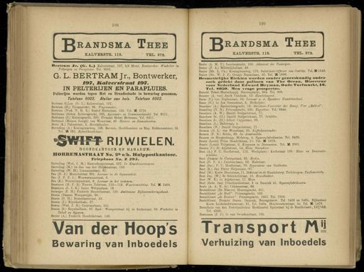 108 109 "^ randsma Thee KALVEBSTB . 116 . TEL . 272 . Bertram Jr . ( Gr . Ij .) Kalverstraat , 197 , b/d Munt . Bontwerker . Winkelier in ' Pelterijen en Parapluies . Tel . 8002 . G . L . BERTRAM Jr ., Bontwerker , 199 , Kalverstraat 199 . IN PELTERIJEN EN PARAPLUIES . Pelterijen worden tegen Mot en Brandschade in bewaring genomen . Telefoon 8002 . Atelier aan huis . Telefoon 8002 . Bertram G.Lzn . ( G . L .) Kalyerstraat , 197 . Bertram ( H .) Trompstraat , 35 . Wagenmaker . Bertram ( Wed . W . G . E .) Roelof Hartstraat , 165 . Tel . 5B 3779 . Bertrams ( Gebrs ) Keizersgracht , 230 . Agentuur - en Commissiehandel . Tel 8211 . Bertrams ( J .) Keizersgracht , 230 . Firmant Gebrs Bertrams . Tel . 8211 . Bertrand ( Maison Joseph ) van Woustraat , 46 . Heeren - en Dameshoeden . Berts ( K .) Palmstraat , 5 . Borstelmaker . Berveling ( A .) Koninginneweg , 158 . Bovenh . Hoofdkantoor en Mag . Hobbemastraat , 25 . Tel . SR 295 . Rijwielhandelaar . =§ W1 » RIJWIELEN . HOOFDKANTOOR EN MAGAZIJN : HOBBEMASTRAAT tfo . 2 " o/h . Ilulppostkaiitoor . Telephoon No . X 295 . Berveling ( Wed . J . M .) Rustenburgerstraat , 227 . In Kruidenierswaren . Berveling ( M .) Ie Jan van der Heijdenstraat , 150 . Berveling ( W . H .) Linnaeusstraat , 97 . Bes ( D . J .) Marnixstraat 381 . Leeraar in de ( gymnastiek . Bes ( J . P . F . li .) Wouwermanstraat , 9 . Bes ( K .) Wouwermanstraat , 9 . Leeraar in het teekenen . Besancon ( H . F . J .) Nieuwe Tolstraat , 113—115 . Waschinrichting . Tel . X 2466 . Besancon ( J . J . G .) Saxen Weimarlaan , 16 . Besanger ( F . H .) Frederik Hendrikstraat , 120 . Ambtenaar Rijksverzekeringsbank . Besera ( Dames ) Weesperzijde , 80 . Besem ( G . H .) Domselaerstraat , 23 . Besem ( J .) Ruysdaelkade , 37 . Besem ( Wed . J . H .) Ceintuurbaan , 255 . Besem ( S .) Ruysdaelkade , 37 . Zaak : Weesperstraat bij de Kerkstraat , 69 . Winkelier in Tabak en Sigaren . Besier ( A .) Frederik Hendrikstraat , 140 . Van der Hoops Bewaring van Inboedels m , i i mi • i i i ^ J^randsma Thee EALVEBSTE . 115 . TEL . 272 . C . J Besier ( A . M . F .) Lauriergracht , 106 . Adsistent der Posterijen . Besier ( F . A .) Bilderdijkstraat , 49 . Besier ( Mr . L . Ch .) Koninginneweg , 178 . Substituut-Officier nan Justitie . Tel . K 1546 . Besier ( Mr . W . J . J .) Oranje Nassaulaan , 40 . Tel . 5B 1686 . Besmettelijke Kiekten worden zonder geneeskundig onder- zoek gedekt door polissen van Tlie Ocean , Directeur voor Nederland Edward Heyman . Oude Turfmarkt , 16 . Tel . 80.10 . TIen vrage prospectus . Besoeki Tabak-Maatschappij . Heerengraeht , 364 . Tel . 909 . Besouw ( A . van ) Jacob Catskade , 12 . Handelsagent . Besse ( E .) van Eeghenlaan , 34 . Leeraar a . d . Openbare Handelsschool . Besse ( 11 .) Ie Jan Steenstraat , 6 . Melkslijter . Besselaar ( A .) Egelantiersgracht , 13 . Directeur-Voorzitter der Evang . Ver . „ Beth-el ". Besseling ( N . R .) Prinsengracht , 530 . Bxporteur . Tel .' 9544 . Besselsen ( A . W .) Daniël Stalpertstraat , 77 . Besselsen Sr . ( H .) Daniël Stalpertstraat , 77 . Schilder . Besselsen Jr . ( H .) Albert Ouypstraat , 68 . Besselsen ( L .) Delistraat , 4 . Besselsen ( W .) Daniël Stalpertstraat , 77 . Bessem ( D . L .) van Woustraat , 25 . Koffiehuis houder . Bessem ( F . N .) Rokin , 30 . In Assurantiën . Bessem en Hoogenkamp . Molsteeg , 4 . Sigarenfalrikanten . Tel . 3426 . Bessie ( Louis ) Prins Hendriklaan ^ 11 . Tel . X 1678 . Bessie ( Louis ) Tulpstraat , 2 . Koopman in Diamanten . Tel . K 2001 . Besson ( C .) 2e Atjehstraat , 14 . Huis . Stucadoor . Best ( A .) P . C . Hooftstraat , 112 . Werkplaats : Kerkstraat 103 . Huis - en Decoratie- schilder . Best ( Dames ) de ölercqstraat , 63 . Modes . Best ( H . I '. A .) Ceintuurbaan , 83 . Makelaar . Best ( Jac .) P . C . Hooftstraat , 79 . Reparateur van Oudheden . Best ( K .) Jan Pieter Heijestraat , 87 . Best ( M .) Korte Best Jzn . ( W .) 3e Schinkelstraat , 10 . Broodbakker . Best ( W . E .) 1c Atjehstraat , 17 . Huis . Best ( Gebr . van ) Utrechtschestraat , 3 en Damrak 41 . Sigarenfalrikanten . Beste ( A . A . N . de ) Celebesstraat , 66 . Besteldienst ( De Nieuwe ) Heerengracht , 251 . Besteldienst „ de Duif ". Prinsengracht , 529 . Besteldienst „ de Zwaluw ". Prinsengracht , 1051 . Tel . 7903 . Besteldienst . Premier Stores . Damrak , Beursgebouw . Tel . 5403 en 5405 . Bijkantoor Korte Leidschedwarsstraat , 31 . Tel . 5404 . Hondecoeterstraat , 5a . Tel . 5B 1479 . Bestelhuis van den Nederlandschen Boekhandel . Spuistraat bij de Raadhuisstr ., 157/159 . Tel . 4553 . Besteman ( J . J .) Ie van Swindenstraat , 105 . Transport Mü Verhuizing van Inboedels