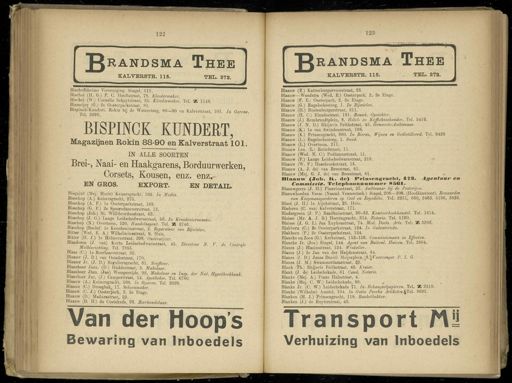 Gebruik tekstcoördinaten Transcriptie 122 123 JJrandsma Thee KALVERSTR . 115 . TEL . 272 . ^ randsma Thee KALVERSTB . 115 . '\, TEL . 272 . Bisehoffsheims Vereeniging . Singel , 512 . Bischot ( H . G .) P . C . Hooftstraat , 78 . Kleedermalcer . Bischot ( W .) Cornells Schuytstraat , 85 . Kleedermalcer . Tel . ' M , 1148 Bismeijer ( G .) 2e Oosterparkstraat , 81 . Bispinck-Kundert . Rokin bij de Watersteeg , 88—90 en Kalverstraat , 101 . In Garens . BISPINCK KÜNDERT , Magazijnen Rokin 88-90 en Kalverstraat 101 . IN ALLE SOORTEN Brei -, Naai - en Haakgarens , Borduurwerken , Corsets , Kousen , enz . enz . EN GROS . EXPORT . EN DETAIL . Bisquint ( Mej . Marie ) Keizersgracht , 595 . In Modes . Bisschop ( A .) Keizersgracht , 375 . Bisschop ( A . F .) Ie Oosterparkstraat , 169 . Bisschop ( G . F .) 2e Spaarndainmerstraat , 13 . Bisschop ( Joh .) St . Willibrordusstraat , 63 . Bisschop ( J . G .) Lange Leidschedwarsstraat , 56 . In Kruidenierswaren Bisschop ( N .) Overtoom , 520 . Handelsagent . Tel . SR 3746 . Bisschop ( Roelof ) Ie Keucheniusstraat , 2 . Reparateur van Rijwielen Bitter ( Wed . E . A .) Wilhelminastraat , 9 . Huis . Bitter ( H . J .) Ie Helmersstraat , 208 . Onderwijzer . Blaaderen ( J . van ) Korte Leidschedwarsstraat , 45 . Directeur N . V . de Centrale Melkmrichting . Tel . 7855 . Blaas ( C .) Ie Boerhaavestraat , 32 . Blaaser ( J . D .) van Ostadestraat , 170 . Blaaser Jr . ( J . D .) Reguliersgraeht , 61 . Souffleur . Blaauboer Jnzn . ( D .) Huddestraat , 3 . Makelaar . Blaauboer Jbzn . ( Jan ) Weesperzijde , 92 . Makelaar en . Insp . der Nat . Hypotheekbank . tflaauboer Jnz . ( J .) Camperstraat , 14 . Apotheker . Tel . 6?80 Blaauw ( A .) Keizersgracht , 508 . In Sigaren . Tel . 3020 . Blaauw ( O ) Droogbak , 17 . Schoenmaker . Blaauw ( O J .) Oosterpark , 2 . 2e Etage . Blaauw ( D .) Madurastraat , 5,9 . Blaauw ( D . H .) d a Costakade , 93 . Bierkandelaar . Van der Hoop's Bewaring van Inboedels Blaauw ( E .) Kattenburgervoorstraat , 23 . Blaauw — Woudstra ( Wed . E .) Oosterpark , 2 . 2e Etage . Blaauw ( F . E .) Oosterpark , 2 . 2e Etage . Blaauw ( G .) Engelschesteeg , 1 . In Rijwielen . Blaauw ( H .) Ru9tenburgerstraat , 311 . Blaauw ( H . O ) Elandsstraat , 191 . Bouwk . Opzichter . Blaauw ( J .) Rembrandtplein , 8 . Hotel - en Koffiehuishouder . Tel . 5419 . Blaauw ( J . N . D .) Rhijnvis Feithstraat , 43 . Gemeente-Ambtenaar . Blaauw ( K .) Ie van Swindenstraat , 108 . Blaauw ( K .) Prinsengracht , 660 . In Bieren , Wijnen en Gedistilleerd . Tel . 8429 Blaauw ( L .) Engelschesteeg , 1 . Smid . Blaauw ( L .) Overtoom , 211 . Blaauw Lzn . ( L .) Retiefstraat , 11 . Blaauw ( Wed . N . C .) Pontanusstraat , 11 . Blaauw ( P .) Lange Leidschedwarsstraat , 218 . Blaauw ( W . F .) Hasebroekstraat , 15 . Blaauw ( A . J . de ) van Breestraat , 81 . Blaauw ( Mej . G . J . de ) van Breestraat , 81 . Blaauw ( Jolt . ü . de ) Prinsengracht , 4 S3 . Agentuur en Commissie . Teleplioonnnmmer 8561 . Blaauwgeers ( J . H .) Planciusstraat , 35 . Ambtenaar bij de Posterijen . Blaauwhoeden Veem ( Naaml . Vennootsch .) Singel , 206 — 208 . ( Hoofdkantoor ). Bewaarder van Koopmansgoederen op Ceel en Expeditie . Tel . 2251 , 680 , 2463 . 5196 , 3836 . Blacé ( J . H .) Ie Atjehstraat , 25 . Huis . Bladeren ( O van ) Kalverstraat , 171 . Bladergroen ( J . P .) Raadhuisstraat , 30-32 . Kantoorboekhandel . Tel . 1614 . Blaisse ( Mr . A . J . B .) Heerengracht , 314 . Notaris . Tel . 5190 . Blaisse ( J . G . I .) Jan Luykenstraat , 74 . Med . Docts . Arts . Tel . ' M , 3266 . Blakborn ( C .) 2e Oosterparkstraat , 124 . In Galanterieën . Blakborn ( P .) 2e Oosterparkstraat , 124 . Blancke en Zoon ( G .) Kerkstraat , 152-156 . Commissionairs in Effecten . Blancke Jr . ( Jos .) Singel , 144 . Agent van Buitenl . Huizen . Tel . 2804 . Blanes ( J .) Blasiusstraat , 124 . Winkelier . Blanes ( J .) 2e Jan van der Heijdenstraat , 84 . Blanes ( J . D .) Jonas Daniël Meijerylein , i$.\Voorzanger P . I . 67 . Blanes ( J . M .) Swammerdamstraat , 20 . Blank ( Th .) Rhijnvis Feithstraat , 40 . Kruier . Blank ( J . de ) Leidschekade , 61 . Cand . Notaris . Blanke ( Mej . A .) Frans Halsstraat , 4 . Blanke ( Mej . O W .) Leidschekade , 96 . Blanke Jr . ( C . W .) Leidschekade 71 . In Behangselpapieren . Tel . ' M , 2310 . Blanke ( Wilhelm ) Amstel , 104 . In Gutta Percha Artikelen . ,§ Tel . 8695 . Blanken ( H . J .) Prinsengracht , 118 . Banketbakker . Blanken ( J .) de Ruyterstraat , 43 . Transport Mü Verhuizing van Inboedels