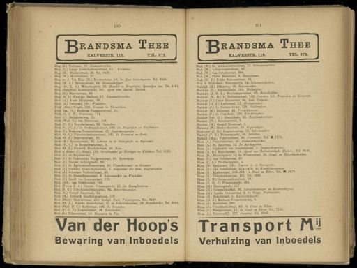 Gebruik tekstcoördinaten Transcriptie 130 131 - J|randsma Thee KALVERSTR . 115 . TEL . 272 . RANDSMA Thee KALVERSTR . 118 . TEL . 272 . Blog ( J .) Tolstraat , 83 . Diamantwerker . Blog ( L .) Lange Leidschedwarsstraat , 55 . Koopman . Blog ( M .) Muiderstraat , 16 . Tel . 9425 . Blog ( M .) Muiderstraat , 27 . Blog en J . Vaz Dias ( M .). Muiderstraat , 16 . In fijne oleeschwaret ). Tel . 9425 . Blog ( M . J .) Hemonystraat , 64 . Diamantslijper . Blog ( M . L . S .) Waterlooplein , 33 . Handel in Drogerijen , Specerijen enz . Tel . 5591 . Blog ( Siegfried ) Keizersgracht , 501 . Agent van Buitehl . Huizen . Blog ( S .) Blasiusstraat , 83 . Blog ( S . I .) Plantage Badlaan , 17 . Diamantbewerker . Blok ( A .) Korte Houtstraat , 28 . Blok ( A .) Tolstraat , 124 . Winkelier . Blok ( Alex .) Singel , 102 . Grossier in Uurwerken . Blok Jzn . ( A .) Bosboom-Toussaintsti'aat , 31 . Blok ( A . J . H .) Overtoom , 174 . Blok ( C .) Buiksloterweg , 25 . Blok ( Wed . C .) van Breestraat , 149 . Blok ( C . G .) Ruysdaelstraat , 95 . Opzichter . Blok Jr . ( C . J .) Ie Oosterparkstraat , 169 . In Drogerijen en Verfwaren . Blok ( F .) Bosboom-Tousaaintstraat , 27 - Sigarenmagazijn . Blok ( G . C .) TJtrechtschedwarsstraat , 161 . In Groenten en Fruit . Blok ( G . J .) Batavierstraat , 90 . Blok ( H .) Spinozastraat , 23 . Leeraar in de Stenografie en Esperanto . Blok ( H . C .) Ie Boomdwarsstraat , 3 . Blok ( H . J .) Frederik Hendrikstraat , 40 . Huis . Blok & Zonen ( I .) Singel , 102 . Groothandel in Horloges en Klokken . Tel . 8120 . Blok ( J .) de Ruyterstraat , 7 . Blok ( J .) 2e Constantijn Huijgensstraat , 65 . Bovenhuis . Blok ( J .) Nieuwe Achtergracht , 93 . Blok ( J .) 2e Egelantiersdwarsstraat , 20 . Vïeeschhouwer en Grossier Blok ( J .) Frederik Hendrikplantsoen , 8 . Inspecteur der Gem . Gasfabrieken . Blok ( J .) Johannes Verhulststraat , 59 . Blok ( J .) 2e Bloemdwarsstraat , 3 . Schoenmaker en Winkelier . Blok ( J .) Jacob van Lennepstraat , 119 . Blok ( Joh .) van Ostadestraat , 186 . Blok ( Firma J . A .) Nieuwe Prinsengracht , 21 . In Manufacturen . Blok ( J . G .) TJtrechtschedwarsstraat , 94 . Schoorsteenveger , Blok ( K .) Gerard Doustraat , 24 . Blok ( M .) Frederik Hendrikplantsoen , 102 . Blok ( Mary ) Marnixstraat , 413 . Gedipt . Part . Verpleegster ,. Tel . 6498 . Blok ( M . A .) Nieuwe Amstelstraat , 21 en Jodenbreestraat , 29 . Broodbakker . Tel . 3883 . Blok ( Wed . P . O ) Kerkstraat , 423 . In Groenten . Blok ( P . C . J .) Lombokstraat , 19 . Ketelmaker . Blok ( S .) Tilanusstraat , 54 . Koopman in Vee . Van der Hoop's Bewaring van Inboedels Blok ( W .) St . Anthoniesbreestraat , 15 . Schoenwinkelier . Blok ( W .) ' s Gravesandestraat , 33 . , Blok ( W .) van Ostadestraat , 388 . Blok ( W .) Pieter Baststraat , 5 . Timmerman . Blok ( W . F .) Fokke Simonszstraat , 23 . Blok & Bilderbeek . Nieuwendijk , 82 . Schoenwinkeliers . Blokdijk ( H .) Eikenweg , 16 . Schoenmaker . Blokhuis ( H .) Kuysdaelkade , 181 . Melkslijter . Blokhuis ( J . G . K .) Haarlemmerstraat , 63 . Broodbakker . Blokhuis ( W . B .) Ie Helmersstraat , 132 . Commies b/d . Posterijen en Telegrafie . Blokker ( F .) Czaar Peterstraat , 84 . Ged . Coupeur . Blokker ( H . J .) Kerkstraat , 15 . Horlogemaker . Blokker ( J .) Ie Helmersstraat , 129 . Onderwijzer . Blokker ( M .) Zeilstraat , 43 . Vïeeschhouwer . Blokker ( P .) da Costakade , 130 . Kleedermaker . Blokker Nzn . ( P .) Marnixkade , 60 . Hoofdonderwijzer , Blokker ( Th .) Bareutazstraat , 3 . Blokker ( W .) Gerard Doustraat , 1 . Bloksma ( P .) Brederodestraat , 58 . Koperslager . Blokvoort ( J . H .) Engelschesteeg , 18 . Schoenmaker . Blokzijl ( F . N .) Prinsengracht , 88 . Schilder . Blokzijl ( Max .) Valeriusstraat , 45 . Journalist . Tel . K 1779 . Blom ( A .) Pretoriusstraat , 39 . Diamantbewerker . Blom ( A .) St . Janstraat , 52 . In Aardappelen . Blom ( A .) Gijsbrecht van Aemstelstraat , 1 . Diamantbewerker . Blom ( A . D .) Ruyschstraat , 18 . Agent van Buitenlaédsche Huizen . Tel . 6548 . Blom ( B .) Prinsengracht bij de Westerstraat , 28 . Goud - en Zilverkashouder . Blom ( O ) van Ostadestraat , 99 . Blom ( C . A .) Thorbeckeplein , 4 . Blom ( D .) Spuistraat , 148 . Leeraar in de Stenografie . Blom ( D .) van Ostadestraat , 474—476 . In Kruidenierswaren . Blom ( E .) Kinkerstraat , 206-208 . In Goud en Zilver . Tel . K 2573 . Blom ( E .) Utrechtschestraat , 107 . Tel . 1646 . Blom ( E . M .) Swammerdamstraat , 58 . Blom ( F . M . J .) Prinsengracht , 464 . Blom ( H .) Heerengracht , 257 Blom ( H .) Commelinatraat , 30 . Schoorsteenveger en Rookverdryver . Blom ( H .) Agatha Dekenatraat , 4 . Ie Etage . Postbeambte . Blom ( H .) Retiefstraat , 5 . Kantoorbediende . Blom ( H . J .) Bosboom-Toussaintstïaat , 3 . Blom ( J .) Kerkstraat , 389 . Blom ( J .) Utrechtschestraat , 89 . In Goud en Zilver . Blom ( J .) Weesperstraat , 11 . In Goud en Zilver . Tel . 7723 . Blom ( J .) Nieuwendijk , 173 . Juwelier . Tel . 2348 . Transport t \ ü Verhuizing van Inboedels