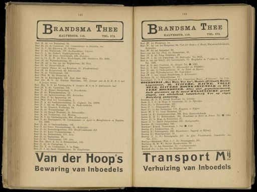 142 143 [ 3 RANDSMA Thee KAL VERSTE . 115 . TEL . 272 . Jf Boer ( K . de ) von Zesenstraat , 20 . Boer ( K . de ) da Costastraat , 141 . Commissionair in Groenten , enz . Boer ( K . F . de ) Eikenweg , 20 . Schilder . Boer ( L . de ) Marnixkade , lm : Boekhandelaar . Uitgever . Boer ( L . A . de ) Frederik Hendrikplantsoen , 26 . Boer ( L . W . de ) Prins Hendrikkade , 136 . Stevedore . Boer en Co . ( L . W . de ) Prins Hendrikkade , 136 . Stevedores . Tel . 8092 Boer ( M . de ) Wijttenbachstraat , 28 . Boer ( M . de ) Ie Jan van der Heijdenstraat , 24 . Huis . Boer ( M . de ) Nieuwendijk,32 . Boer — Israels ( Maison de ) van Breestraat , 55 . Kleedermakerij . Boer ( M . de ) Kuiperstraat , 42 . Schoenmaker . Boer < M . de ) Valeriusstraat , 103 . Boer ( Wed . M . de ) Sluisstraat , 4 . Boer ( M . de ) Keizersgracht , 542 . Voet . Dent . Surg . Boer ( Dr . M . G . de ) Nicolaes Maesstraat , 105 . Leeraar aan de 2e E . B . S . met 5 jarigen cursus . Boer ( Mej . M . G . de ) Valeriusplein , 8 . leerares M . O . in de Italiaansche taal . Boer ( M . K . de ) Vijzelstraat , 100 . Boer ( N . de ) Binnen Oranjestraat , 9 . Broodbakker . Boer ( P . de ) Wijttenbachstraat , 54 . Boer ( P . de ) Egelantiersstraat , 230 . Rietwerker . Boer ( Wed . P . de ) Sparrenweg , 30 . Boer ( Wed . Prof . de ) Valeriusplein , 8 . Boer ( P . A . de ) Gasthuismolensteeg , 11 . Confiseur . Tel . 10326 . Boer ( P . J . de ) van Woustraat , 75 . In Mode-Artikelen . Boer ( R . de ) Elisabeth Wolffstraat , 94 . Boer ( R . de ) Westerdokstraat , 37 . Boer ( R . de ) Gerard Doustraat , 25 . Schoenmaker . Boer ( R . de ) Vrolikstraat , 114 . Musicus . Boer ( R . S . de ) Lijnbaansgracht , 384 . Kleedermaker . Boer ( S . de ) Heerengracht , 83 . Commissionair en Agent in Manufacturen en Tapijten . iel . JLOJvJü Boer ( S . de ) Ie Oosterparkstraat , 192 . Boer ( S . de ) Pieter Nieuwlandstraat , 31 . MelksUjter . Boer ( S . de ) Rustenburgerstraat , 375 . Hoofd-Conducteur S.S . Boer ( S . de ) Korte Overamstelstraat , 1 . Boer'-(S . de ) Hobbemakade , 170 . Huis . Boer ( S . de ) Bankastraat , 28 . Boer ( S . 1 de ) Valeriusstraat , 139 . Arts . Boer Dzn . ( Mevr . S . de ) Ie Helmersstraat , 193 . Boer ( T . de ) de Clercqstraat , 5 . . Boer ( Th . E . de ) Celebesstraat , 9 . Ie Etage . Boer ( T . J . de ) Jacob Ob'rechtstraat , 78 . Hoogleeraar , Van der Hoop's Bewaring van Inboedels TEL . 272 . KALVERSTR . 115 B RANDSMA Thee . —~ , , - rp-GVT . o.v > Vert . der Firma v . d . Bergh,Margarinefabrikanten . Boer ( W . de ) Sluisstraat , 14 . Boer ( W . de ) van der Hoopstraat , 34 . 36 . Rotterdam . Boer ( W . de ) ten Katestraat , 86 Boer—van der Ley ( Wed . de ) Kanaalstraat , Boer ( W . G . de ) Frans Halsstraat 48 Talk enz . Boer ( W . J . de ) von Zesenstraat , 33 . Stalhouder , lel . 2b ( 3 . , Boer en van der Schiüjt ( de ) Lauriergracht , 73 . Kooplieden m Verfwaren , Boer ( 1 .' D . den ) Overtoom , 91 . Drogist . Tel . 5B 1693 . Boer ( A F den ) Dapperplein 11 . Schoenmaker en Winkelier . Boer ( G . den ) Ie Oosterparkstraat , 91 . In Tabak en Sigaren . Boer ( P den ) Wijttenbachstraat , 59 . Onderwijzer . Boer ( W . J . den ) Gerard Brandtstraat , 3 . Keurmeester . Boerboom ( H . A .) Bilderdijkstraat , 59 . . B ckZdi F .) N . Z . Voorburgwal , 318 . FilmverhuurMaal , „ f^*M «'. W-77W - BOGRDERM „ Met Huis Te._Aa ", ^ J^l^iT ^ St^E Hagen , van uitsluiten * tuberitelvrij Vee op enge ,, Boerderij aanwezig . Boerdam ( M . D . P .) Gerard Doustraat , la . Schilder . Boere ( C . J . P .) 2e Hugo de Grootstraat , 21 . In Rywielen . Boere ( G .) Ie Helmersstraat , 237 . Boere ( P . G .) Prinsengracht , 876 . . Boeré ( J .) Ie Jan Steenstraat , 118 . Koopman m Kippen . Boeré ( W F . C .) Frans Halsstraat , 56 . 1064 . Boeree ( A . E .) Rustenburgerstraat , 399 . Huis . Kantoorbediende . Boeree Jr . ( E . F .) Hobbemakade , 160 . Handelaar m Boter en Eieren , lel . A Boeree ( J .) 3e Hugo de Grootstraat , 21 . Boeree ( J . C .) Daniël Stalpertstraat , 101 . Horlogemaker . Boerema ( E .) Ceintuurbaan , 346 . Boevhaave Kliniek . Teniersstraat , 1 . Tel ." 2fi 114 ». Boering ( O ) Kwakersstraat , 14 . __ . Boering ( J .) Prinsengracht , 232 . Biljartmaker . Tappery ) en Slyteng . Boerins ; ( J .) Monnikenstraat , 13 . Boerin ! ( J . C . N .) Keizersgracht , 357 . H fijne Vkeschwaren ,, Comestibles Tel . 1717 . Boering — Straatman ( Wed . J . C . N .) Prinsengracht , 330 . Boerkamp ( E . M . W .) Buiten Brouwerstraat , 12 . Boerke ( K .) Ie Jan Steenstraat , 31 . Voetkussenmaker . Boerkoel ( A .) Ie Jan van der Heijdenstraat , 95 . Transport tvi Verhuizing van Inboedels 11