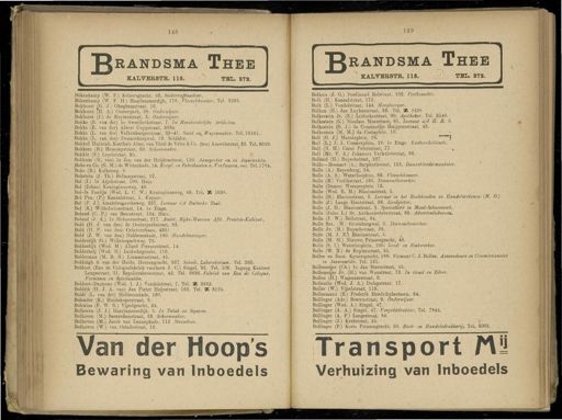 Gebruik tekstcoördinaten Transcriptie 148 149 J^randsma Thee KALVEBSTB . 116 . • TEL . 272 . ] Jr andsma Thee ' KALVEBSTB . 115 . TEL . 272 . Bókenkamp ( W . F .) Keizersgracht , 33 . Suikerrajfinadeur . Bökenkainp ( W . F . PI .) Haarlemmerdijk , 176 . Vleesch homoer . Tel . 3593 . Bokhorst ( G . J .) Okeghemstraat , 16 . Bokhorst ( H . A .) Oosterpark , 28 . Onderwijzer . Bokliorst ( J .) de Ruyterstraat , 3 . Onderwijzer . Bokke ( E . vaa der ) Ie Sweelinckstraat , 7 . In ) Huishoudelijke Artikelen . Bokke ( E . van der ) Albert - Cirypstraat , 238 «. Bokke ( L . van der ) Valkenburgerstraat , ' 39-41 . Smid en Wagenmaker . Tel . 10161 . Bokke ( L . van der ) Zwanenburgwal . 19 . Schilder . Bokkel Huinink , Korthals Altes , van Thiel de Vries & Co . ( ten ) Amstelstraat , 32 . Tel . 8059 Bokkers ( B .) Hemonystraat , 60 . Schoenmaker . Bokkie ( S .) Lepelstraat , 53 . Bokkum ( M , van ) Ie Jan van der Heijdenstraat , 110 . Aanspreker en in Assurantiën . Boks en Co . ( G . M .) de Wittenkade , 14 . Koopl . en Fabrikanten v . Verfwaren , enz . Tel . 1704 Boks ( R .) Kolksteeg , 8 . Bokstein ( J . Th .) Bellamystraat , 57 . Bol ( J .) Ie Atjehstraat , 100 . Huis . Bol ( Johan ) Koninginneweg , 48 . Bol-la Fontijn ( Wed . L . C . " W .) Koninginneweg , 48 . Tel . SB 1638 . Bol Pzn . ( P .) Kanaalstraat , 5 . Kapper . Bol ( P . J .) Amstelveenscheweg , 227 , Leeraar ijd Duitsche Taal . Bol ( R .) Wilhelminastraat , 14 . Ie Etage . Boland ( O . P .) van Breestraat , 134 . Huis . Boland ( J . A .) Ie Helmersstraat , 217 . Assist . Sijks-Museum A/d . Prenten-Kabinet . Bold ( H . J . van den ) 2e Oosterparkstraat , 83 . Bold ( II . I '. van den ) Ceintuurbaan , 432 .? Bold ( J . W . van den ) Hobbemakade , 160 . Handelsreiziger . Bolderdijk ( G .) Willemsparkweg , 70 . Bolderdijk ( Wed . M .) Allard Piersonstraat , 14 . Bolderheij ( Wed . D .) Leidschegracht , 110 . Bolderman ( M . B . N .) Linnaeusstraat , 45 . Boldingh & van der Heide , Heerengraeht , 567 . Seheik . Laboratorium . Tel . 260 . Boldoot ( Eau de Colognefabriek voorheen J . C .) Singel , 92 . Tel . 106 . Ingang Kantoor Langestraat , 51 . Reguliersbreestraat , 42 . Tel . 9696 . Fabriek van Eau de Vernissen en Spiritualiën . Boldoot- Desmons ( Wed . I . J .) Vondelstraat , 7 . Tel . SB 3852 . Boldrik ( H . J . A . van ) Jan Pieter Heijestraat , 162 . Tel . SB 3124 . Boldt'(L . van der ) Hobbemakade , 160 . Bolender ( K .) Huidekoperstraat , 8 . Bolenius ( F . W . G .) Vijzelgracht , 24 . Bolhoven ( J . J .) Haarlemmerdijk , 5 . In Tabak en Sigaren . Bolhoven ( M .) Saenredamstraat , 33 . Schoenmaker . Bolhoven ( M .) Jacob van Lennepkade , 112 , Stucadoor . Bolhoven ( W .) van Ostadestraat , 16 . Van der Hoop's Bewaring van Inboedels Bolhuis ( J . G .) Ferdinand Bolstraat , 102 . Fostbeambte . Bolk ( H .) Kanaalstraat , 172 . Bolk ( L .) Vondelstraat , 144 . Hoogleeraar . Bolken ( H .) Jan luykenstraat , 38 . Tel . SB 3438 . Bolkestein Jr . ( E .) Leidsehestraat , 90 . Apotheker . Tel . 2140 . Bolkestein ( G .) Nicolaes Maesstraat , 81 . Leeraar ajd H . B . S . Bolkestein ( G . J .) 2e Constantijn Huijgensstraat , 43 . Bolkestein ( M . M .) da Costaplein , 10 . Boll ( G . J .) Marnisplein , 28 . '~ mh \ Boll ( L .) J . J . Cremerplein , 19 . lc Etage . Kantoorbediende . Boll ( N . H .) Czaar Peterstraat , 77 - Boll ( Mr . P . A .) Johannes Verhulststraat , 96 . Bolland ( H .) Ruyschstraat , 107 . Bolle — Boesaart ( A .) Sarphatistraat , 123 . Dameskleedermaakster . Bolle ( A .) Rapenburg , 34 . Bolle ( A . S .) Waterlooplein , 89 . Vleesehhouwer . Bolle ( B .) Vrolikslraat , 160 . Diamantbewerker . Bolle ( Dames ) Weesperplein , 12 . Bolle ( Wed . E . M .) Blasiusstraat , 5 . Bolle ( H .) Blasiusstraat , 5 . Leeraar in het Boekhouden en Handel srekenen ( M . 0 .) Bolle ( J .) Lange Houtstraat , 38 . Loodgieter . Bolle ( J . H .) Blasiusstraat , 5 . Specialiteit in Maat-Schoenwerk . Bolle ( Jules L .) St . Anthoniesbreestraat , 88 . Advertentiebureau . Bolle ( J . W .) Balistraat , 34 . Bolle Szn . ( M .) Groenburgwal , 2 . ' Diamantbewerker . Bolle Jr . ( M .) Ruyschstraat , 29 . Bolle ( M . J . E }) Blasiusstraat , 5 . Bolle ( M . M .) Nieuwe , Prinsengracht , 46 . Bolle ( S . I .) Waterlooplein , 100 . Lood - en Zinhoerker . Bolle ( W . N .) de Ruyterstraat , 55 . Bollee en Zoon . Keizersgracht , 188 . Firmant C . J . Bollee . Assuradeurs en Commissionairs in Assurantiën . Tel . 121 . Bollemeijer ( Ch .) Ie Jan Steenstraat , 45 . Bollemeijer Jr . ( H .) van Woustraat , 73 . In Goud en Zilver . Bollen ( H .) Wagenaarstraat , 3 . Bollentin ( Wed . J . A .) Dufaystraat , 17 . Boller ( W .) Vijzelstraat , 115 . . Bollermann ( B .) Frederik Hendrikplantsoen , 54 . Bollinger ( Adr .) Beerenstraat , 9 . Onderwijzer . Bollinger ( Wed . A .) Singel , 47 . Bollinger ( A . A .) Singel , 47 . Vergulddrukker . Tel . 7844 . Böllinger ( A . P .) Langestraat , 84 . Bollinger ( J .) Kerkstraat , 55 . Bollinger ( P .) Korte Prinsengracht , 30 . Boek - en Handelsdrukkerij . Tel . 6005 . Transport l\ï Verhuizing van Inboedels