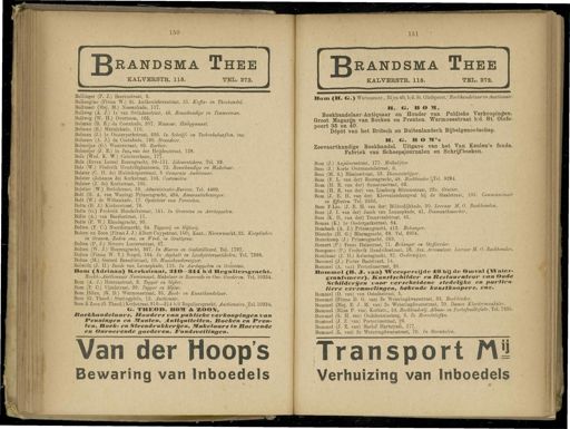 150 151 B IANDSMA Thee KALVERSTR . 115 . TEL . 272 . RANDSMA Thee KALVERSTR . 115 . TEL . 272 . Bollinger ( P . J .) Beerenstraat , 9 . Bollongino ( Firma W .) St . Anthoniebreestraat , 55 . Koffie - en Theehandel . Bollusset ( Mej . M .) Nassaukade , 117 . Bollweg ( A . J .) Ie van Swindenstraat , 46 . Bouwkundige en Timmerman . Bollweg ( W . H .) Overtoom , 163 . Bolman ( B . E .) da Costakade , 207 . Masseur . Eeilgymnast . Bolman ( E .) Marnixkade , 110 . Bolman ( J .) Ie Oosterparkstraat , 226 . In Schrijf - en Teekenbehoeften , enz . Bolmers ( A . J .) da Costakade , 190 . Stucadoor . Bolmeijer ( G .) Westerstraat , 89 . Barbier . Bolmeijer ( J . E .) Ie Jan , van der Heijdenstraat , 128 . Bols ( Wed . K . W .) Ceintuurbaan , 177 . Bols ( Erven Lucas ) Rozengracht , 99-111 . Likeurstokers . Tel . 92 . Bols ( W .) Frederik Hendrikplantsoen , 72 . Bouwkundige en Makelaar . Bolster ( C . H . de ) Huidekoperstraat , 8 Gemeente Ambtenaar . Bolster ( Johanna de ) Kerkstraat , 105 . C'ostumière . Bolster ( J . de ) Kerkstraat , 105 . Bolstier ( W .) Retiefstraat , 59 . Administratie-Bureau . Tel . 4409 . Bolt ( H . A . van Waning ) Prinsengracht , 484 . Assurantiebezorger . Bolt ( W .) de Wittenkade , 17 . Opzichter van Perceelen . Bolta , ( B . J .) Kinkerstraat , 76 . Bolta ( G .) Frederik Hendrikstraat , 151 . In Groenten en Aardappelen . Bölte ( A .) van Baerlestraat , 11 . Bolte ( F . W .) Elandsgracht , 93 . Bolten ( F . O ) Noordermarkt , 34 . Tapperij en Slijterij . Bolten en Zoon ( Firma J . J .) Albert Cuypstraat , 150 ; Kant . : Nieuwmarkt , 22 . Kooplieden in Granen , Zaden enz . en Wink , in Gruttersw . Bolten ( P . J .) Nieuwe Laoiersstraat , 67 . Bolten ( W . J .) Heerengracht , 397 . In Bieren en Gedistilleerd . Tel . 1797 . Bolten ( Firma W . V .) Singel , 164 . In Asphalt en Loodgietersartilcelen . Tel . ' 7398 . Boltes ( M .) Gerard Brandtstraat , 10 . Muziekonderwijzer . . Bolwidt ( J . H .) Jacob van Lennepkade , 115 . In Aardappelen en Groenten . Bom ( Adriaan ) Herkgtraat , 310 — 314 b/d He»nliersjjracli *. Boekh.- Auctionnair Numismaat . Makelaar in Roerende en Onr . Goederen . Tel . 10334 . Bom ( A . J .) Heerenstraat , 2 . Tapper en Slijter . Bom ( F . C .) Vijzelstraat , 39 . Tapper en Slijter . Bom jIGzn . ( G . D .) Warmoesstraat , 35 . Boek - en Kunsthandelaar . Bom ( G . Theod .) Staringplein , 12 . Anctionair . Bom & Zoon ( G . Theod .) Kerkstraat , 310—314 b/d Reguliersgracht . Auctionairs . Tel . 10334 . O . THEO ». BOM & KOOK , Roekhandelaars , Houders van publieke verkoopingen van Penningen en Munten . Antiquiteiten , Boehen en toren- ten , Boek- en Steendrukkerije/i , Makelaars in Roerende en Onroerende goederen . Fondsveilingen . Van der Hoop's Bewaring van Inboedels Bom ( H . G .) Warmoesstr ., 35>n 40 , b/d . St . Olofspoort / Boekhandelaar en Aueiionair . H . G . HOJt , Boekhandelaar-Antiquaar en Houder van Publieke Verkoopingen.Groot Magazijn van Boeken en Prenten . Warmoesstraat b/d . St . Olois- poort 35 en 40 . ' „., , , , Dépót van het Britsch en Buitenlandsch Bijbelgenootschap . H . G . B O M»s Zeevaartkundige Boekhandel . Uitgave van het Van Keulen's fonds . Fabriek van Scheepsjournalen en Schrijfboeken . Bom ( J .) Anjeliersstraat , 177 . Melkslijter . Bom ( J .) Korte Overamstelstraat , 6 . Bom ( M . S .) Blasiusstraat , 53 . Diamantslijper . Bom ( F . L . van der ) Rozengracht , 48 . Boekbinder , . JTel . 9294 . Bom ( H . E . van der ) Sumatrastraat , 63 . Bom ( H E . van der ) van Limburg Stirumstraat , 22a . Grutter . Bom ( J . E . H . van der ) Kloveniersburgwal bij de Staalstraat , 105 . Commissionairin ' Effecten . Tel . 9566 . : Bom F.Lzn . ( J . E . H . van der ) Bilderdijkkade , 30 . Leeraar M . O . Boekhouden . Bom ( J . I . van der ) Jacob van Lennepkade , 41 . Diamantbewerker . Bom ( K . H . van der ) Transvaalstraat , 45 . Bomas ( K .) Ie Oosterparkstraat , 84 . Bombach ( A . J .) Prinsengracht , 413 . Behanger . Bömcke ( H . G .) Bloemgracht , 68 . Tel . 6954 . Bomekamp ( J .) Prinsengracht , 283 . , Bomert ( P .) Erans Halsstraat , 71 . Behanger en Stoffeerder , Bomgaars ( P .) Frederik Hendriksstraat , 16 . Ass . Accountant . Leeraar M . O . Boekhouden . Bominaar ( J . H .) Keizersgracht , 87 . Onderwijzer . Bommel ( J .) Pieter Baststraat , 14 . Bommel ( A . van ) Pretoriusstraat , 26 . Bommel ( B . J . van ) Weesperzijde 4 » bij de Omval ( Water- gra.»fsmeer ). Kunstschilder en Restaurateur vanttuae " schilderijen voor verscheidene stedelijke en particu Here verzamelingen , bekende kunstkoopers , enz . Bommel ( D . van ) van Ostadestraat , 5 . Bommel Firma D . G . van ) 3e Weteringdwarsstraat , 33 . Boekbinder . Bommel ( Mej . E . J . M . van ) 2e Weteringdwarsstraat , 70 . Dames Kleedermaakster . Bommel ( Elias P . van ) Kerkstr ., 58 . Boekbinderij . Album - en Bommel ( G . H . van ) Oudekennissteeg , 3 . In Brandstoffen . Bonimei ( J . Z . van ) Pretoriusstraat , 26 . Bommel ( J . Z . van ) Roelof Hartstraat , 177 . Bommel ( L . van ) 2e Weteringdwarsstraat , 70 . In Steenkolen . Transport Mü Verhuizing van Inboedels