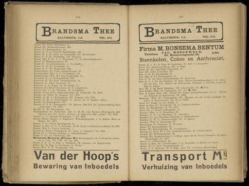 Gebruik tekstcoördinaten Transcriptie 154 155 rand SM a Thee KALVERSTR . 115 . K , TEL . 272 . J^randsma Thee KALVERSTR . 115 . TEL . 272 . L . Bonnes ( D .) Groote Bickerstraat , 6 . Bonnes ( H .) Rustenburgerstraat , 366 . Bonnes ( J .) Zeeburgerstraat , 15 . Bonnet ( A . F . J .) Frederik Hendrikstraat , 120 . Bonnet ( B . J . M .) Jacob van Leonepkade 119 . Kleedermaker . Bonnet ( C . P . E .) Vrolikstraat , 159 . Stucadoor . Bonnet ( Mej . E . M .) P . C Hooftstraat , 77 . In Dames-Randwerken . Bonnet ( J .) Haarlemmerplein , 29 . Bonnet Jr . ( J .) Jodenbreestraat , 1 . Broodbakker . Bonnet Sr . ( J . W .) Lootsstraat , 44 . Bonnet Jr . ( J . W .) Borgerstraat , 226 . Bonnettemaker ( A .) Pieter Langendijkstraat , 36 . Bonnettemaker ( Em .) O . Z . Voorburgwal , 147 . Bonnettemaker ( Wed . M .) Rapenburgerstraat , 24 . Bonneveld ( G .) Ie Oosterparkstraat , 200 . Bonneveld ( G . W ) Korte Overamstelstraat , 31 . Bonnevelt ( J .) Albert Cuypstraat , 55 . Bonnewit ( L . S .) Hoogte van den Kadijk , 21 . Bonnewit ( N .) Gerard Doustraat , 47 . In Galanterieën . Bonnier ( Ger . J .) van Woustraat , 42 . Zetwinkelier . Bonnier ( Firma Gebr .) Haarlemmerstraat , 66 .' Kooplieden . Tel . 9019 . Bonnike ( A .) Rokin , 89 . Koopman . Tel . 1978 . Bonnike ( A . M . A .) Keizersgracht , 261 . Koopman . Tel ; 7526 . Bonnike ( F . M . A .) Hobbemakade , 51 . Leeraar a\h . St . Ignatius College . Bonnike ( J .) Keizersgracht , 748 . Bonnike ( J . E . J .) Heerengracht , 118 . Kantoor : idem 213 . Mr . Levensverzekering-Bank „ Amsterdam ". Tel . 2273 . Bonnike ( E . M .) Heerengracht , 118 . Bönninghausen tot Herinckhave ( Jhr . E . M . Th . von ) Kantoor .- Heerengracht , 450 . Directeur der Ond . Levens -, Pensioen -, en Rente-Verz.-Mi/j . „ Iduna ". Tel . 4287 . Bonnist ( A . I .) Plantage Franschelaan , 5 . Tel . 9383 . Borinist ( Gebrs .) Kantoor en Magazijnen : Wittenburgergracht , 1 . In Zakken , Balen en Matten . Tel . 3300 . Bonnist ( J . 1 .) Nieuwe Keizersgracht , 31 . Bonnist en Zoon ( J . L .) N . Keizersgr ., 41-43 . Koopl . in Pakmatten en Zakken . Tel . 270 . Bonnist ( Wed . L .) Nieuwe Kerkstraat , 1 . Bonnist ( S .) Nieuwe Keizersgracht , 31 . Comm . in Diamanten . Tel . 9454 . Bonnist ( Z . I .) Plantage Parklaan , 6 . Zaklcenhandelaar . Bonsée ( J . H .) van Ostadestraat , 253 . Bonseiua Bentnm ( Firma M .) Brouwersgracht , 35 . In Steenkolen , Anthra - ciet en Cokes . Tel . 1188 . ( Zie pag . 155 .) Bonsen ( F . B . M .) 3e Hugo de Grootstraat , 18 . Aannemer van Begrafenissen . Bonsen ( G .) 3o Hugo de Grootstraat , 14 . Barbier . Bonsen ( Wed . H . P .) Weesperzijde , 134 . Van der Hoop's Bewaring van Inboedels Firma M . BONSEMA BENTUM JAC . HOOGEWOÜD , 1188 Telefoon 35 > Brouwersgracht 35 . Steenkolen , Cokes en Anthraciet . Bonsen ( T . J . H .) 3e Hugo de Grootstraat , 18 . Bode en Aanspreker . Bonset ( H .) Amstelveenscheweg , 206 . Ie Etage . Bonset ( H . M .) Alberdingk Thijmstraat , 12 . Bont ( M .) Joden Houttuinen , 57 ». Bont ( C . H . de ) Kuyschstraat , 91 . Bont ( Mei . E . de ) Frederiksplein , 26 . Bont ( J . W . de ) Pieter Nieuwlandstraat , 20 . Timmerman . _ . Bont L A J de ) den Texstraat , 18 . Kant : Nieuwe Looiersdwarsstraat , 9-11 . Daee- teur der Kon . Ned . Fabriek van Suikerwerken , Chocolade en Likeuren , vroeger DeBont en Leïïten . „. Bont ( Th J . de ) Roelof Hartstraat , 168 . Schoenhandel . Tel . Z 1^14 . Bont- Reyffert ( Wed . de ) Vondelstraat , 101 . Tel . SB 3362 . Bont & Leijten ( Kon . Ned . Fabriek De ) Nieuwe Looiersdwarsstraat , 9-11 . Fabriek van Chocolade en Suikerwerken . Tel . 3689 . _ Bontamps ( Wed . H .) Prinsengracht , 321 . Magazijn van alle soorten machinale Pa- pieren en Kantoorboeken . Tel . 60 en 10434 . Bonte ( G .) Hoogte van den Kadijk , 11 . . Bonte en Zoon ( J .) Nieuwmarkt , 12 . In Visschenj-Artikelen . Bonte ( L .) Ruyschstraat , 82 . Tel . 3771 . Bonte ( Th . J .) Nieuwe Achtergracht , 10 . Bontekoe ( Wed . A . S .) Boomstraat , 69 . Bontekoe ( F . P .) van Woustraat , 10 . Assuradeur . Bontekoe ( J .) van Oldenbarneveldtstraat , 8 . Rijksambtenaar . Bontekoe ( J . W . Y .) Haarlemmerdijk , 121 . In Sigaren . Bontekoe ( Wed . S .) Boomstraat , 67 . Bontekoning ( J .) Veerstraat , 10 . Koopman . Bontes ( P .) Reinwardtstraat , 64 . Bontes ( W .) Bilderdijkstraat , 53 . Vleeschhouwer . Bonting ( J .) Firma W . J . Star . Leidschekruisstraat , 18 . Varkensslachter . Bontina ( M .) Wilhelminastraat , 23 . _ j . BontinS ( M .) Zaagmolenstraat , 1 . Ie Etage . Agent van de Nieuwe Leeuwarder Stoomboot- Maatschappij . Tel . 2377 - Bonvie ( F .) Achterburgwal , 44 . ; ,; Bonvie en Zoon ( M .) Achterburgwal , 1—3 . Kooplieden m Honden en Vogels . Bonzen ( H . J .) Korte Overamstelstraat , 15 . , ., Bonzet ( J . J .) Balistraat , 7 8 . 3e Etage . Agent ïïtr . Levensverz,Maatschappij . ^ Transport tVï Verhuizing van Inboedels