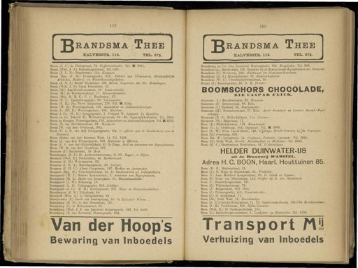 Gebruik tekstcoördinaten Transcriptie 158 mm ^ randsma Thee KAL VERSTE . 115 . TEL . 272 . Boom ( J . J .) de Clercqstraat , 79 . Koffiehuishouder . Tel . Wt 3941 . Boom ( Wed . J . J .) Rapenburgerstraat , 161-165 . Boom ( J . 1 . D .) Borgerstraat , 1&4 . Koopman . Boom Bzn . ( J . M .) Prinsengracht , 318 . Fabriek van Uzerwaren , Huish Artikelen , Bakkerij - en Winkelbenoodigdheden . Boom ( J . N . J .) Roelof Hartstraat , " 139 . Boven . Inspecteur der Dir . Belastingen . Boom ( Wed . J . S .) Czaar Peterstraat , 43 . Boom ( M .) Reguliersdwarsstraat , 80 . Pensiouhoitder . Boom ( M .) 2e Boerhaavestraat , 77 . Diamantbewerker . Boom ( Mej . M . E . C .) P . C . Hooftstraat , 27 . Boom ( P . C .) Egelantiersgracht , 80 . Schoenmaker . Boom ( S . H .) Jan Pieter Heijestraat , 176 . Tel . '/. 2590 . Boom ( W . E .) Weteringschans , 106 . Assuradeur en Assurantiebezorger . Boom Jr . ( W . E .) Weteringschans , 106 . Makelaar . Boom & Co . ( W . H .) Spiegelgracht , 3 . Firmant W . Spanjert . In Rijwielen . Boom en Co . Fabriek KI . Wittenbui-gerstraat , 94 — 96 . Sigarenfabrikanten . Tel . 3348 . Boom en Gooszen . Weteringschans , 106 . Assuradeurs en Assurantiebezorgers . Tel . % 3222 . Boom ( H . de ) Molukkenstraat , 83 . Machinist . Boom ( W . van den ) Overtoom , 165 #. Boom ( C . A . G . van der ) Sehippersgracht , 16 ». Ie officieer aan de kweekschool voor de Zeevaart . Boom ( Gebrs . van der ) Kromme Waal , 14 . Tel . 2558 . Boom ( J . van der ) Prinsengracht , 826 . Makelaar in Effecten . Boom ( J . C . van der ) Bilderdijkkade , 25 . 3e Etage . Bode en Aannemer van Begrafenissen . Boom ( W . N . van der ) Overtoom , 397 . Boomars ( J .) Bankastraat , 18 . Huis . Boombergen ( P . J .) St . Anthoniesbreestraat , 81-83 . Tapper en Slijter . Boomers ( Wed . E .) Eoeliestraat , 44 . Barbierszaak . Boomers ( J . H .) Wolvenstraat , 23 . Boomers ( J . H . A .) Martelaarsgracht , 20 . Reiziger . Boomers ( J . H . O ) Albert Cuypstraat , 147 . Barbier en Aanspreker . Boomers ( Mej . M .) Utrechtschestraat , 24 . In Parfumerieën en Toiletartikelen . Boomgaard ( H . J .) Nieuwe Looiersstraat , 3 . Aannemer van Begrafenissen . Boomgaard ( H . L .) Jacob van Lennepkade , 64 . Decoratieschilder . Boomgaard ( J . W .) Eikenweg , 16 . Boomgaard ( L . H .) Prinsengracht , 329 . Schilder . Boomgaard en Co . ( P . H .) Keizersgracht , 207 . Suis - en Decoratieschilders . Boomheuver ( J . N .) Tuinstraat , 54 . Boomhoff ( Wed . A .) Ie Helmersstraat , 83 . Boomhouwer ( F .) Jacob van Lennepstraat , 65 . In Koloniale Waren . Boomkamp ( H . H .) Ie Jan Steenstraat , 120 . Boomkamp ( J .) Ie Helmersstraat , 62 . Boomkamp ( Wed . J . J . van Leeuwen ) Keizersgracht , 686 . Tel . 2420 . Boomkamp ( P . van Leeuwen ) Heerengracht , 364 . Van der Hoop's Bewaring van Inboedels 159 JJrandsma Thee KAL VERSTE ,. 115 . TEL . 272 . Boomkamp en Co . ( van Leeuwen ) Heerengracht , 364 . Kooplieden . Tel . 909 . Boomkens ( A .) Marnixkade , 103 . Opzichter bij de Reniegevende Eigendommen der Gemeente . Boomkens ( C .) Overtoom , 558 . Ambtenaar ter Gemeente-Secretarie . Boomkens ( D . J .) Bentinekstraat , 87 . Kantoorbediende . Boomkens ( W . A .) TJtrechtschedwarsstraat , 30 . Booms ( J .) Keizersgracht , 20 . R . K . Priester . BOOMSCHORS CHOCOLADE , KIE CASPAR P1ICB . Boomsma ( A .) Ruysdaelstraat , 60 . Hovenier . Boomsma ( G .) Borneostraat , 68 . Huis . Boomsma ( J .) Zandpad , 2b . Deurwaarder . Boomsma ( M .) Domselaerstraat , 37 . Huis . Agent Groninger en , Lemmer Stoomb.-Maat - schappij . Boomstra ( E . E .) Bilderdijkkade , 11a . Leeraar . Boomstra ( Ph .) Damstraat , 17 . Boon ( A .) Bilderdijkstraat , 115 . Brandwacht . Boon ( A . A .) Overtoom , 484 . Ingenieur . Tel . % 3065 . Boon ( A . W .) Prins Hendrikkade , 149 . le|Etage . Hoofd-Commies bij^de Posterijen . Boon ( B .) Overtoom , 309 . Boon Jbz . ( F .) Leliegracht , 14 . Confiseur , Patissier , Cuisinier . Tel . 2945 . Boon ( G .) Oude Waal , 18—21 . Bouwkundige en Makelaar . Tel . 2442 . Boon ( H . C .) Haarlemmer Houttuinen , 85 . IJshandelaar . HELDER DUINWATER-IJS de Brouwerij B'AMISTKL . Adres H . C . BOON , Haarl . Houttuinen 85 . Boon ( H . F .) Madurastraat , 33 . Boon ( J .) 3e Hugo de Grootstraat , 25 . Winkelier . Boon ( J .) Joan Melchior Kemperstraat , 85 . In Tabak en Sigaren . Boon ( J .) Frans van Mierisstraat , 114 . Griffier bij de Arr . Rechtbank . Boon ( J .) Rustenburgerstraat , 131 . Boon ( J .) Wijttenbachstraat , 79 . Boon ( J .) Borgerstraat , 207 . Huis . Boon ( J .) Prinsengracht , 416 . Pensionhouder . Booni ( J .) 2e Atjehstraat , 17 . Boon ( Jb .) Oude Waal , 18 . Bouwkundige . Boon ( J . C .) Cornelis Schuytstraat , 11 . Fil . Amstelveenscheweg , 182-184 . Boekhandelaar . Boon ( J . H .) Vrolikstraat , 256 . Rijks- Commies . Boon ( Wed . K .) 3e Oosterparkstraat , 214 . Boon ( L .) Kattenburgervoorstraat , 4 . Loodgieter en Zinkwerker . Tel . 8792 . Transport Mü Verhuizing van Inboedels