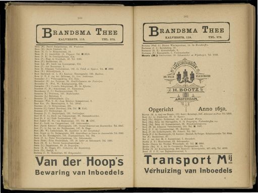 Gebruik tekstcoördinaten Transcriptie 160 161 ^ randsma Thee KALVEESTB . 115 . TEL . 272 . L . — ■* Boon ( M .) Daniël Stalpertstraat , 29 . Winkelier . Boon ( M .) Jacob Catskade , 53 . Boon ( M . J .) Ie Helmersstraat , 73 . Boon ( N . J .) Amsteldijk , 13 . Uitgever . Tel . K 2313 . Boon ( N . R .) 3e Oosterparkstraat , 214 . Boon ( P .) Hugo de Grootkade , 56 . Tel . 8565 . Boon ( P .) Bankastraat , 23 . Boon Azn . ( P .) Jacob van Lennepstraat , 214 . Boon ( P .) von Zesenstraat , 3 . Boon ( R .) Johannes Verhulststraat , 166 . In Tabak en Sigaren . Tel . K 3993 . Boon ( W .) Büderdljkkade , 8 . Boon Hartsinck ( A . A . H .) Kantoor : Heerengracht , 136 . BanJcier . Boon ( J . H . J . van der ) Zeilstraat , 15 . Gem . Ambtenaar . Boonacker ( C .) Willemsparkweg , ' 212 . Huis . Boonacker ( H .) den Texstraat , 28 . Hoofd-Commies der Posterijen . Boonacker Jr . ( Wed . W .) Koninginneweg , 225 . Boonacker ( W .) Cornelis Schuytstraat , 28 . In EJfecten . Boonders ( C . M .) Schoolstraat , 10 . Timmerman . ' Boonekamp ( J . C .) Haarlemmerstraat , 79 . Boonstra ( K .) Overtoom , 163 . Meubelmaker . Boonstra ( L .) Balistraat , 6 . Boonstra ( T .) Bilderdijkkade , \ la . Boonzajer ( Wed . G . H .) Joan Melchior Kemperstraat , 3 . Boor Kzn . ( Jb .) Barentszplein , 3 . Tel . 10645 . Boorsma ( A .) Ie Helmersstraat , 225 . Boorsma ( J .) Gerard Doustraat , 254 . Tel . SE 2141 . Boosman ( C .) Huidenstraat , 16 . Boosman ( G . J .) Sarphatipark , 132 . Onderwijzer . Boot ( F . C . A .) Jacob van Campenstraat , 36 . Diamantbewerker . Boot ( G . J . A .) Oude Looiersstraat , 100 . Boot Junior ( H . M .) van Eeghenstraat , 157 . Tel . ' M , 1707 . Boot ( J .) Jacob van Campenstraat , 159 . Schoenmaker . Boot ( Jacob ) Kantoor : Heerengracht , 125 . Consul-Generaal van Benemarken . Tel . 2947 . Boot ( P .) Ie Jan van der Heijdenstraat , 147 . 3e Etage . Boot ( Mr . W .) Leidschekade , 96 . Raadsheer in het Gerechtshof . Boot , , pipon en Co . Keizersgracht , 209 . Assuradeurs en Comm . in Assurantiën . Tel . 2353 . Boot en Co . Heerengracht , 125 . Houthandelaars . Tel . 764 . Boots ( F . L .) Pieter Nieuwlandstraat , 15 «. Schoenmaker . Boots ( Gebr .) Prins Hendrikkade , 133 . In Leder en Schoenwerk . Tel . 1995 . Boots ( H . H . A .) Nieuwe Looiersdwarsstraat , 7 . Boots ( L .) Dapperstraat , 80 . In Brogerijen . Boots ( M . E .) Singel , 271 . Collectrice der Staatsloterij . Boots ( Th .) Zeedijk , 3 . Bootsma ( C . R .) Boomstraat , 92 . Schoenmaker . Van der Hoop's Bewaring van Inboedels JJrandsma Thee KALVERSTB . 115 . TEL . 272 . J Bootsma ( Wed . G .) Binnen Wieringerstraat , 14 . In Brandstoffen . Bootsman ( J . J .) Barndesteeg , 19 . Bootsman ( R . R .) Alexanderkade , 9 . Bootsman ( S .) Rozengracht , 7 . Varkensslachter . jW^m ELESCHJES Viootz < H .) Gravenstraat , 16 . Likeurstoker en Wijnkooper . Tel . 2132 . a it \ siii)|j $ v ._ Opgericht | Anno 1650 . Booven ( M . A . van ) van Breestr ., 131 . Kant .: Keizersgr ., 349 . Advocaat en Proc . Tel . 5223 . Booij ( A .) Ie Atjehstraat , 37 . In Sigaren . Booij ( Th .) Rhijnvis Feithstraat , 46 . In Koloniale Waren . Booij ( Mej . Betsy de ) Staringplein , 6 . In Drogerijen , Verbandstofen enz . Booij ( Mej . Betsy de ) Linnaeusstraat , 39 . Muziekonderwijseres . Booij ( H . de ) Johannes Verhulststraat , 165 . Tel . ' M , 1097 . Booij ( J . F . de ) Linnaeusstraat , 39 . Makelaar . Booij ( P . de ) Leidschegracht , 20 . Notaris . Tel . 241 . Booijs ( P . J . de ) Heerenmarkt , 13 . Kantoor : Damrak , 3e Steiger . Schuitenvoerder . Tel . 8944 . Bor ( R .) Bankastraat , 27 . Bor ( J . van den ) M . J . Kosterstraat , 7 . Stucadoor . Bordes ( J . P .) Marnixstraat , 62 . Schoenmaker . Bordes ( Dames de ) Nicolaas Witsenkadc , 47 . Tel . W , 3380 . JJordes ( Mej . M . A . de ) 2e Constantijn Huijgensstraat , 50 . Bordes ( N . de ) Koninginneweg , 200 . Kantoor : Keizersgracht , 467-469 . Tel . 4083 . Borel ( H . J . F .) van Eeghendwarsstraat , 8 . Transport tVï Verhuizing van Inboedels