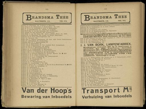 Gebruik tekstcoördinaten Transcriptie 162 163 r _—— , "^ randsma Thee KALVERSTB . 115 . TEL . 272 . Borethis ( L .) Rozenstraat , 150 . Loodgieter eh Zinkwerker . Borg ( Firma G . P .) Prinsenstraat , 6 . Boekhandelaar . Tel . 5178 . Borg ( H . M . J .) St . Iiuciënsteeg , 9 . Koek - en Banketbakker . Borg ( J . A .) Monnikenstraat , 17 . Gasfitter en Loodgieter . Borg-Wolff ( Mej . A . van den ) Kerkstraat , 395 . Verloskundige . Borg ( Jacques van den ) Kerkstraat , 395 . Handelsreiziger . Borg ( Henri J . van der ) Singel , 158 . Agent v . Buitenl . Huizen . Tel . 10569 . Borgeld ( Dr . A .) Nassaukade , 163 . Leeraar ajd Hoogere Burgerschool . Bprgenjen ( J . P .) Groote Kattenburgerstraat , 122 . Borger ( A .) Javastraat , 162 . Borger ( Jan C .) Johannes Verhulststraat , 192 . Huis . Ambt . Rotterd . Bankvereeniging . Borger ( S .) Valeriusstraat , 68 . Houthandelaar . Borgerdijn ( Mej . M . J .) Egelantiersstraat , 69 . Borgers ( C .) 2e Helmersstraat , 93 . Borgers ( H .) 2e Helmersstraat , 93 . Vert . Goudsche Mach . Garenspinnerij . Borgers ( J . W .) Ie Helmersstraat , 146 . Kapper . Borgers Jr . ( P . H .) Ie Weteringdwarsstraat , 66 . Borggreve ( A . A .) Oudebrugsteeg , 14 . Horlogemaker . Borggreve ( Corrie ) Oudebrugsteeg , 14 . Piano-Onderwijzeres . Borggseve ( H .) Ie van Swindenstraat , 83 . Horlogemaker . Borggreve ( J . S .) Ferdinand Bolstraat , 51 . Horloger . Bijoutier . Tel . K 2625 . Borgbardt ( C . H . K .) Allard Piersonstraat , 12 . Borgbardt Jr . ( J . C .) Ie Helmersstraat , 200 . Kantoorbediende . Borgbardt ( J . J .) Albert Cuypstraat , 35 . Borgbardt ( J . W .) Kanaalstraat , 47 . Borgbart ( A .) Vijzelstraat , 10 . Borgbmans ( J . F .) " Wijttenbacbstraat , 42 . Borgbmans ( O .) Alexanderkade , 1 . Tel . 9335 . Borgboff Jr . ( Anton ) Jac . v . Lennepstr ., 81 , 98,102 . Stoom-Meubelfabriek . Tel . SE 3428 . Borghoff ( J . P .) Jacob van Lennepstraat , 41 . Borghols ( A .) Leidscheplein , 7 . Borghols ( A .) 2e Oosterparkstraat , 46 . Borgbols ( A . A .) Leidschekade , 91 . Borghols ( F . J .) da Costakade , 212 . Borgbols ( H .) Kattenburgergracht , 9 . Borghols ( H . A .) Rustenburgerstraat , 417 . Goudsmid . BOTghols ( H . S .) Quellijnstraat , 62 . Wasch - en Strijkinrichting . Borghols ( J .) Yinkenstraat , 49 . Schoenmaker . Borghols ( J . H .) Marnixkade , 55 . Tapper en Slijter . Borgman ( J .) Madurastraat , 1 . Borgman ( J .) Celebesstraat , 30 . In ' Manufacturen . Borgman ( J . J .) Overtoom , 448 . Borgman ( W . F . M .) Pieter Baststraat , 16 . Borgmanu ( J . W .) Nieuwe Tolstraat , 25 . Van der Hoops Bewaring van Inboedels RANDSMA Thee KALVERSTB . 115 . TEL . 272 . Bor<miaim(K.M.Ï.)Ctóntuiirb.,28 ^ Borgmann ( M . C .) Kwakersstraat , 10 . In Huish . Artikelen . Borgmeijer ( J .) Veerstraat , 1 . Borgmeijer ( S . F .) Spuistraat , 272 . Confiseur . Borgstede ( D . G .) van Reigersbergenstraat , 165 . Biljartmaker . ÏfiiWAM » HËYIHAll . Oude Turfmarkt , 16 . Tel . »»*»• Bork™Srf Sovan " Don Boseo Albert Cuypstraat , 51 . ' Mist m de Goochelkunst . Bork ( F . W . van ) Ferdinand Bolstraat , 77 . Bork ( J .' H . van ) Laurierstraat , 18 . Kruier . Bork ( J . H . van ) Willemsparkweg , 142 . ._., J J VAN BORK , LAMPENFABRIEK . ZiICMtTIlVG . Kantoortijd 8—6 uur . Bork ( J J van ) Willemsparkweg , 142 . Directeur der N . V . Vulhaardenjabr . „ Frisia -". Bork ( L . W . van ) van Woustraat , 29 . Wijnhandel . Bork ( W . van ) Keizersgracht , 60 . Tel . 4 . Borkert ( D .) Burmanstraat , 33 . Börkert ( P .) Ie Nassaustraat , 15 . Borkus ( J . G . \.) Bilderdijkkade , 53 . Behanger Borkus en Lotz . Kerkstraat , 306 . Bleetro-Techniseh Bureau , lel . 6192 . Borlefls ( W C .) Utrechtschestraat , 121 . Gemeente-Ambtenaar . Borman ( H . F . W .) Bilderdijkkade , 4,6a Borman ( H . J .) Reyer Anslostraat , 14 . Onderwijzer . . Born ( D . Z .) Kinkerstraat , 69 . Tapper en Styter . Born ( E . O F .) Brouwersgracht , 67 . Born ( G . W .) Ie Anjeliersdwarsstraat , 4 . Barbier . Born ( H .) Anjeliersstraat , 2 . Beeldhouwer . Bom ( J . A .) Padangstraat , 21 . , ,, r , , . Born ( J . C . G .) Ie Hugo de Grootdwarsstraat , 82 . Meubelbekleedei . Bom ( j '. D .) Rozenboomsteeg , 6 . Barbier . Born ( W . A .) Ringkade , 5 . Aanspreker . Born ( P . H . J . van ) Weesperzijde , 101 . Born ( G van den ) Singel , 482 . Zadel - en Bijtuigmaker . Bom (" W . van den ) Frederiksplein , 1 . Kapper . fTransport Mü Verhuizing van Inboedels