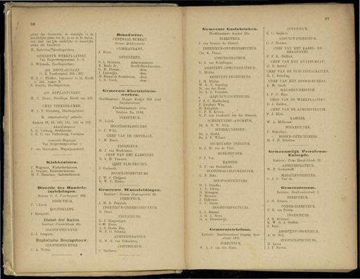 26 grens der Gemeente , de oostelijke en de noordelijke grens der 4e , Ie en de 2e Sectie , een deel van g;de zuidelijke en westelijke grens der Gemeente . W . Gabriëlse.TIoofdopzicliter . GEMEENTE WERKPLAATSEN . Van lleigersbergenstraat 2—8 . A . Wijnands , Hoofdopzichter . Afd . BESTRATINGEN . O . Z . Voorburgwal 205—207 . H . J . C . Pfeiffer , Ingenieur Ie kl . Hoofd v . Afd ., kamer 8 . S . Rooi'da , Hoofdopzichter . Afd . BEPLANTINGEN . H . C . Zwart , Hoofdopz . Hoofd van Afd . CHEF TEEKENKAMER . W . L . F . Grimberg , Hoofdopzichter . B . Administratief gedeelte . Kamers 98 , 99 , 100 , 101 , 104 en 105 . Administrateur . L . G . Verburg , Boekhouder . S . E . C . van Valkenburg , Commies . Gemeente - Magazijn . Van Beigersbergenstraat 2 . P . van Herwaarde , Magazijnmeester . Klokkenisten . J . Wageman , Westerkerkstoren . A . Pomper , Zuiderkerkstoren . M . F . Hasselaar , Oudekerkstoren . Directie der Handelsinrichtingen . Bureau O . Z . Voorburgwal 203 . " DIRECTEUR . F . ' s Jacob . HOOFDKLERK ; J . Spanjerdt . Dienst der Kaden . Kantoor Handelskade 40 «. IIOOFDOPZICHTER . A . J . Steegstra . Exploitatie Beursgebouw . IIOOFDOPZICHTER . C . A . Walter . Brandweer . CENTRAAL BUREAU Nieuwe Achtergracht . COMMANDANT . J . Me OFFICIEREN . G . A . Herklots , Administrateur . R . Boele Jr ., HoofdBrandmeester . G . H . Fiorani , idem . J . Lodewijks , idem . M . Brunet de Roehebrune , idem . A . G . Förch , idem . Gemeente-Klectriciteits-werken . Hoofdkantoor : Hoogte Kadijk 200 hoek Sarphatistraat . Klachtenkantoor : idem . Telefoon No . 5583 . DIRECTEUR . W . Lulofs . HOOFDBOEKHOUDER G . F . Wille . CHEF VAN DE CENTRALE . C . M . Brack . INGENIEUR . M . J . van Westrienen . CHEF VAN HET KABELNET . M . S . H . Trooster . QHEF ELECTR1CIEN . J . Gerhardt . HOOFD-INSPECTEURS . J . W . J . Cleijpool . R . W . C . Eisses . Gemeente Waterleidingen . Kantoor : Nieuwe Heerengracht 49 . DIRECTEUR . J . M . K . Pennink . INGENIEUR-ONDERDIRECTEUR . D . Drost . INGENIEURS . G . i . Hoogesteger . G.m . Evers . A . S . Docen Dzn . W . E . O . Schaalje . ADMINISTRATEUR . H . W . G . van Ockenburg . CONTROLEUR . . C . Heilbron . Gemeente Gasfabrieken » Hoofdkantoor : Amstel 2,9 «. DIRECTEUR . J . van Rossum du Chattel . INGENIEUR-ONDERDIRECTEUR . Chr . K . Visser . ADMINISTRATEUR . G . A . van Everdingcn . ASSISTENT-ADMINISTRATEUR ., T . Mulder . ASSISTENT-INGENIEURS . J . M . Muller . W . K . N . Geerling . M . van der Horst . Dr . L . J . Terneden . ADJUNCT-INGENIEURS . J . J . C . Hardenberg . J . Diephuis Wzn . H . Kempkers . U . P . E . Kriens . G . F . van Limborch van der Meersch . SCHEIKUNDIG-ADVISEUR , Dr . A . H . W . Aten . SCHEIKUNDIGEN . Dr . A . Stoffel . Dr . J . P . Wibaut . SECRETARIS DIRECTIE . H . J . M . van de Vliet . BOEKHOUDER . P . J . Vos . KASSIER . E . F . van Raamsdonk . HOOFDMAGAZIJNMEESTER . G . P . Zalm , HOOFDOPZICHTERS . II . J . Scheffer . A . A . Alting . 11 . Strengers . P . Brouwer . J . Dijkmans . C . F . Haver . HOOFDINSPECTEURS . L . J . Bresser . A . G . A . Buys . II . A . Zwaanswijk . Gemeentetelefoon . Kantoor : Raadhuisstraat ( ingang Spuistraat 168 ). DIRECTEUR . W . A . J . van den Hurk . INGENIEUR . G . C . Snijders . ADJUNCT-INGENIEUR . C . J . Neiszen . CHEF VAN HET KABEL - EN DRADENNET. P . F . G . Mellink . CHEF VAN HET HULPBURKAU , II . B . Butter . CHEF VAN DE HUIS-INSTALLATIEN . H . C . Schuling . CHEF VAN HET HOOFD-BUREAU . E . W . Stork . MAGAZIJNMEESTER . J . P . C . Ham . CHEF VAN DE WERKPLAATSEN . D . J . Gulden . CHEF VAN DE ADMINISTRATIE . P . J . Klok . KASSIER . W . A . Millenaar . BOEKHOUDER . P . Meereboer . HOOFD-OPZICHTERES . M . J . H . Scholten . Gemeentelijk l'etroleumEntrepOt . Kantoor : Prins Hendrikkade 23 . ADMINISTRATEUR . W P . Groeneveld . MAGAZIJNMEESTER . C . J . G . Tie ! Jr . Gemeentetram . Kantoor : Stadhouderskade 2 . DIRECTEUR . J . H . Neiszen . ONDER-DIRECTEUR . T . E . van Putten . INGENIEURS . J . R . Brünner . K . W . G . J . Stoffels . J . Knol . ASSISTENT-INGENIEUR . A . dé Meij . HOOFDINSPECTEURS . H . Lever . J . J . Pareen .