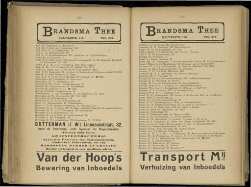 Gebruik tekstcoördinaten Transcriptie 172 173 ^ RANDSMA Thee KALVERSTR . 115 . TEL . 272 . JJrandsma Thee KAL VERSTE . 115 . TEL . 272 . Both ( G .) Gieterstraat , 8 . Meubelmaker . Both ( G . C .) Jacob van Eennepstraat , 258 . Both ( Wed . G . J .) Pontanusstraal , 10 . Both ( J . A .) Bilderdijkstraat , 69 .' Both ( J . C .) Rustenburgerstraat , 373 . Ambienaar bij ' s Rijksbelastingen . Bothe ( G .) da Costastraat , 5 . j . Bothe ( J . J .) Keizersgracht , 219 . Kantoor : Looiersgracht , 16 — 26 . Linieerder , Boekbinder en Boekdrukker . Tel . 8404 . Bothof ( G . J . W .) O . Z . Voorburgwal , 322—324 . Concierge . Botje ( G . H .) O . Z . Voorburgwal , 65 . Schilder . Tel 8319 . Botjes ( E .) Singel , 325 . Leeraar M.-O . in de Engelsche Taal . Bots ( F . V .) Nassaukade , 24 . Agentuur - en Commissiehandel in Granen en Meel . Tel . 9815 . Bots ( T . J .) Wijde Kerksteeg , 8 . Tapper . Bots ( Wed . W . J .) Ferdinand Bolstraat , 96 . Apotheek . Tel . K 1461 . Botschuijven l B .) Padangstraat , 9 . Timmerman . Botschuijver ( H . F .) Sarphatipark , 56 . Botschuijver ( W .) Nieuwe Oostenburgerstraat , 20 . Bottelier ( P .) Westcrdokstraat , 15 . Kleedermaker . Bottelier ( P .) Zeilstraat , 9 . Tel . 5B 1752 . Bottema ( J .) Pieter Langendijkstraat , 40 . Bottenburg ( H . A . van ) ' Bloemgracht , 45 . Boekhandelaar . Tel . 3581 . Bottenheim ( J . W .) Heerengracht , 505 . Tel . 2482 . Bottenheim ( S .) Koninginneweg , 132 . Bottenhorn ( C . F .) 2e van Swindenstraat , 62 . Botter ( A .) Wagenaarstraat , 47 . Rijksambtenaar . Botter ( J . P .) 3e Egelantiersdwarsstraat , 11 . Glazenwasscher . Botterman ( E . J .) Overtoom , 480 . 3e Etage . Adjudant Onderof . 22 « Landweerdistrict . Botterman ( H . F .) O . Z . Voorburgwal , 86 . Laarzenmaker . Botterman ( J .) Ie Helmersstraat , 141 . Botterman ( J . C .) Ie Hugo de Grootdwarsstraat , 83 . Botterman ( J . M .) Rozengracht , ' 241 . Botterman ( J . W .) Linnaeusstraat , 32 . Steenhouwer . Tel . N 5240 . BOTTERMAN ( J . W .) Linnaeusstraat , 32 , naast de Tramremise , recht tegenover het Burgerziekenhuis . Telefoon 52 *© Koord . Speciale l'abrieh van Grafnion urnen ten , Grafzerken , Graf kruisen , etc . van UARDSTEËX , BIBJIKB EM I;K1\1B1 ', Beslist vertrouwd , en zeer goedkoop adres » Van der Hoop's Bewaring van Inboedels Botterweg ( J .) Kerkstraat , 162 . Kleedermaker . Botterweg ( W . H .) Overtoom , 228 . Rijks-Ambtenaar . Böttger ( B . H .) Stadhouderskade , 48 . Arts . Böttger ( Jeanne ) P . C . Hooftstraat , 131 . Leerares Pianospel . Botti ( P . P . H .) Linnaeusstraat , 67 - Bottinga ( O .) Nassaukade , 77 . Botzen ( A .) Gerard Doustraat , 67 . Botzen Azn . ( E .) Ceramstraat , 2 . Gemeente-Ambtenaar . Leeraar M . O . Schoonschrijver Bouberg Wilson ( S . J .) Marnixstraat , 150 . Directeur van de Tooneelschool . Bouchette ( H . A . B .) Haarlemmerdijk , 53 . Goud - en Zilversmid . Tel . 2895 . Bouchier ( J . Bapt .) Rustenburgerstraat , 78 . Goudsmid . Bouchier ( P . P .) Jan Pieter Heijestraat , 139 . Boudewijn ( R .) J . J . Cremerplein , 32 . Gemeente-Ambtenaar . Boudewijn ( W . F .) Veerstraat , 79 . Bouhuijs ( D . R .) van Oldenbarneveldtstraat , 965 . Godsdienstonderwijzer . Bouhuijs ( F . J .) Wijdesteeg , 18 . Barbier . Bouhuijs ( H . ten ) van Boetzelaerstraat , 50 . Sigarenfabrikant . Boukamp ( Gezs .) P . C . Hooftstraat , 79 . Dameskleedermaaksters . Boukamp Wzn . ( Joh . F .) Beulingstraat , 15 . Behanger en Stoffeerder . Boukamp ( P . P .) Overtoom , 199 . In Chocoladewerken . Boukamp ( Wed . W . L .) Kerkstraat , 143 . Boulan ( E . A .) Prinsengracht , 582 . Leeraar in de Fransche Taal - en Letterhinde . Bouma ( Wed . A .) Sparrenweg , 13 . Bouma ( D .) van Oldenbarneveldtstraat , 90 . Bouma ( E . K .) Brouwersgracht , 6 . Huis - en Decoratieschilder . Bouma ( G .) 2e Egelantiersdwarsstraat , 17 . In Leder en Fournituren . Bouma ( G . A . L .) Marnixstraat , 1485 . In Tabak en Sigaren . Bouma ( J .) Jacob van Lennepkade , 150 . Smid . Bouma ( J .) Vinkenstraat , 29 . Bouma ( J .) Haarlemmerstraat , 46 . Tapper en Slijter . Bouma ( J . P .) Pretoriusstraat , 75 . Hoofdonderwijzer . Bouma Jr . ( R .) Marnixkade , 14 . Opzichter Teekenaar H . IJ . S . M . Bouma en Co . Vijzelgracht , 27 . Ferste Amst . Electr . Schoenfabriek . Tel . 8101 . Bouma en van der Linden . Brouwersgracht , 6 . Huis - en Secoratieschilders . Bouman ( A .) Bosboom-Toussaintstraat , 56 . Arts . Bouman ( Corns .) Pieter Baststraat , 29 . Handelsbediende . Bouman Azn . ( C .) Elisabeth Wolffstraat , 44 . Bouman ( C . W . J .) 2e Jan v . d . Heijdenstraat , 60 . Kruier en Aann . van Verhuizingen . Bouman ( D .) 3e Helmersstraat , 70 . Leeraar H . B . S . in Wiskunde en Boekhouden . Bouman Jr . ( D . A .) Bilderdijkstraat 190 . Boekhandelaar . Tel . 3fi 3836 . Bouman ( F . J .) Rozenboomsteeg , 8 . Bouman ( G .) Madurastraat , 62 . Reiziger . Bouman ( G .) Marnixkade , 11 . Monteur . Transport Mü Verhuizing van Inboedels Bouman ( H .) Kuiperstraat , 66 . Kruidenier . •