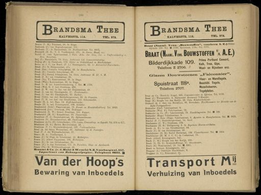 Gebruik tekstcoördinaten Transcriptie 180 181 2 ran ° sma Thee KAL VERSTE . 115 . O TEL . 272 . RANDSMA Thee y KALVEESTB . 115 . TEL . 272 . Boxem ( F . M .) Tolstraat , 58 . 3e Etage . Boxhoorn ( J .) van Hogendorpstraat , 101 . Boxhoorn ( Y .) 2e Nassaustraat , 13 . Boekhandelaar . Tel . 9305 . Boxstardt ( II . H .) N . Z . Voorburgwal , 181 . In Garen , Band , enz . Boxtel ( J . van ) Valeriusstraat , 5 Huis . Adm . der Gem ,. Inf . o . Uniform/deeding v . Gem . Beambten . Boij ( J .) Marnixkade , 70 . Huis . Ambtenaar b/d . Gemeentebelasting . Boijing ( H .) da Costakade , 172 . Slijter in Gedistilleerd en Bierbottelaar . Bozon en .). C . ten Bosch . ( P . L .) Heereagracht , 62 . In AutomoUel-FournUuren . Braak ( D .) 3e Helmersstraat , 47c . Braak ( Gez .) Cornells Schuvtstraat , 23 . In Manufacturen . Braak ( H .) Cornells Schuvtstraat , 23 . Braak ( H .) Gerard Schaepstraat , 14 . Huis . Ambtenaar M . IJ . S . M . Braak ( J . B .) van Ostadestraat , 29 . Braak ( Mej . T .) Kazernestraat , 26 . 2e Etage.Braak ( Wed .) Kazernestraat , 26 . 2e Etage.Braak ( G . B . ter ) Amstelveenscheweg , 7 . Tel . % 1778 . Braak ( Wed . G . J . ter ) Overtoom , 439 . Braak ( J . W . van ) Ie Jan van der Heijdenstraat , 48 . Braak ( J . van de ) Elandsgracht , 37 . Hoedenmaker . Braak ( L . van de ) Elandsgracht , 32 . Barbier . Braak ( Gebrs . van der ) Eustenburgerstraat , 98 . In Groenten . Braak ( T . H . van der ) van Ostadestraat , 112 . Schoenmaker . Braake ( E . A . ter ; Dam , 14 . Koffiehuishouder . Braake ( H . L . ter ) Prinsengracht , 586 . Schilder . - v Braakensiek ( Gebr .) Planciusstraat , 79 . Kunst - en Handelsdrukkerij . Tel . 3922 . Braakensiek ( Joh .) Overtoom , 294 . Teekenaar . Braakensiek ( K . W .) Gerard Doustraat , 252 . Kapper . Braakensiek ( M . H .) Kanaalstraat , 69 . Timmerman . Braakhuis ( T . J .) Domselaerstraat , 25 . Rijksambtenaar . Braakman ( B .) Domselaerstraat , ' 49 . Onderwijzer . Braakman en Co . ( H .) Achterburgw ., 179 . Comm . Cönvooiloop . en Expedit . Tel . 576 en 577 . Braakman ( H . G .) Buiten Brouwerstraat , 13 . Braakman ( P . C .) Kloveniersburgwal , 127 . farkensslachter . Braal ( A . de ) Saxen Weimarlaan , 22 . Ambtenaar bij de Posterijen . Braal ( P . J . de ) Wijttenbachstraat , 37 . Braam . ( G . A .) Visscherspad , 7 . Braam ( J .) 3e Hugo de Grootstraat , 12 . Melkslijter . Braam ( J .) Albert Cuypstraat , 186 . Melkslijter * Braam ( K .) 2e van Swindenstraat , 94 . Braam ( P .) Ie Jan Steenstraat , 117 . In Porselein , Glas - en Aardewerk . Braam ( Th .) St . Willibrordusstraat , 38 . Braaiug &. Co . ( v . d.Hulst & We^acis ) 1 » i .%. I oorbnrtj wal , ÏSÏ . Importeurs van tVehangsetpapier . Teleplioon 6644 . Hf Van der Hoop's Bewaring van Inboedels » raat ( Waaml . Venn . „ Bouwstoffen ", voorl.een A . E .) Bilder - dijkkade 109 . Tel . * 2706 . Spuistraat , 118 «. lel . 2707 . Braat ( Naa ML V E hh . Bouwstoffen % A.E .) _., , .. . , trkCk Prima Portland Cement , Bilderdijkkade 109 . Kalk ? Tras > Gi p S , Telefoon Z 2706 . t Waal - en Rijnsteen enz . Glazen Bouwsteenen „ Falconnier ". Vloer - en Wandtegels , SpUIStraat 1l8 a . Beschild . Tegels , Telefoon 2707 . Mozaïkvloeren , Tegelplaten . Braat en Co . ( Hendrik ) Singel , 338 . Commissionairs in Effecten . Tel . 9108 . Braat ( J .) Weesperplein , 5 . Stalmeester Brouwerij t Haantje . Braat CR ) Hooïte van den Kadiik , 22 . Huis . Kantoorbediende . f Braband ( A J van)\an Breestraat , 82 . Bovenhuis . Hoofdcommies ter DirecUe van de Ryks-Postspaarbank . Brabander ( Carl ) Valeriusstraat , 9 . Brabander ( Wed . F .) Valeriusstraat , 79 . Brabander en Co . ( F .) Valeriusstraat , 79 . Handelsagenten . Tel . Ma 180 . Brabander ( Hugo ) Valeriusstraat , 9 . ■ „ „„ a ,. Brabander en Zoon ( Hugo ) Valeriusstraat , 9 . Agenten m Manufacturen . Tel . A ÓMh . Brachel ( P . J .) Rustenburgerstraat , 54 . Smid . Brachmann ( C . W .) Overtoom , 132 . Brachmann ( H . G .) Heiligenweg , 2 . In Engelsche Heeren-artikelen . Bracht ( A . H .) Ie van Swindenstraat , 34 . Bracht ( S .) 2e van Swindenstraat , 29 . Brachthuizer ( H . B .) Roelof Hartstraat , 159 . Vleeschhouwer . Tel . W , 1804 Brachthuizer ( H . M . J . C . G .) da Coatastraat , 70 . Brack ( Alfred ) Keizersgracht , 347 . Brack ( C . M .) Hoogte van den Kadijk , 200 . Brack ( H . Th . G .) Kraijenhoffstraat , 21 . Steenhouwer . Brack ( M .) Vossiusstraat , 19 . Tel . 95 3361 . ' Brack en Kettner . Keizersgracht , 347 . Braggaar ( A .) Oostelijke Handelskade , 6 . Braggaar ( A . C .) Binnenkant , 25 . ^^^^^ Transport fVï Verhuizing van Inboedels