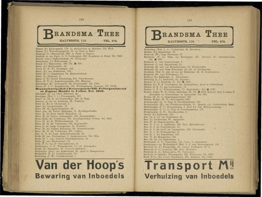 Gebruik tekstcoördinaten Transcriptie 188 189 RANDSMA Thee KALVERSTR . 115 . TEL . 272 . randsma Thee KALVERSTR . 115 . TEL . 272 . Brasser ( B .) Keizersgracht , 179 . In Antiquiteiten en Makelaar . Tel . 8fel2 . Brasser ( L .) Wittenburgergracht , 27 . In Goud en Zilver Brassinga ( A .) Marnixstraat , 269 . In Tabak en Sigaren . Bratfisch en van Gigcli , O . Z . Voorburgwal , 223 . Kooplieden in Tabak . Tel . 7937 . Bratsch ( Alex .) Stadhouderskade , 83 . Photograaf . Brauckmann ( J .) Madurastraat , 2 . Brauer ( G .) Marnixstraat , 360 . Tel . ' M , 396 . Braün ( A .) Houtmankade , 42 . Braun Jr . ( F . W .) Nassaukade , 150 . Braun ( H .) van Ostadestraat , 165 . Braun ( H . J .) Dusartstraat , 54 . Kantoorbediende . Braün ( J .) Delistraat , 6 . Braun ( J . D .) Govert Flinckstraat , 374 . Vleeschhouwer . Braun ( P . G . O .) Rustenburgerstraat , 295 . Makelaar . Braunberger ( D .) Achtergracht , 35 . Kleedermaker . Tel . 7305 . Brauns ( P . J . C .) Sarphatistraat , 169 . Werktuigkundig Ingenieur . Tel . 10136 . Braunschweig { Juli .) tteizersgraclit 3*5 . Pelterijen fabriek en JEngros Bundel in Vellen . Tel . 405S . Braunstahl ( H . A .) Frans Halsstraat , 44 . Brautigam ( Wed . J . L .) Prinsengracht , 507 . Brauw ( A . Th . R . de ) Ceintuurbaan , 398 . 2e Etage . Brauwer ( A . de ) ten Katestraat , 36 . Winkelier . Brave ( A . B -) Qe Clercqstvaat , 2 . Brave ( S .) Commelinstraat , 18 . Brave ( W . B .) Bgelantiersgracht , 22 . Brave ( Am . de ) Nieuwe Kerkstraat , 75 . Brooddepothouder . Brave ( A . de ) Jonas Daniël Meijerplein , 18 . Brave ( B . de ) Nieuwe Achtergracht , 109 . Diamantsnijder . Brave ( Gebr . de ) Vrolikstraat , 305 . Hoofdageutschap Fortuna . Tel . 9991 . Brave ( H . de ) St . Willibrordusstraat , 71 . Brave ( H . M . de ) Vrolikstraat , 305 . Sigarenmaker . Brave ( J . de ) Larige Koningstraat , 35 . Winkelier . Brave ( M . de ) Andreas Bonnstraat , 23 . Diamantbewerker . Brave ( M . M . de ) Vrolikstraat , 307 . Coiffeur . Bray ( A . P . de ) Lange Leidschedwarsstraat , 84 . Brede ' ( H . van ) Prinseneiland , 2 . Goederenvervoer . Tel . 7674 . Breda ( M . C . van ) Frederik Hendrikplantsoen , 74 . Breda ( P . van ) Blankenstraat , 12 . Breda ( P . Ij . van ) 2e Marnixplantsoen , 2 . Breddermanu ( F . P .) Warmoesstraat , 17—19 . Hotelhouder . Bredée ( J .) Nassaukade , 84 . Gemeente- Amblenaat . Bredemeijer ( Alex .) van Beghenstraat , 53 . Agent in Manufacturen . Bredenbach ( B . E .) Haarlemmerdijk , 23 . Bredenberg ( J . W .) Vondelkerkstraat , 1 . Van der Hoop's Bewaring van Inboedels Bredenberg ( Wed . L . A .) Vondelstraat , 68 . Bovenhuis . Bredero ( P.V Dapperstraat , 27 . Brederode ( W .) Czaar Peterstraat , 87 . \ . Brederode ( W . J .) Frans van Mierisstraat , 137 . Directeur der Associatie-Cassa . Tel . ' M , 388 . Brederode ( C . van ) Pontanusstraat , 9 . Brederode ( C . van ) Dapperstraat , 51 . Brederode ( D . van ) van Boetzelaerstraat , 19 . Kleedermaker . Brederode ( D . van ) Czaar Peterstraat , 45—47 . In Aardappelen . Brederode ( Wed . G . van ) Ie van der Helststraat , 42 . In Grutterswaren . Brederode ( W . van ) Tollensstraat , 71 . Brederoo ( N .) Kattenlaan , 4 . Schoenmaker . Bredestijn ( L . J .) Kerkstraat , 84 . Exporteur . Bredius ( A . J .) Oosteinde , 21 . Tel . UK 2251 . Bredius ( O ) N . Z . Voorburgwal , 84 . Gisthandelaar . Agent in Gedistilleerd . Bredius ( J . K . J .) Jan Luykenstraat , 10 . Bredius ( J . F . L .) Willemsparkweg , 77 . Banketbakker . Tel . ' Ma 3767 . Bredius ( Johan W . F .) Oranje Nassaulaan , 33 . Tel . ' M 1653 . Kantoor : Spui , 7 , kamer 6 . Assuradeur en Commissionair in Assurantiën . Tel . 865 . Bredius ( W . E .) Ie Spaarndammerstraat , 133 . Bredius W.Ezn . ( W . E .) Keizersgracht , 283 . Bredschneijder ( A .) Ie Hugo de Grootdwarsstraat , 125 . Bredschneijder ( H .) van Oldenbarneveldtkade , 11 . Beambte a/d . Nederlandsche Bank . Bredschneijder ( J . C .) Rosmarijnsteeg , 8 . Bode bjh Ned . Bijbelgenootschap . Bredschneijder ( J . O ) Ie Hugo de Grootdwarsstraat , 129 ., Bredschneijder ( J . H .) Monnikeustraat , 2 . Bredijk ( L .) Kerkstraat , 344 . '• Bree ( A . J . G .) van Ostadestraat , 25 . Bree ( J .) Kinkerstraat , € 7 . Aanspreker . Bree ( F . de ) Saxenburgstraat , 26 . Bree ( F . J . de ) Ie itjehstraat , 103 . Huis . Rijksambtenaar . Bree ( J . J . de ) Potgieterstraat , 57 . Bree ( J . J . de ) Jacob van Lennepstraat , 190 . Schoenmaker . Bree ( J . J . de ) Pontanasstraat , 51 . Bree ( L . J . de ) Kanaalstraat , 168 . Bree ( T . de ) Borgerstraat , 150 . Bree ( H . la ) van Eeghenstraat , 4 . Breedenbeek ( A . F .) Nassankade , 122 . Comm . in Assurantiën . Breedenberg—van Wolframsdoïff ( Wed . L . J . van ) Brouwersgracht , 120 . Breedveld ( G . J .) Weesperzijde , 53 . Leeraar Boekhouden M . O . Breedveld ( J . J .) Overtoom , 290 . Huis . Mectricien . Breedveld ( L . A .) Bellamyplein , 38 . Onderwijzer . Breedveld en Schroder . Prinsengracht , 522 . Electriciens . Tel . 3979 . Breek P.Czn ( H .) Govert Flinckstraat , 236 . Makelaar . Tel . 1064 . Transport Mü Verhuizing van Inboedels