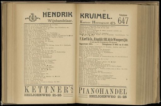 807 KRUIMEL , Z *% Kantoor : He erengracht 473 . Vj^T I Korenhof ( J . G .) Dapperstraat , 93 . In Huishoudelijke Artikel , n Korenmeterskantoor ( Het ) N.Z . Kolk , 28 . Tel 76Ó6 Korenstra ( H .) Overtoom , 73 Korf rw r H \ P H P ' C - f H °: ft t raat ' 62 ' *'**■ Loodgieter , Leidekker , enz . fcort ( w . H .) Heniouystraat , 66 . Korff ( A . J .) Elisabeth Wolffstraat , 79 . Onderwijzer af « 5 ? erf * 4 < 8 T2 . > ^^ 103 ^ Wee9 P erzi J de - Cacao fabrikanten . Tel . P . Korff & Co ., RiDgdyk 103 , öü de Weespepzijde - CACAOFABBIKANTEN Opgericht 1811 . Telephoon Z 4851 en Z 4852 . Kovff m V ' V Joh ™ ne3 Verhulststraat , 11 . Bovenhuis . Zendeling onder ' Israel Koirt ( J .) Jacob van Lennepstraat , 39 . v " T l ( LF -,^ Roelof Hai - tetraat , 148 . Kleedermaker . Korlt ( W .) Nicolaas Beetsstraat , 104 . In Brandstoffen 806 HENDRIK Wijnhandelaar . Koppel ( D . J . A . van de ) Roelof Hartstraat , 66 . In Tabak . Koppel ( M . van de ) Pieter Nieuwlandstraat , 102 . Kopprl ( P . van de ) Sarphatipark , 40 . In Comestibles , Fijne Vleeschwaren , enz . Koppel ( H . W . van der ) Weteringschans , 67 . Koppelle ( H . J .) Brouwersgracht , 131 . Koppelle ( Wed . J .) Brouwersgracht , 131 . Koppelle — de Koe ( T .) Brouwersgracht , 131 . Verloskundige . Koppelman Jr . ( J . N .) Firma P . A . J . Jansen . Amsteldijk , 54 . Koppen ( Gebrs .) Jac . v . Lennepk ., 127-129 . Fabrik . der Hygi'én . verp . Suikertabl . Tel . SE 3416 Koppen ( Wed . J . C .) Nieuwe Heerengracht , 71 . Tapperij en Slijterij . Koppen ( J . J .) Saenredamstraat , 26 . Schilder . Koppen ( Wed . P .) Kalverstraat , 36 . Tel . 7867 . Koppen ( P .) Jacob van Lennepkade , 127 . Koopman . Koppen ( P . S .) Hoogte Kadijk , 106 . Koppen ( W . C .) Rusland , 11 . Melkslijter . Koppenhagen ( W . van ) Bilderdijkkade , 30a . Bel-étage . Leeraar M . O . Boekhouden . Koppenbout ( J . C .) Celebesstraat , 15 . Koppenol ( H .) Javaplein , 31 . Bouwkundig Opzichter . Koppenol ( J .) Hasebroekstraat , 52 . Kopper ( K .) Albert Cuypstraat , 144 . In Zout , Zeep , enz . Koppert ( Mej . C .) St . Willibrordusstraat , 95 . Wasch - en Strij kinrichting . Koppes ( P .) Ie Helmersstraat , 150 . Muziekleer aar . Koppescbaar ( Wed . Carel ) Gravenstraat , 24 . Koppius ( Dr . W . J .) Frans van Mierisstraat , 113 . Koppius ( Z .) Kinkerstraat , 314 . Sigarenmagazijn . Koppijn ( W .) Bellamyplein , 30 . Kops Jzn . ( J .) Bethaniëndwarsstraat , 16 . Brievenbesteller . Kops ( J . G .) Utrechtsehedwai'sstraat , 62 . Ie Etage . Kops ( P . A .) Swammerdamstraat , 61 . In Comestibles . Kops ( P . E .) Palmstraat , 90 . Schilder . Kops ( W . P .) van Breestraat , 172 . Tel . ZS 2487 . Kopuit ( A .) 2e Jan Steenstraat . 114 . Diamantsnijder . Kopuit ( M .) 2e Jan van der Heijdenstraat , 87 . Kopuit ( S . B .) Ceintuurbaan , 290 . Tel . K 1338 . Kopuit ( S . B .) Alexander Boersstraat , 6 . Kordes ( J .) von Zesenstraat , 4e . Koreraan ( Wed . C .) Wijttenbachstraat , 36 «. Koreman ( L . C .) Vrolikstraat , 264 . Korernau ( L . T .) Willemsparkweg , 62 . Makelaar . Tel . Z 2176 . Koreman & Co . Rokin , 51 . Tel . 9794 . Koremans ( C .) Wa^enaarstraat , 2 . Koren ( A .) Singel , 31 . Tel . 8873 . Koren ( A .) Burmanstraat , 35 . Grossier in Schoenen . Tel . 9927 . Koren ( I .) Gelderschekade , 21 . KETTNER's HEILIGBNWEG 21-25 ZZZZ u cc o A , t ," """™"'""' *»">• -"« JJianaswr/en . Korff & Co . ( Firma Wed .) O . Z . Kolk , 11 . Wijnhandelaren . Korlaar ( A . F . van ) Kuiperstraat , 166 . Korlaar ( K . van ) Ie Jan Steenstraat 140 KOrl Tel.T280 aD ) P " °" Ho0ftstmat ' 35 - ^ ecteur-Gérant Kon . Ver.Met Ned . Tooneel . Korman ( W . C .) Daniël Stalpertstraat , 96 . In Fruit Kom ( J .) Leidschekade , 96 . Huis . Kora ( O . E .) Leidschekade , 93 . Pension „ Boston ". Tel . 35 3408 Kornalijnslijper ( B .) Nieuwe Kerkstraat , 97 . Kornalijnshjper ( N .) Lange Houtstraat , 49 . In Groenten SSffi f . T L : jj S^ÏÏS&sr 49 ' u ™ m s — SS SJbÜKSJEIT l - Grossiers in Boter > Kaas en M ™ : ™- *»<>■ Korngold ( J .) Ceintuurbaan , 416 . Makelaar Komman ( A . H . G .) Tollensstraat , 62 . Gemeente-Ambtenaar Komman ( I .) Bankastraat , 2 . Komman F Wzn . ( J .) Celebesstraat , 20 . In Koloniale Waren Komman ( J . O .) Kerkstraat , 169 . Handel in Kanarievoaels SüT ' i J ? i " f*5 krtï « fc 138 - In Huishoudelijke Artikelen . Komman ( Wed . J . J .) Overtoom , 328 . 2e Etaee Komman ( K . P .) Palmstraat , 47 . ' Komman ( L . K .) Borgerstraat , 93 . Komman ( T . L .) Paardekraalstraat , 7 Komman Jr . ( T . L .) Majubastraat , 14 . Kantoorbediende . PIANOHANDEL 1 HEILIGENWEG 21-25