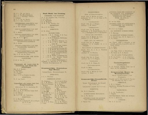 30 31 Mr . P . L . M . van Qgtt'op . ■ Mevr . A . Ter Horst-Outshoorn . Mevr . J . A Verschuijl—Veltman . J . Jonkman . Dr . L . C . van der Meulen . Mr . G . J . Salm , Secretaris . GENEESHEER-DIRECTEUR VAN HET BINNEN-GASTHUIS . Dr . J . Ed . StumprT . ' ADJUNCT-DIRECTEUR VAN HET BINNEN-GASTHUIS . W . J . Render . ADJUNCT-DIRECTRICE VAN HET BINNEN-GASTHUIS . Mej . M . H . E . JJpbrns . GENEESHEER DIRECTEUR VAN HET WILHELMINA-GASTHUIS . Dr . J . Kuiper . ADJUNCT - DIRECTEUR VAN HET WILHELMINA GASTHUIS . C . J . A . Soutendam . ADJUNCT-DIRECTRICE VAN HET WILHELMINA-GASTHUIS. Mej . C . G . van der Horst . HOOFDBOEKHOUDER DER BEIDE GASTHUIZEN. F . H . D . Kop Jr . Commissie als voren over de Inrichting voor Stads Bestedelingen . Mej . E . S . Bienfait . C . Hesterman . Mr . Th . Stuart . A . J . Joling . Mevr . L . J . van Kuijkhof-Koedijk . DIRECTEUR . W . F , van Voorst . Commissie als voren voor het Burgerweeshuis . Kalverstraat 92 . St . Imciënsteeg 27 . W . E . | 0 . Druyvesteyn . Mevr . A . M . M . Everwijn Lange-Doefi . J . ter Haar Jr . S . van Lennep . , Mr . J . F . Th . van Valkenburg . DIRECTEUR : G . A . Haringman . Kantoor : St . Luciënsteeg 27 , alle werkdagen van 9—4 uur . Stads Bank van Iieening -, COMMISSIE VAN TOEZICHT . * ■ Dr . N . M . Josephu's Jitta , Voorzitter '. J . ter Haar Jr . J . G . Schlencker . H . H . Wollring . M.H . G . Th . Fiedeldy Dop . SECRETARIS . Mr . J . P . II . Kroon . DIRECTEUR . H . M . Giltay . BANKHOUDERS . Bank No . 1 . R . J . Wolsak , O . Z . Voorburgwal 300 . „ „ 2 . H . P . Brinkman , Rechtboom sloot 5-7 . „ „ 3 . G . Remmert , Borgerstr . 11 . „ „ 4 . W . J . F . F . Lintz , Lepelstraat 20 . „ „ 5 . W . F . K . Verburg , Leidsche kruisstraat 34-36 , „ „ 6 . H.D . Luijrink,Prinsengr.437 . „ „ 7 . H . Wolsak , Marnixstraat 315 . » „ 8 . O Koning , Lindengracht 204 . ti n 9 . Ch . H . G . FEspagniol , Heeren markt 10-12 . „ „ 10 -, B . Mulder , Conradstraat 18e . „ „ 11 . H . van Munster ,' Gerard Donstraat 156 . „ „ 12 . C . Verheul , Wijttenbachstr . 7 . Hulpbank A . Beheerder G . J . de Ridder , Frederik Heudrikplantsoen 20 . Gemeentelijke Cfeneeskun« lige Dienst . Centraal-Bureau : Kloveniersburgwal 78 . DIRECTEUR . J . L . C . Wortman . GEMEENTE-ARTSEN . P . J . O . van der Meer . Dr . O J . Mijnlieff . A . ' L . Nova . Dr . H . Pinkhof . Dr.D.A . van Riemsdijk . R . Rijkens . J . H . L . Terwogt . J . A . Verschuijl . J . J . Voorhoeve . Dr . H . B . L . Vos . Dr . G . A . M . van Waijenburg . Dr . J . C . Went . Dr . J . M . Wentzel . I . Zeehandelaal ' J.bzn . Th . Beijerman . Dr . J . W . Blooker . Mevr . P . P . Bouman Slaterus . J . J . Brouwer . N . P . Catenius . O L . Deijll . A *. EkermSn . Mevr . Joh . B . O J . de Haanvan Maarseveen . . 1 , M . Hamelberg '. L . Heijermans . H . Kooistra . Dr . S . J . de Lange . . T . Leda . POLIKLINIEKEN . Huid - en Geslachtsziekten : Hoofd : Prof . S . Mendes da Costa . Assistenten : Dr . E . van der Hoop en Th . M . Passtoors . Tandheelkunde : Hoofd : Prof . Dr . J . Rotgans . Assistent : J . Ph . Backer . Oogheelkunde : Hoofd : Prof . Dr . M . Straub . Assistenten : A . W . Mulock Houwer , Dr . J . P . A . Hoefnagels en Dr . O Otto Roelofs . Ziekten dek ubinewegen : Hoofd : Prof . S . Mendes da Costa . Assistent : O A , H . Rochell . Keel -, neus - en ookziekten : Hoofd : Prof . Dr . H . Burger . Assistenten : F . H . Kuipers , H . O A . Campagne . Zenuwziekten en electro-theraïie : . Hoofd : Prof . Dr . J . K . A . Wertheim Salomonson . Assistent : Dr . B . Brouwer . Gynaxcologie . Hoofd : Prof . Dr . H . Treub . Assistent : Dr . L -. F 1 . Drigssen . Okthopaedie Hoofd : Dr . C . B . Tilanus Jr . Favus-behandeling . Hoofd : D . Muijs . Lupusbehandeling . Hoofd : Prof . S . Mendes da Costa . Assistent : D . Muijs . Gemeentelijke Gezondheidsdienst . Bureau : Groeneburgwal , 44 . Geopend van 9 — 8 uur . Laboratorium geopend van 9 — 4 uur . DIRECTEUR . Dr . H . G . Ringeling . SCHEIKUNDIGE BOTANICUS . Dr . L . Th . Reicher . ADVISEUR VOOR DE KEURING VAN VOEDINGSMIDDELEN . J . Mazure Czn . ADVISEUR VOOR HET TOEZICHT OP DE KEURING VAN TOEBEREID VLEESCH.VAN WILD EN GEVOGELTE EN VAN VISCH , WEEKEN SCHAALDIEREN . IJ . van der Sluijs . ADVISEUR VOOR DÉ AETIOLOGISCH DIAGNOSTIEK VAN INFECTIEZIEKTEN . Dr . J . J . van Loghem lste ASSISTENT SCHEIKUNDIGE . J . O Berntrop . 2e ASSISTENT SCHEIKUNDIGEN . O J . Schmidt Azn ., H . H . Jansen en F . O M . Jansen . KEURMEESTERS van Vleesch , Wild en Gevogelte en van gerookt , gezotiten of op andere wijze toebereid Vleesch . G . A . Stiess . W . O Drost . van Viscji , Week - en Schaaldieren . O M . Gomes en P . de Ruyter . van alle andere Voedingsmiddelen . J . W . van Vooren . ' J . A . Andriessen.G . O de Wit . C . L . A . Hartman . Ontsmettingsdienst . CONTROLEUR . D . H . Duintjer , beambte belast met de zaken van het aanplakken . Gemeentelijk Bouw - en Woningtoezicht . Bureau Valekenierstraat % hoek Weesperptein . Geopend van 9—121/2 en van 2—51/2 uur . ( des Zaterdags van 8%—1 uur .) DIRECTEUR . J . W . O Tellegen . Spreekuren : Dinsdag , Woensdag en Vrijdag 3 — 5 uur . INSPECTEURS . J . A . van Voorthuijseu . A . Keppler . BOUWKUNDIGE , CHEF DE BUREAU . M . B . N . Bolderman . COMMIES . Mr . S . J . van Lier .
