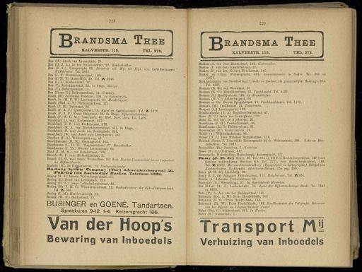 Gebruik tekstcoördinaten Transcriptie 228 229 RANDSMA Thee KATiVEBSTB . 115 . TEL . 272 . Bus ( H .) Jacob van Lennepkade , 78 . Bus ( H . J . A .) Ie van Swindenstraat , 22 . Banketbakker . Bua ( J . C .) Weesperzijde , 23 . Directeur v/d . Mij . tot Expl . v/h . Café-Restaurani d'IJsbreeker . Tel . 3882 . Bua ( J . F .) Rustenburgerstraat , 1165 . Bua ( J . H . T .) Amateldijk , 29 . Tel . 5K 2246 . Bus ( L . J .) Kinkerstraat , 12 . Bus ( t .) Molukkenstraat , 66 . Ie Etage , Reiziger . Bua ( T .) Zeeburgerstraat , 15 . Bus ( Firma T .) Zeeburgerstraat , 15 . Grutteri ). Busch ( B .) Ferdinand Bolstraat , 105 . In Galanterieën . Buscb Jr . ( H . F . B .) Lauriergracht , 82 . Handelsagent . Buscb ( Wed . J . F .) " Willemsparkweg , 171 . Buscb ( J . H .) Balistraat , 36 . Buscb ( P . J . F .) Quellijnstraat , 15 . Agent en Commissionair . Tel . IK 1213 Busch ( P . J . P .) Frana Halastraat , 36 . 2e Etage " Rijkszuivelvisiteur Busch ( P . W . C . M .) Oosterpark , 46 . Med . Doet . Arts . Tel . 7468 . Buschbacb ( J . van ) Kinkerstraat , 277 . Buscbbacb ( J . F . van ) Kinkerstraat , 273 . Buschbacb ( M . A . van ) Rustenburgerstraat , 437 . 2e Etage . Buschbach ( P . van ) Jacob van Lennepkade , 295 . Buschbach ( W . van ) Jacob van Lennepstraat , 161 . Buschen ( J . A .) Willemsparkweg , 49 . Buschhammer ( R . M .) Heerengracht , 302 . Buscbmann ( C . H . W .) Wagenaarstraat , 27 . Broodbakker . Buachmann ( J . Th .) Nieuwe Looiersstraat , 84 . Busé ( J . M . M .) van Ostadestraat , 168 . Buseck ( G . F . van ) Bilderdijkstraat , 3 . Buseck ( HG . vanï Saxen Weimarlaan , 20 . Huis . District-Commandant tevens Inspecteur- der RyksveldwacH . Bushele ( M .) 2e Helmersatraat , 14 . Restauratiehouder . Bnshong S JS # m Company < Tl.e ) Kloveniersburgwal 56 . Fabi- tek van Mjosbliulige Hoeken . Telefoon S838 . Busing ( A . J .) Groote Wittenburgerstraat , 27 . Busing | E .) Jacob van Lennepkade , 221 . Busing ( H . L .) Lange Leidschedwarsstraat , 53 . Busing ( Mr . J H . C .) Wouwermanstraat , 22 . Onderdirecteur der Rijks-Postspaarbank lel . ' A lbo . Busing ( J . M .) Haarlemmerdijk , 51 . Busing ( W . H .) Bankastraat , 53 . BUSINGER en GOENÉ . Tandartsen . Spreekure n 9-12 , 1-4 . Keizersgracht 186 . Van der Hoop's Bewaring van Inboedels randsma Thee KALVEESTB . 115 . ' ) TEL . 272 . *# Busken ( A . van den ) Bloemstraat , 142 . Kistenmaker . Busken ( J . van den ) Kwakersstraat , 12 . Busken ( P . van den ) Govert Flinekstraat , 247 . Busker en Claus , Prinsengracht , 485 . Commissionairs in Suiker . Tel . 205 en 10670 . Buskruidmakers van Noordholland , Utrecht en Zeeland , ( de gezamentlijke ) Heerengr . 204 . Tel . 4228 . Busman ( B . G .) van Wouatraat , 90 . Busman ( G . C .) Monnikenstraat , 23 . Vischhandel . Tel . 4130 . Busman ( S .) Quellijnstraat , 124 . In Brandstoffen . Busman ( W . C .) Achterburgwal , 26 . Busman en Co . Nieuwe Spiegelstraat , 18 . Vischhandelaars . Tel . 1181 . Busnacb ( M .) Vrolikstraat , 79 . Timmerman . Busquet ( A .) Lauriergracht , 132 . Busschenhenke ( F . A .) Reguliersdwarsstraat , 47 . Büsse ( B . C .) Jacob van Lennepkade , 120 . Bnsse ( C . van der ) Ie Atjebstraat , 21 . Busselman ( J . H .) Commelinstraat , 36 . Busselmann ( L .) Ie Helmersstraat , 31 . ' Bussemaker ( M .) Frederiksplein , 19 . Busser ( A .) Wijttenbachstraat , 86 . Busser ( D . J .) Joan Melehior Kemperstraat , 113 . Bussink ( Firma J . Zomerdijk ) Heerengracht bij de Wolvenstraat , 286 . Koks en Ban- ketbakkers . Tel . 2932 . Bussmöller ( Th .) Zoutsteeg , 7 . Kastelein . Busso ( W . A .) Overtoom , 517 . Bussumsche Waterleiding-Maatschappij . Keizersgracht , 127 . Bussy < JT . H . de ) Rokin , 60 . Tel . 675 en 2719 en Rustenburgerstraat , 148 ( voor Kantoor aankondiging Stations S.S . Tel . 2721 , voor Rustenburgerstraat , 148 , Tel . UK 1890 ). Mercuur-Stoomdrukkerij ( Typographic en Lithographic ). Fabriek van Kantoorboeken , Boekhandel . Advertentie-Bureau . ( Zie pag . 230 .) Bussy ( J . H . de ) Amateldijk , 23 . Bussy ( I , J . de ) Johannes Verhulststraat , 113 . Hoogleeraar . Tel . ' Ma 924 . Bustin ( A .) Johannes Verhulststraat , 53 . Busweiler ( G .) Westerstraat , 97 . In Geschilderde Meubelen . But H.Jzn . ( A . J .) Leidscbekade , 78 . Agent der Rijjksverzekerings Bank . Tel . 7349 Bute ( P .) Ie Jan van der Heijdenstraat , 141 . Butenuth ( Mej . A . M .) Prins Hendrikkade , 152 . Butenutb ( H . G .) Prins Hendrikkade , 152 . Butenuth ( H . W .) Prins Hendrikkade , 152 . Hoofdcommies der Telegrafie . Beheerder van het Bvjpost - en Telegraaf kantoor Amstel Buter ( Mej . C .) Kinkerstraat , 281 . In Hoeden . Buter ( H .) Nassaukade , 1 . Transport Mü Verhuizing van Inboedels