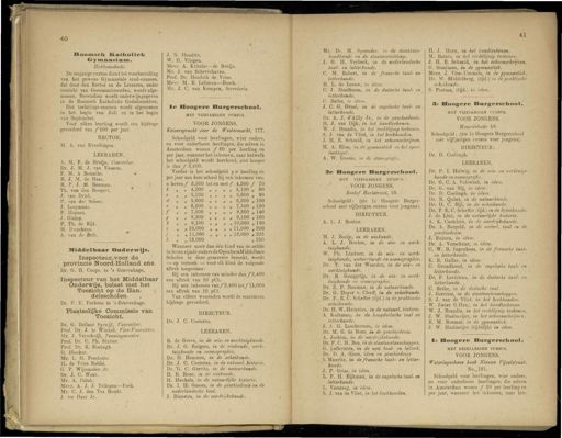 40 41 Roomscli Katholiek Oymnasinm , Sobbemakade . De zesjarige cursus dient tot voorbereiding van het gewone Gymnasiale eind-examen , dat door den Rector en de Leeraren , onder toezicht van Gecommitteerden , wordt afge- nomen . Bovendien wordt onderwijs gegeven in de Roomsch Katholieke Godsdienstleer . Het toelatings-examen wordt afgenomen in het begin van Juli en in het begin van September . Voor eiken leerling wordt een bijdrage gevorderd van ƒ 100 per jaar . RECTOR . M . A . van Everdingen . LEERAREN . A . il . F . de Bruijn , Conrector . Dr . J M . J . van Vessem . F . M . A Bonnike . E . J . M . de Haas . R . P . J . M . Bouman . Th . van den Boogert . J . van Driel . P . van der Scheer . J . Looymans . P . Hoenen . J . Gielen . P . Th . de Rijk . H . Dunrkens . A . van de Belt . middelbaar Onderwijs . Inspecteur voor de provincie Noord- Holland enz . Dr . G . H . Coops , te ' s Gravenhage . Inspecteur van het Middelbaar Onderwijs , belast met het Toezicht op de Han - \ delsscholen . , Dr . P . E . Eockens te ' s Gravenhage . Plaatselijke Commissie van Toezicht . Dr . G . Bellaar Spruijt , Voorzitter . Prof . Dr . J . te Winkel , Vice-Voorzitter . Mr . J . Verschuijl , Prof . Dr . C . Ph . Sluiter . Prof . Dr . R . Sissingh . D , Blooker . Mr . L . H . Eeschotte . H . de Vries Robbé . G . P . Wijomalen Jr . Dr . J . C . Went . Mr . A . Polak . Mevr . A . J . J . Teilegen—Fock . Mr . C . J . den Tex Bondt . J . ter Haar Jr . J . N . Hendrix . W . H . Vliegen . Mevr . A . Kritzler — de Bruijn . Mr . J . van Schevichaven . Prof . Dr . Hendrik de Vries . Mevr . M . E . Leliman—Bosch . Mr . J . C . van Kempen , Secretaris . Ie Hoogere Burgerschool . MET VIJFJARIGEN CUESUS . VOOR JONGENS . Keizersgracht over de Westermarkt , 177 . Schoolgeld voor leerlingen , wier ouders , en voor ouderlooze leerlingen , die zei ven in Amsterdam wonen ƒ 60 per leerling en per jaar , wanneer het inkomen , naar hetwelk het schoolgeld wordt berekend , niet hooger is dan ƒ 3,500 . Verder is het schoolgeld p ; r leerling en per jaar aan deze school bij een inkomen van : a boven ƒ 3,500 tot en met f 4,200 / 70 b n „ 4,200 II tl it „ 5,100 „ 80 c ti „ 5,100 t ) » ti „ 5,600 „ 90 d II „ 5,600 v n li „ 6,200 „ 100 e V „ 6,200 n it il „ 7,500 w 120 f n „ 7,500 it ii ii „ 8,300 „ 140 9 ti „ 8,300 it ti V „ 9,100 „ 160 h ti „ 9,100 tt ti tl w 10,000 w 180 i ft „ 10,000 v it V „ 11,000 „ 200 . 1 V „ 11,000 V II 11 „ 13,000 „ 225 k il „ 13,000 „ 250 Wanneer meer dan één kind van de zelfde in leven zijnde ouders de OpenbareMiddelbare Scholen in deze gemeente bezoekt , wordt ■—■ op verzoek — voor elk kind de volgende aftrek toegestaan : Bij een inkomen van minder dan f 2,400 een aftrek van 20 pCt . Bij een inkomen van/2,400 tot/11,000 een aftrek van 10 pCt . Van elders wonenden wordt de maximum bijdrage gevorderd . DIRECTEUR . Dr . J . O Costerus . LEERAREN . B . de Greve , in de wis * en werkluigkunde . Dr . J . G . Rutgers , in de wiskunde , werk- luigkunde en cosmograpMe . Dr . H . Hemmes , in de scheikunde . Dr . J . C . Costerus , in de natuurt , historie . Dr . * G . O Gerrits , in H . B . Bone , in de H . Heukels , in de natuurlijke historie . Dr . I . H . Gosses , in de geschiedenis en de nederlandsche taal . J . Rienstra , in de aardrijkskunde . Mr . Dr . M . Spaandei ', in de slaathuis- Itoudkunde en de staatsinrichting . J . G . H . Verbeek , in de nederlandsche taal - en letterkunde . C . M . Robert , in de fransche taal - en letterkunde . H . L . de Leeuw , in idem . O J . Hoolboom , in de duitsche taal - en letterkunde . C . Bethe , in , idem . J . C . G . Grasé , in de engelsche taal - en ' letterkunde . Dr . A . J . d'Ailly Jr ., in de geschiedenis . H . J . van Dijk , in het handteekenen . W . J . Brandts , in hel rechtlijnig leekenen ,. S . J van de Vliet , in het boekhouden . J . H . E . Schmid , in het schoonschrijven . H . A . Elias , in de gymnastiek en hel , open- luchtspel . A . W . Groote , in de stenografie . Se Hoogere Burgerschool . MET VIJFJARIGEN CURSUS . VOOR JONGENS . Roelof Earlstraat , 58 . Schoolgeld : ( zie Ie Hoogere Burger- school met vijfjarigen cursus voor jongensl . DIRECTEUR . A . L . J . Bouten . LEERAREN . M . J . Boeije , in de wiskunde . A . L . J . Bouten , in de wis - en werk- tuigkunde . W . Ph . Lindner , in de wis - en werk- tuigkunde , natuurkunde en cosmographie . Dr . T . van der Waerden , in de wis - en werktuigkunde . Dr . B . Gonggrijp , in de wis - en werk- tuigkunde en cosmographie . Dr . Z . P . Bouman , in de natuurkunde . Dr . G . Doyer v . Cleeff , in de scheikunde . Dr . F . E . C . Scheffer ( tijd .) in de praktische scheikunde . Dr . H . W . Heinsius , in de natuurt , historie . A . Kolkmanj in de hoogduitsche taal en letterkunde . J . J . H . Lambermon , in idem . Dr . M . G . de Boer , in de geschiedenis . A . Jochim , in de'aardrijkskunde . Dr . P . O M . Bos , in de staatswetenschappen . G . Jjeffertstra , ' in de ned . taal - en letterk . Dr . D . A . Sloos , idem en geschiedenis I . Mauritz , in de fransche taal - en letter- kunde . J . P . Griss , in idem . L . P . H . Eijkman , in de engelsche taal - en letterkunde . L . Versteeg , in idem . S , J . van de Vliet , in het boekhouden . H . J . Horn , in het handteekenen . M . Baints , in het rechtlijnig teekenen . J . H . E . Schmid , in het schoonschrijven . G . Staalman , in de gymnastiek . Mevr . J . Vlas-Ummels , in de gymnastiek . Dr . W . Middelberg , ( tijd .) in de praktische scheikunde . S . Postma , ( tijd .) in idem . 3e Hoogere Burgerschool . MET VIJFJARIGEN CURSUS . VOOR JONGENS . Mauritskade 58 . Schoolgeld : ( zie Ie Hoogere Burgerschool met vijfjarigen cursus voor jongens ). DIRECTEUR : Dr . D . Coelingh . LEERAREN . Dr . P . I . Helwig , in de wis-,en werktuig- kunde en cosmografie . Dr . G . O A . Valewink , in idem . Dr . G . van Rij , in idem . Dr . D . Coelingh , in idem . Dr . N . Quint , in de natuurkun